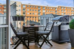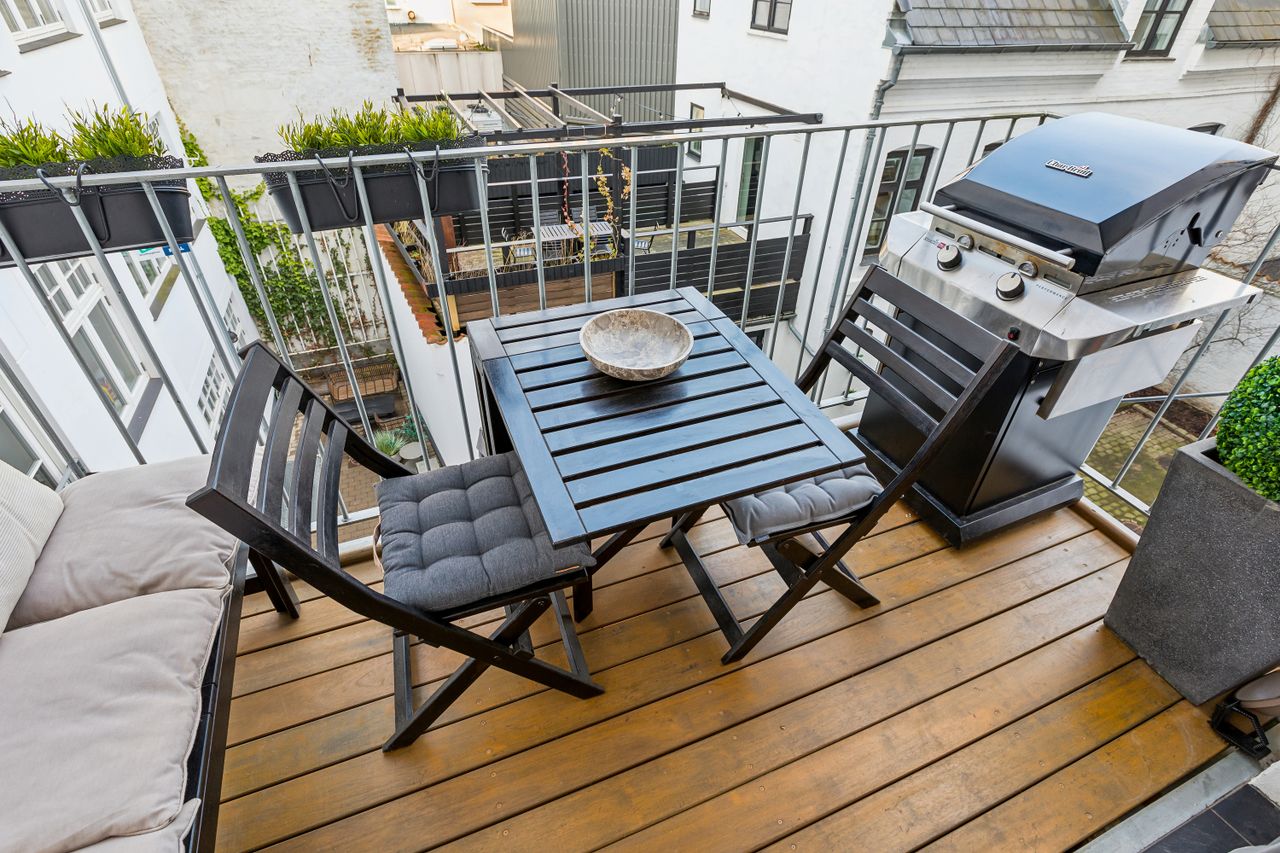 Lejligheden er placeret tilbagetrukket og ligger væk fra Store Kongensgade, så du kan sidde ude i ro og mag. Med et strømlinet gårdmiljø nedenfor er der også gode muligheder for cykelparkering, og derudover er der depotrum med direkte adgang via elevator.