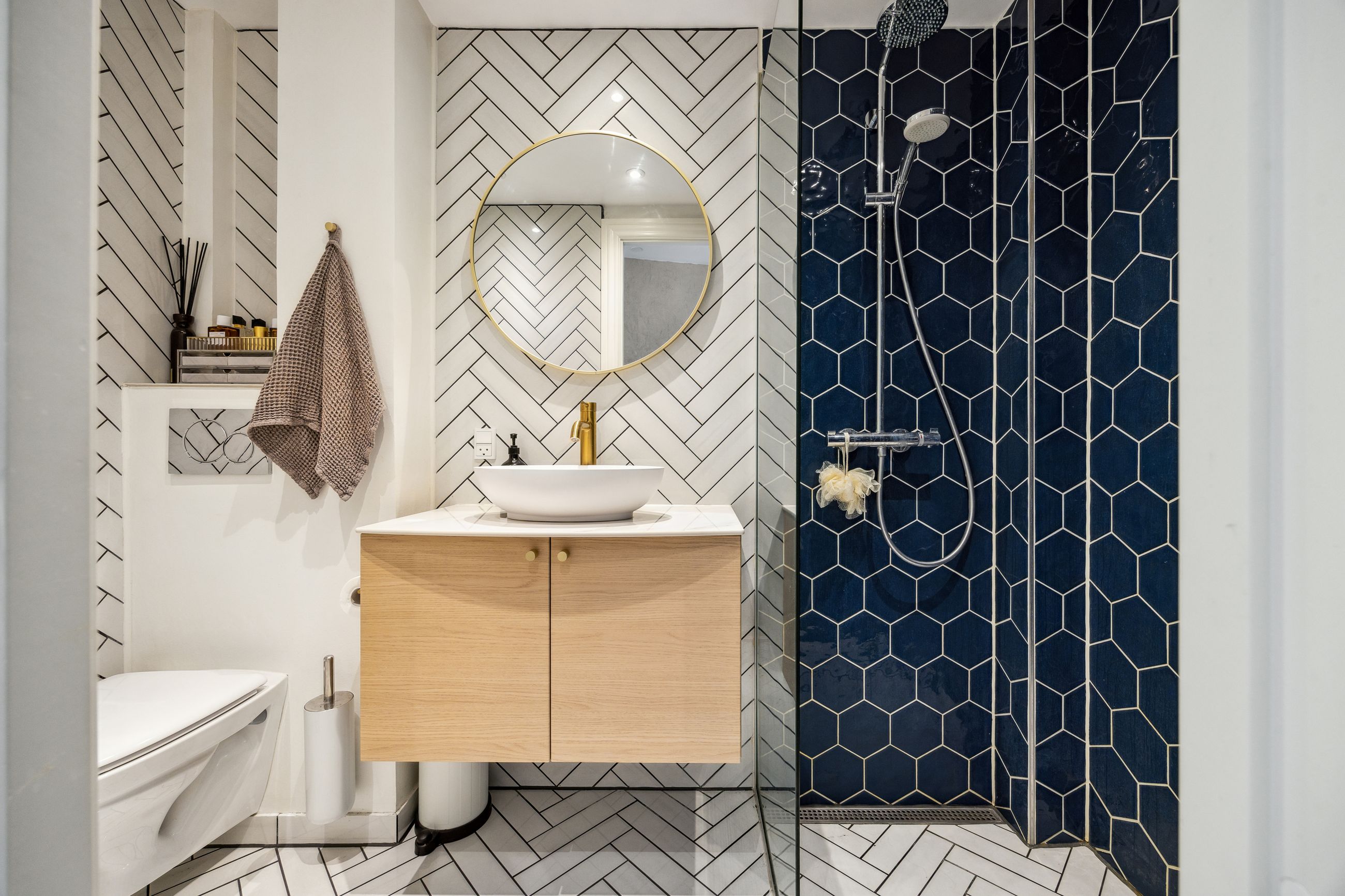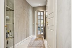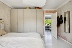 Fra stuen er der adgang til et stort soveværelse, som tilbyder rigeligt med plads til både seng og garderobeskab. Der er endda mulighed for at indrette skrivebord eller babyseng efter behov. En fordelingsgang fører dig videre til et top klasse badeværelse, som imponerer med flotte klinker lagt i sildebensmønster. Badeværelset har desuden separat bruseniche og væghængt toilet.
