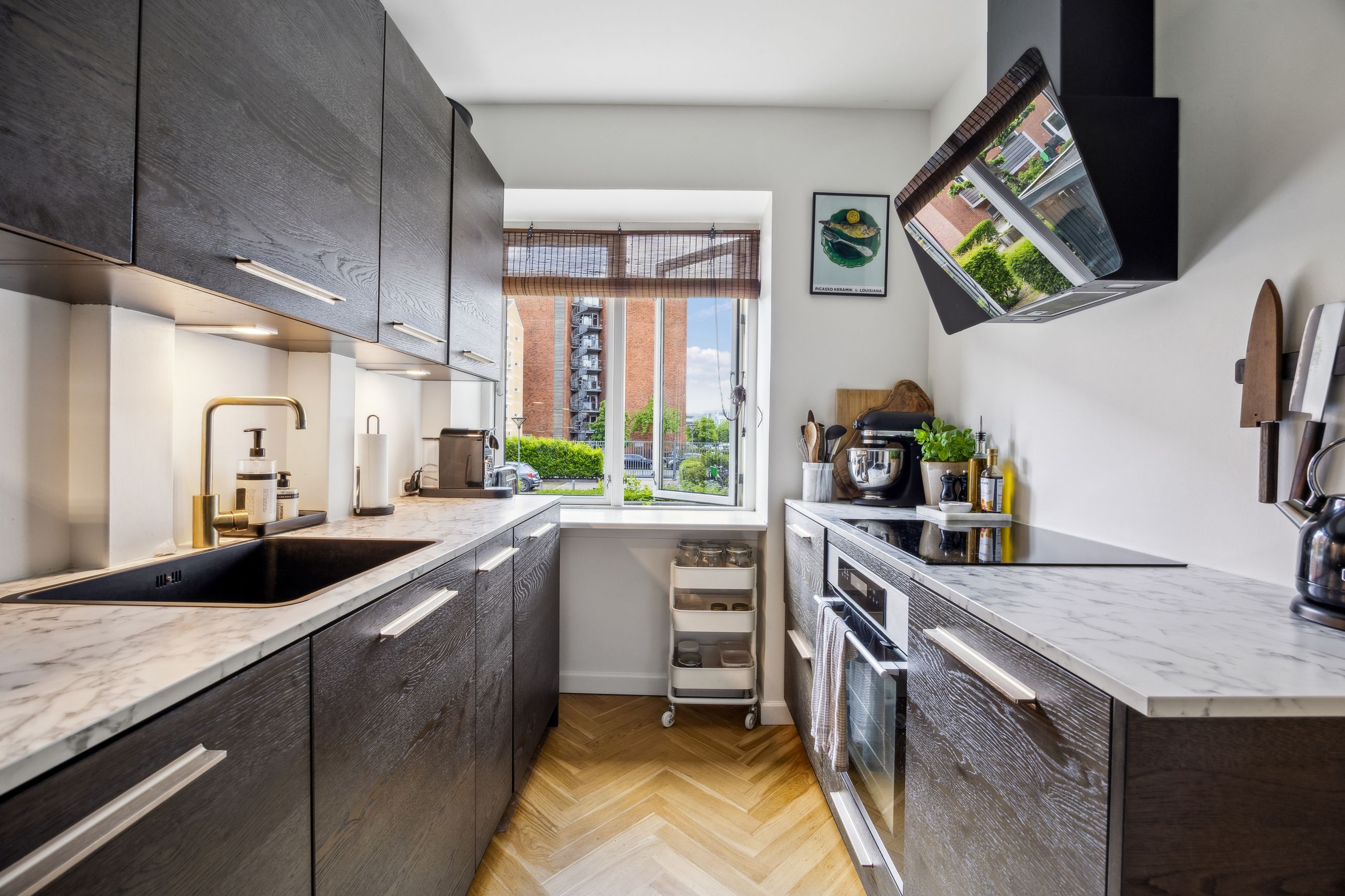 Køkkenet i lejligheden er prikken over i'et med alle nødvendige hvidevarer indbygget – herunder opvaskemaskine og vaskemaskine – så du slipper for besværet ved at skulle installere noget selv. Lejligheden fremstår generelt i flot stand og er helt klar til indflytning uden behov for renovering eller forbedringer.