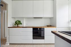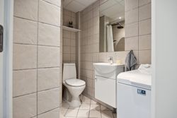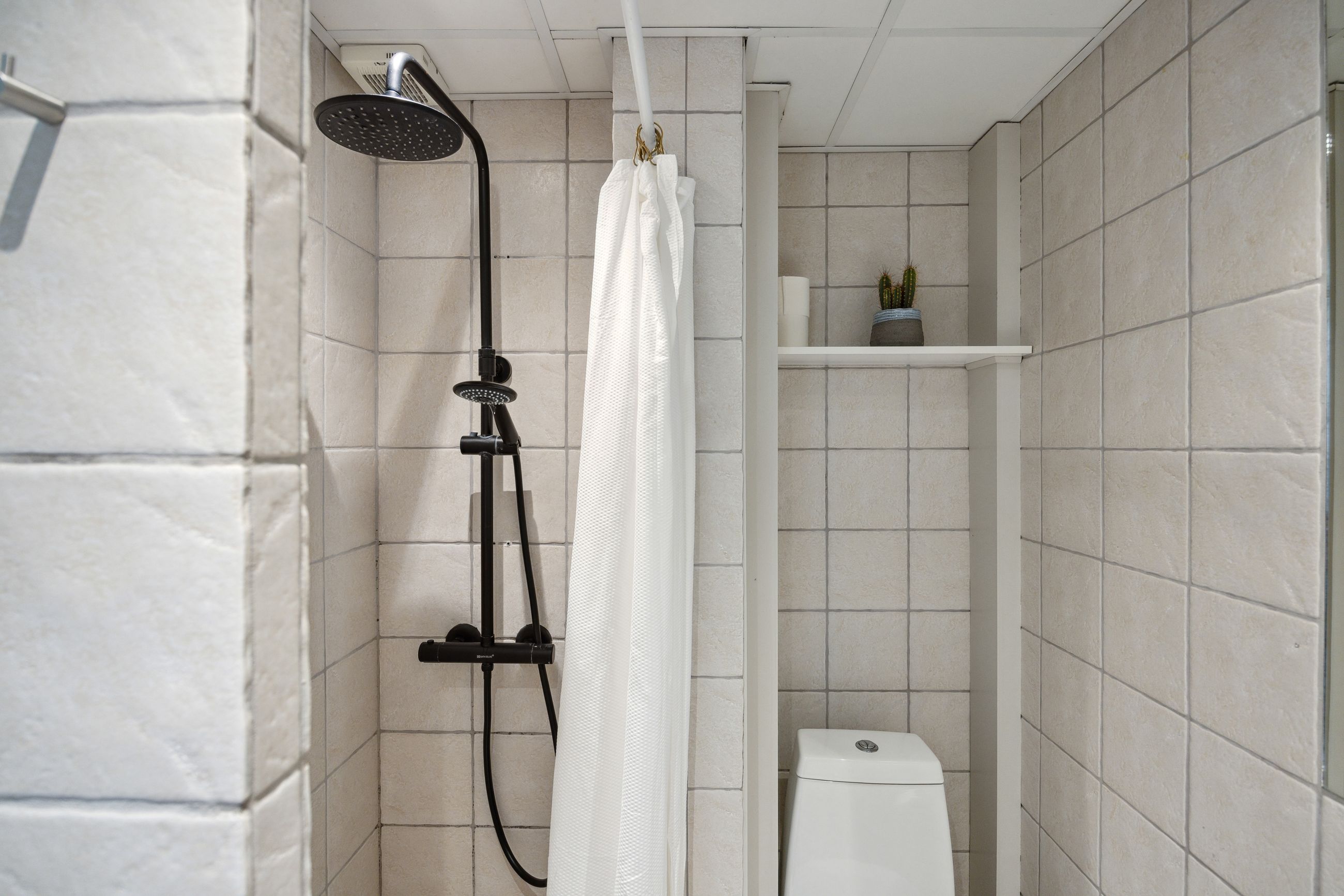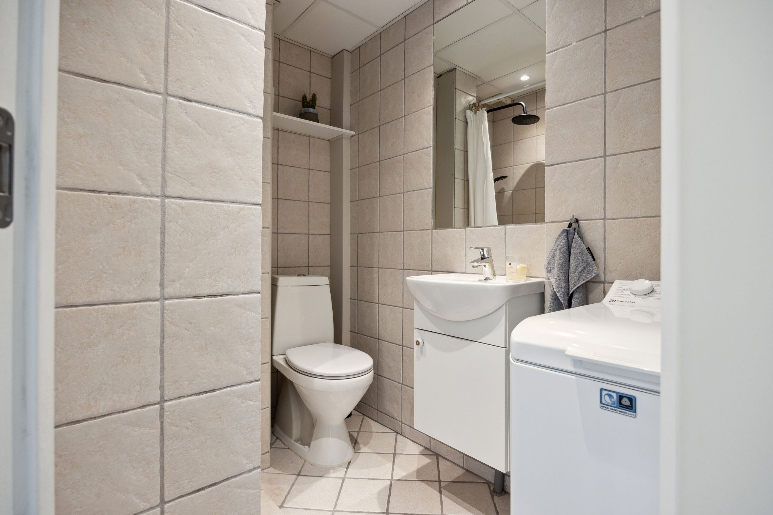 Køkkenet er holdt i flotte hvide elementer, som skaber et stilrent udtryk. Her er god plads til madlavning samt opbevaring, hvilket gør det nemt at holde orden. Badeværelset er stort og funktionelt indrettet med separat bruseniche – ideelt for dem, der ønsker både komfort og praktiske løsninger.