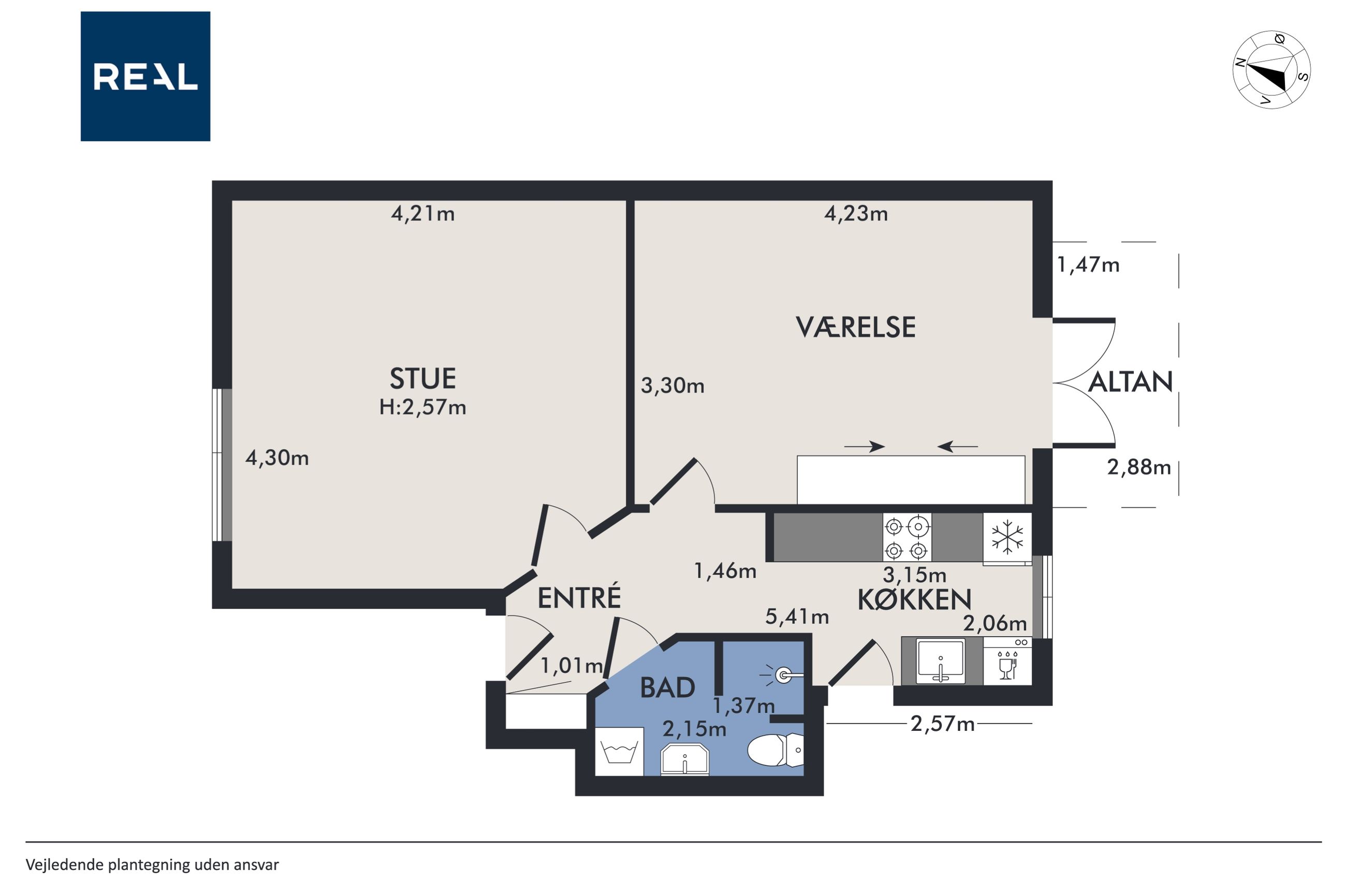 Lejligheden byder på en rummelig stue, hvor der er rig mulighed for at skabe et hyggeligt opholdsområde til afslapning eller samvær med venner og familie. Fra soveværelset er der direkte adgang til en sydvendt altan, hvor du kan nyde morgenkaffen eller solens stråler i løbet af dagen.