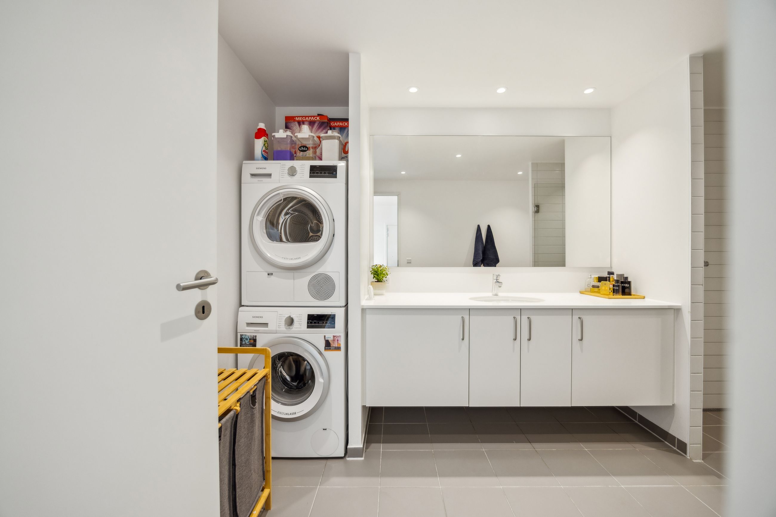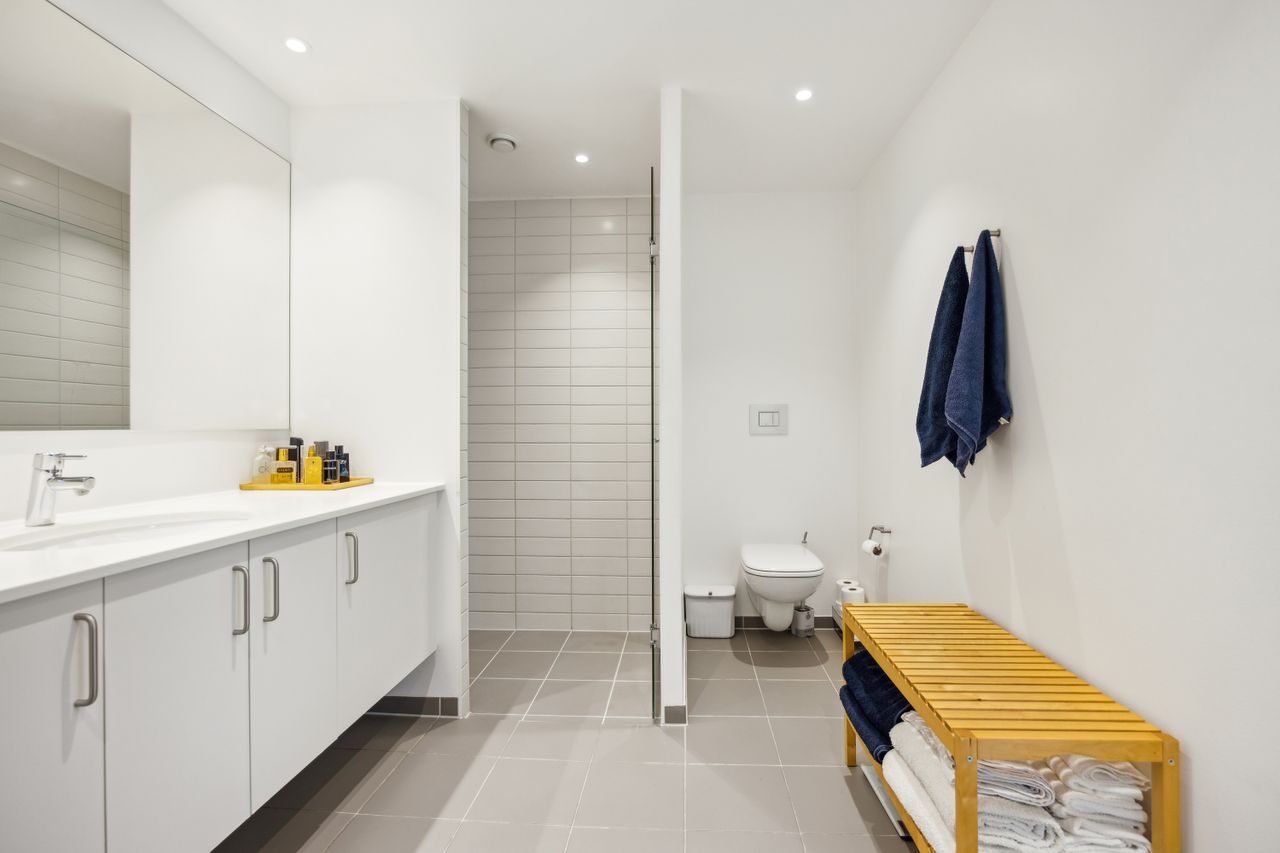 Lejlighedens badeværelse er stort med vaskesøjle, væghængt toilet, rummeligt bruserum samt masser af bordplads og et kæmpe spejl - altså er der plads til morgentrafikken, når familien skal gøre sig klar.