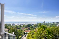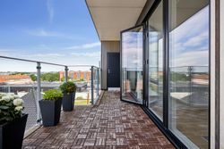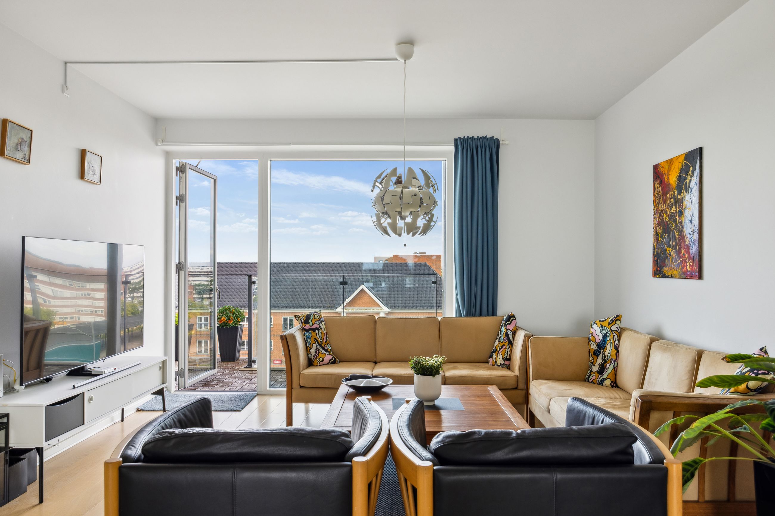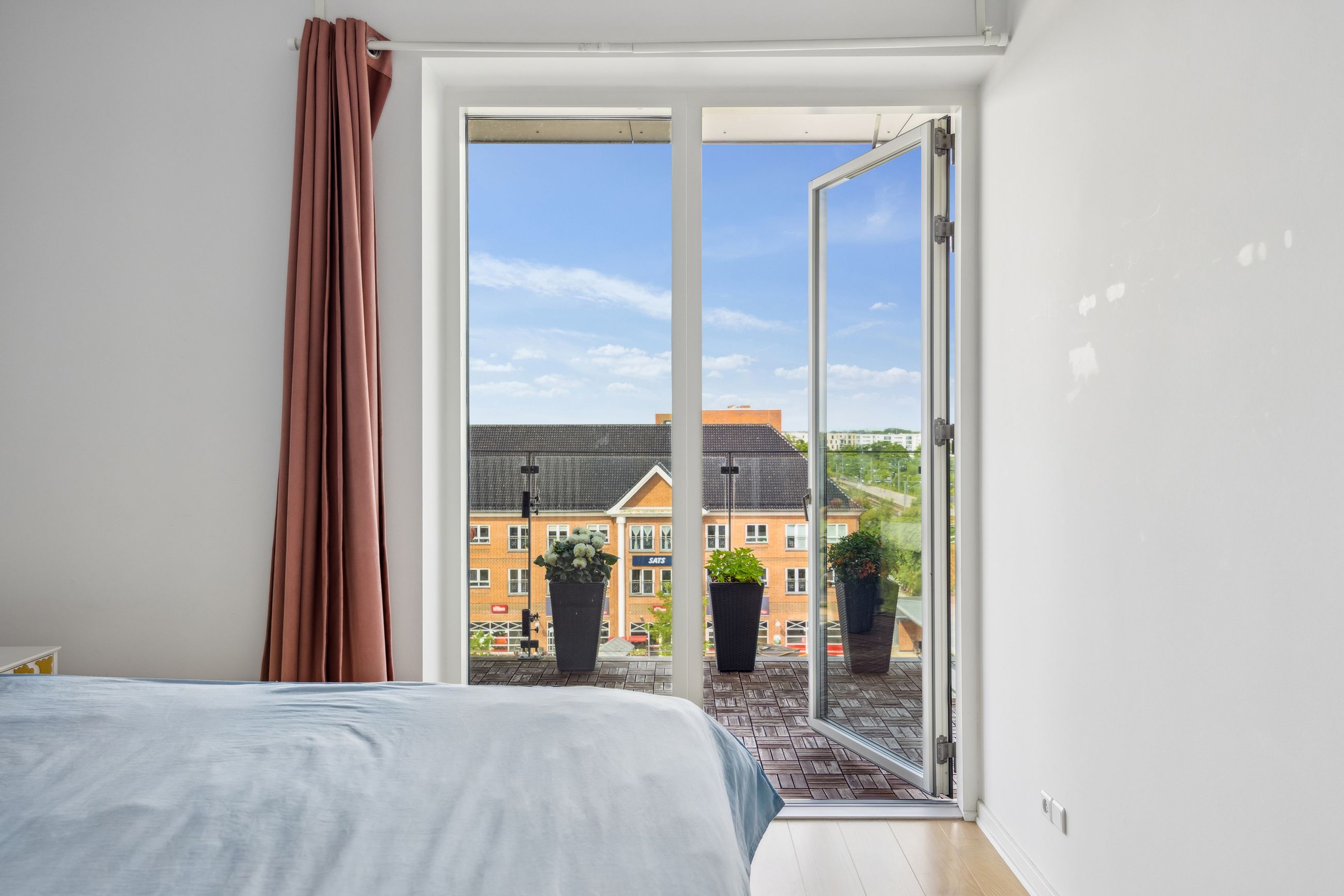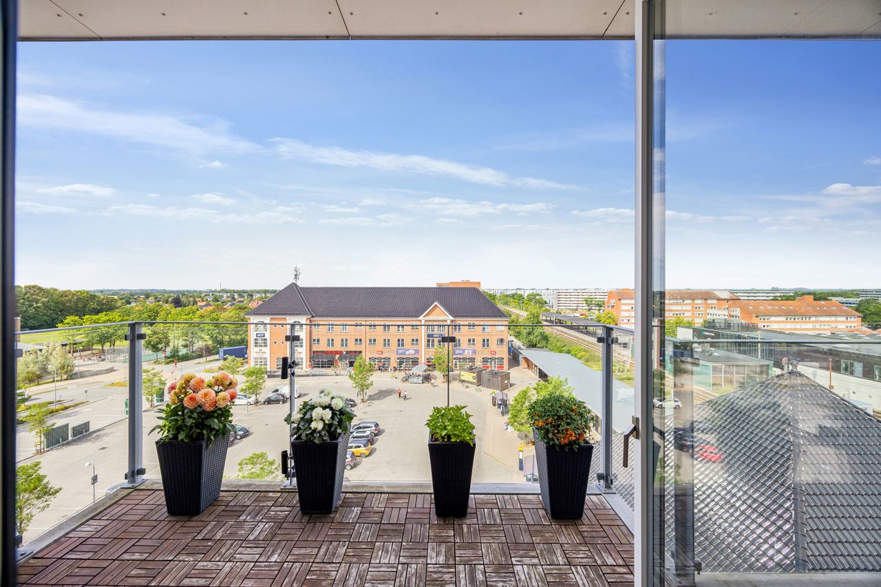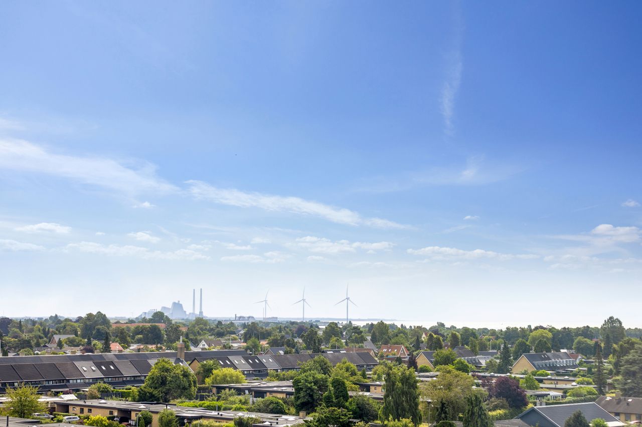 En af de unikke egenskaber ved lejlighedens planløsning er, at du både fra stuen og det store soveværelse kan træde ud til lejlighedens helt egen altanterrasse, der peger stik vest og derfor giver sol fra formiddag til solnedgang. Herude finder du også lejlighedens helt eget skur. Fra altanterrassen har du direkte udsigt til blå himmel og sågar udsigt til Vallensbæk Havn samt det smukke Øresund.