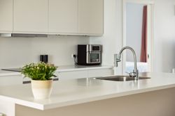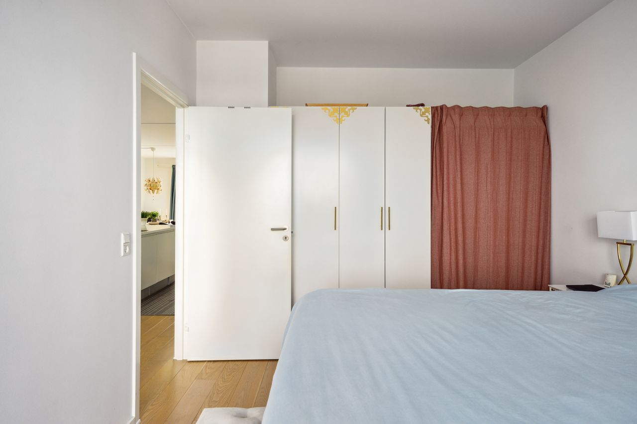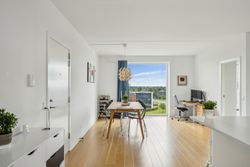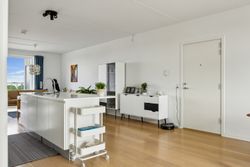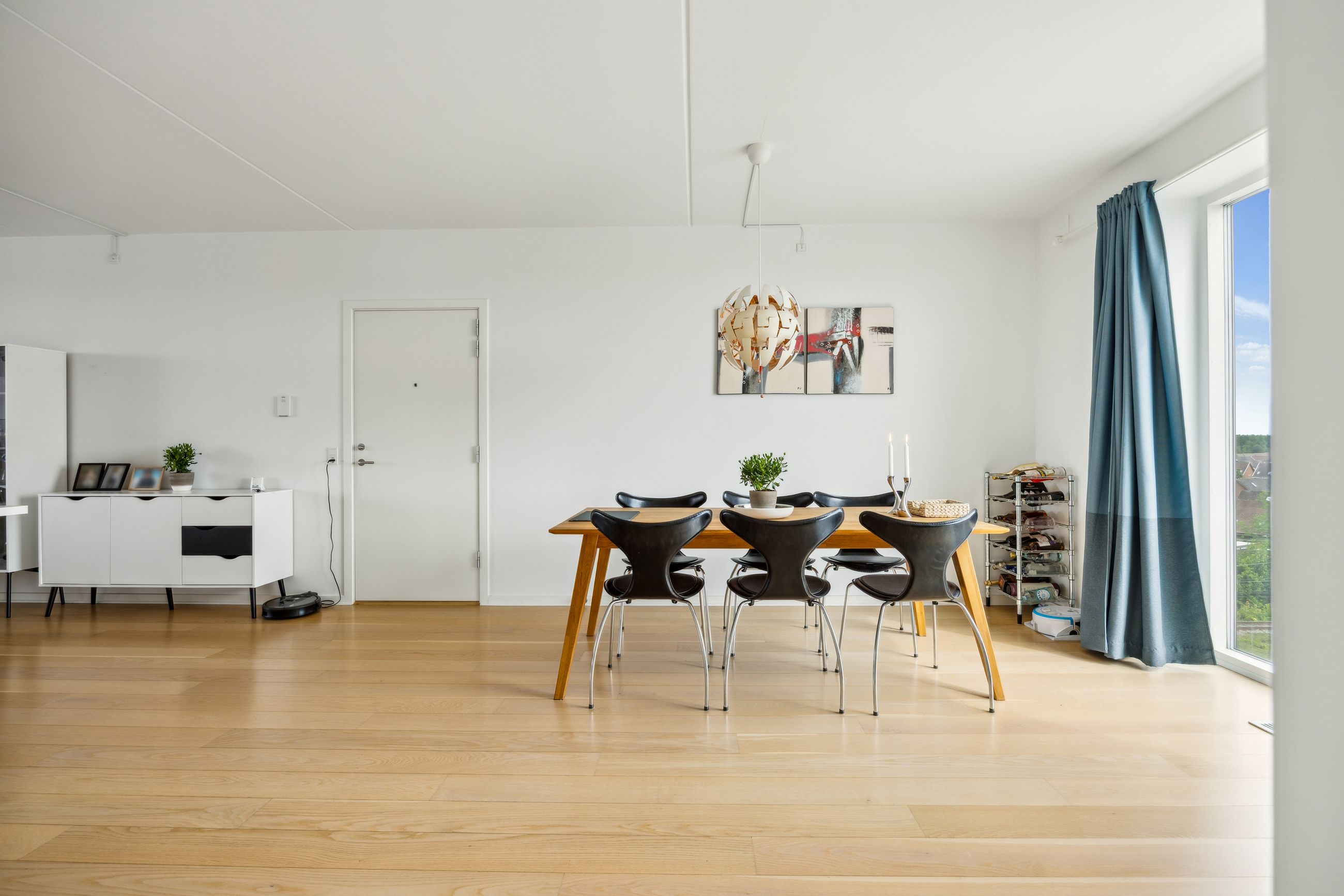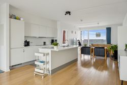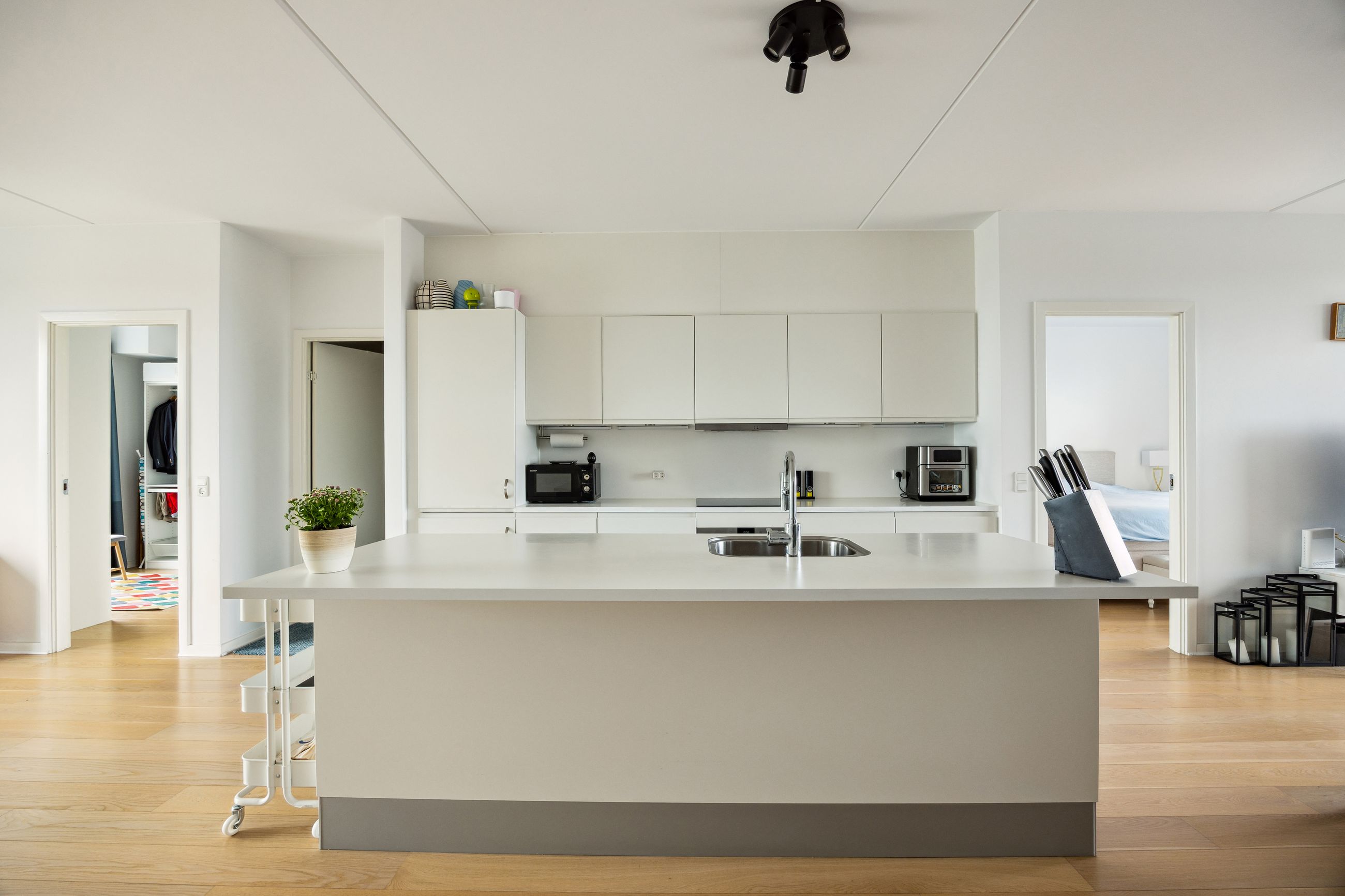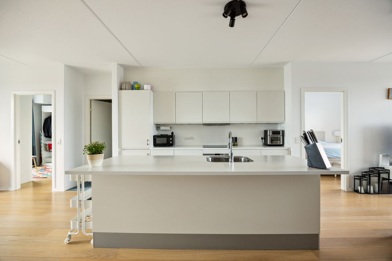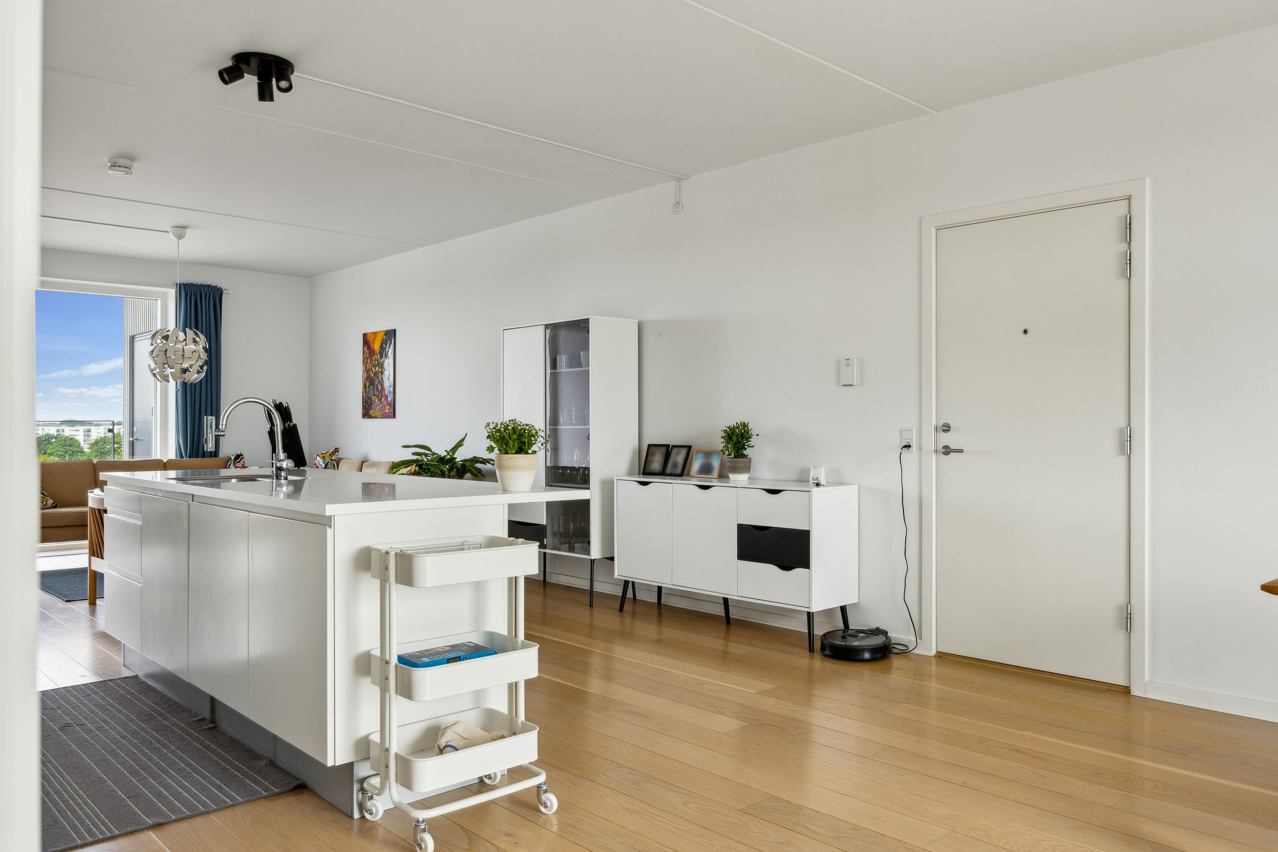 Lejligheden du i dag skal se byder på 2 rummelige soveværelser og en stor stue i forlængelse af køkken og en fantastisk spisestue. Den åbne forbindelse i opholdsrummet skaber en helt særlig atmosfære, der er indbydende og lægger op til hyggeligt samvær med gæster og familie. Ligeledes er det også praktisk, at man har flere miljøer i samme rum. Køkkenet er lækkert, minimalistisk og praktisk med rigtig gode opbevaringsmuligheder samt en køkkenø med siddeplads til at byde gæster velkommen til en kop kaffe. Materialet er leveret fra HTH og her er bl.a. indbyggede hvidevarer, stikkontakter i væggene og masser af bordplads. Selvfølgelig byder køkkenet også på indbygget opvaskemaskine og køle-/fryseskab.