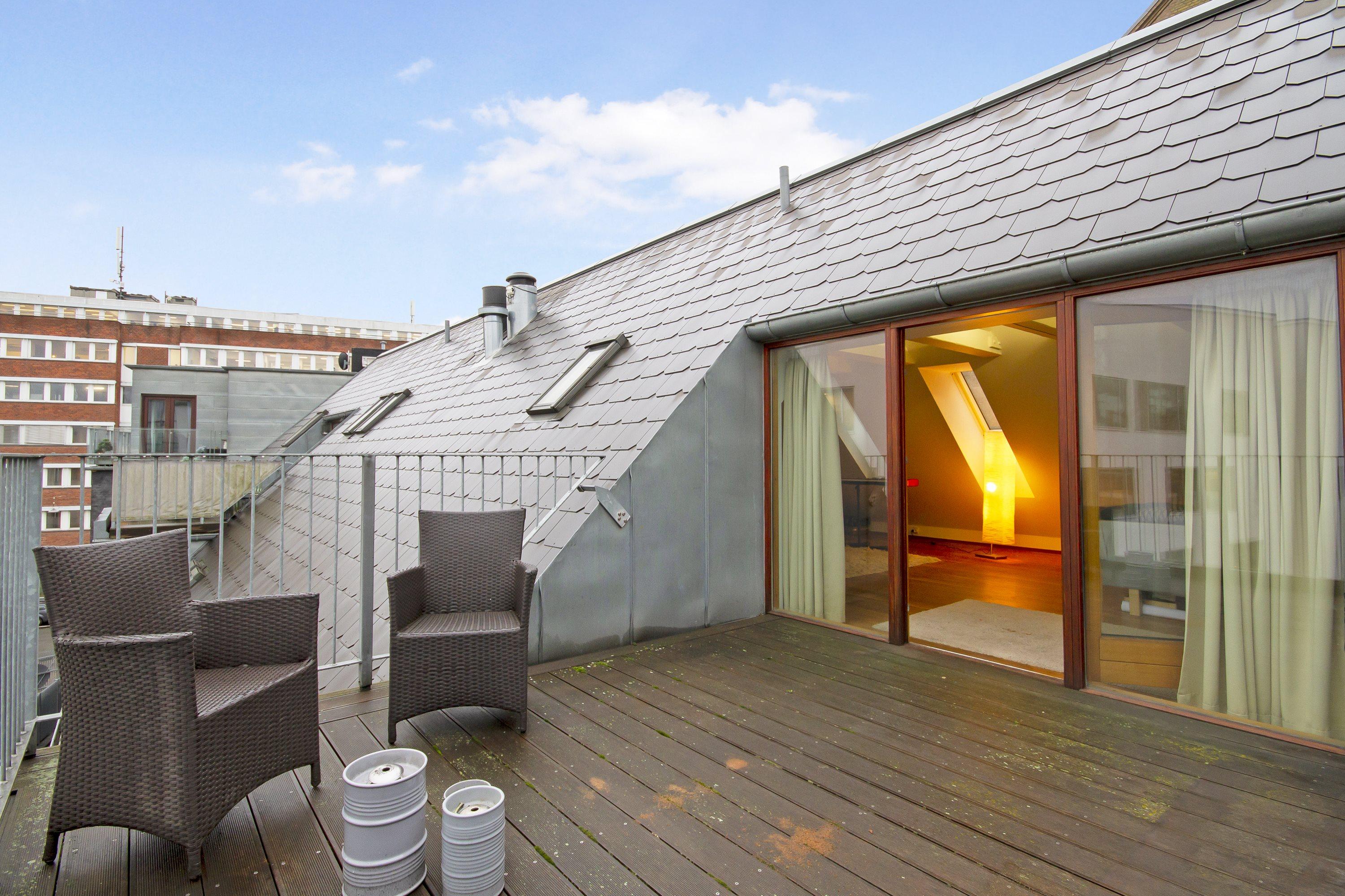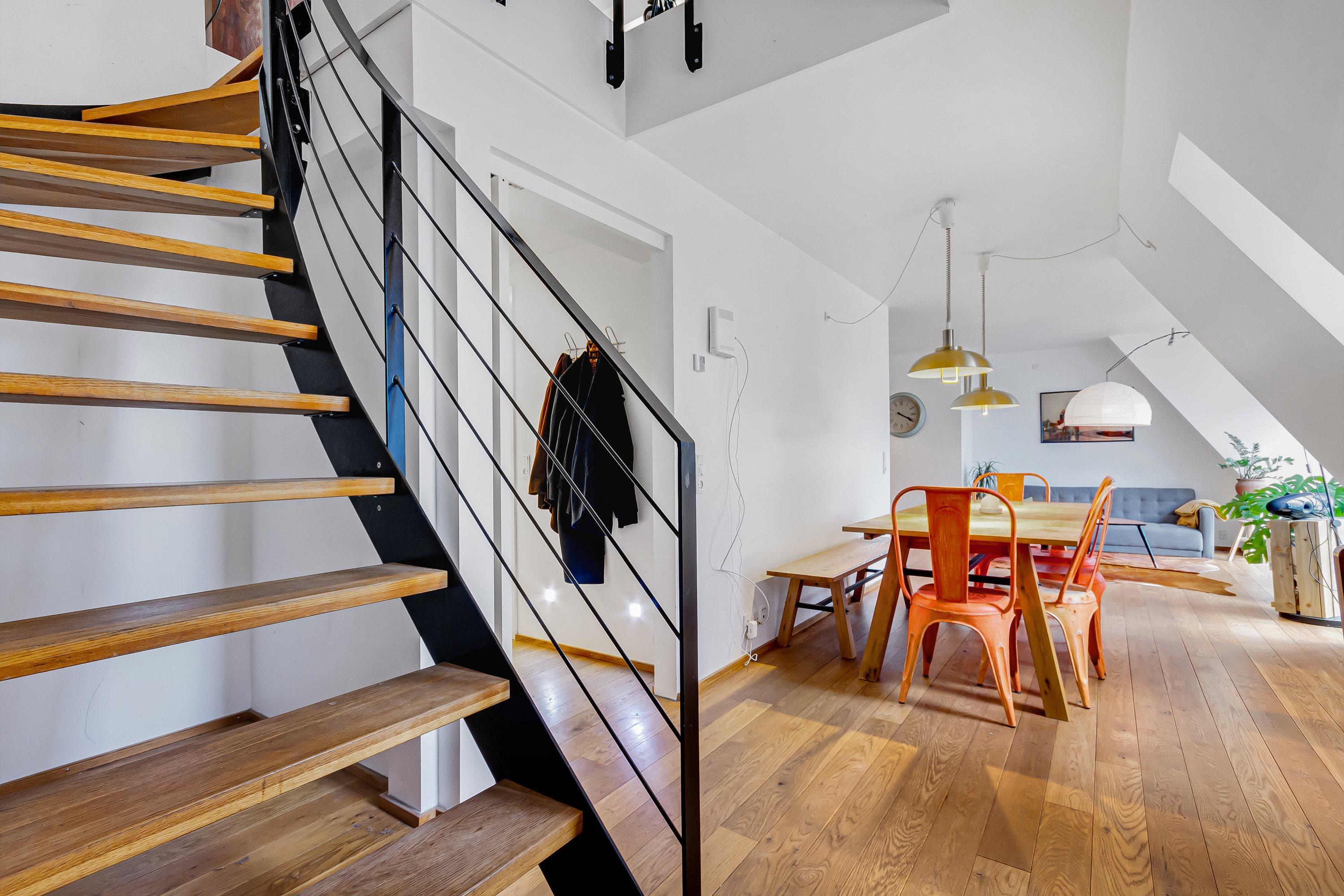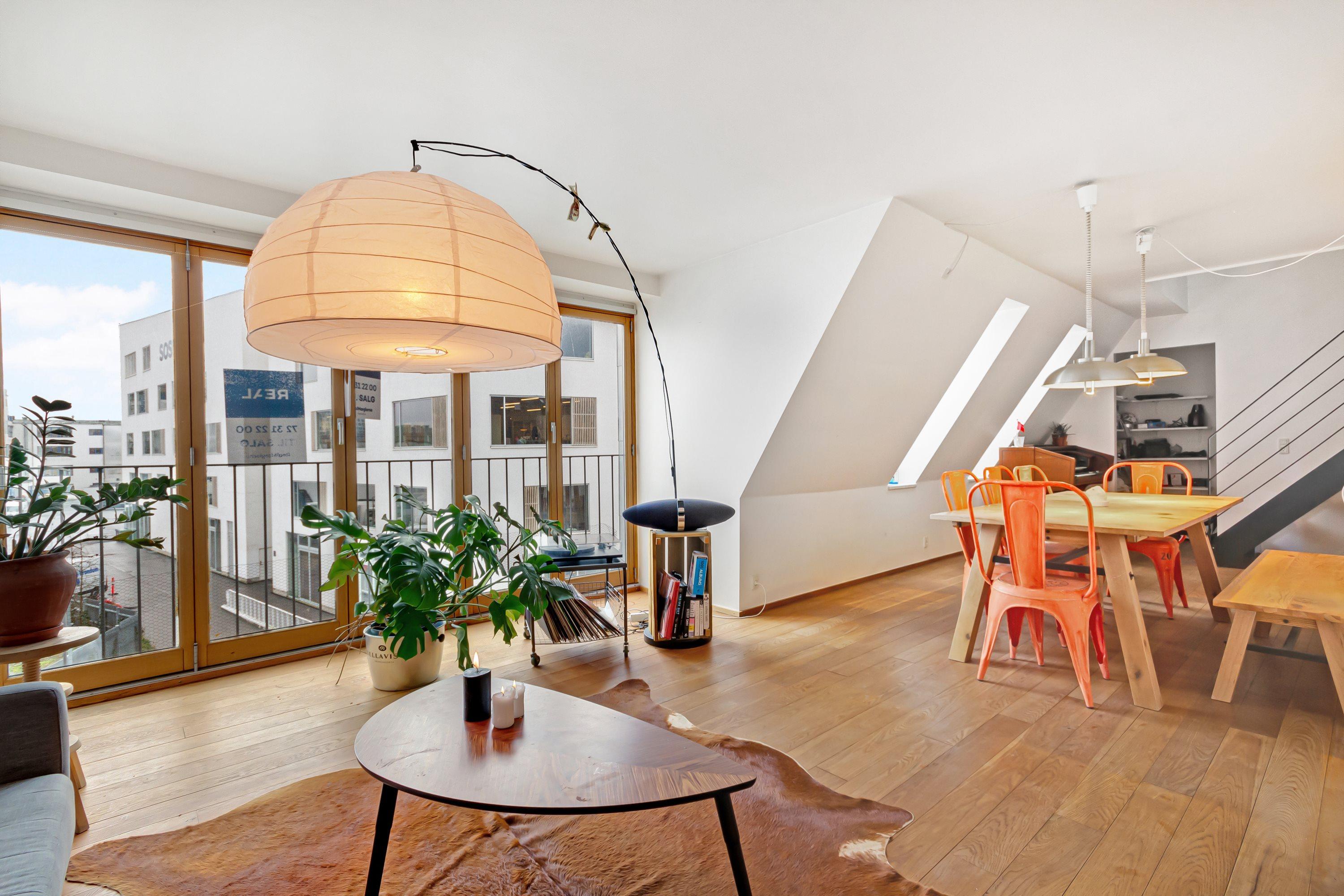 to etager! Lejligheden rummer 153 m2 med en åben planløsning og en absolut enestående privat tagterrasse. Du træder indenfor i en rummelig entré, hvorfra du har adgang til det eksklusive badeværelse,.. Læs mere...