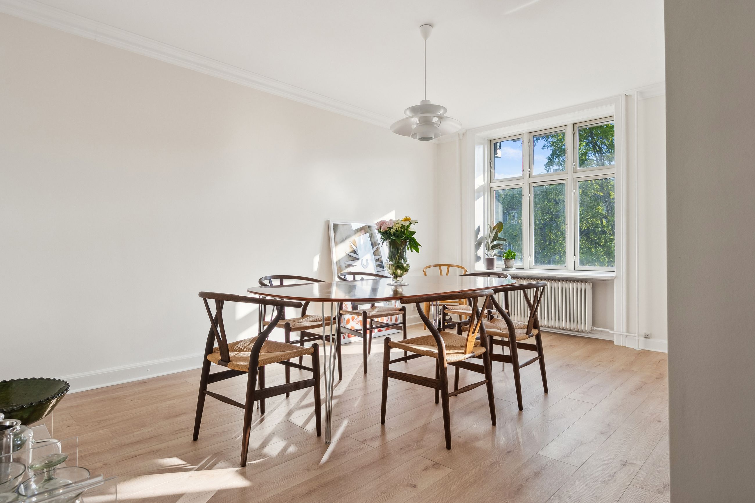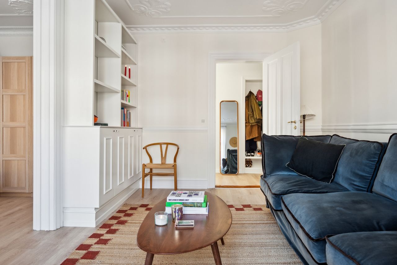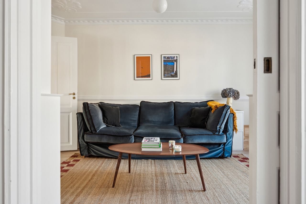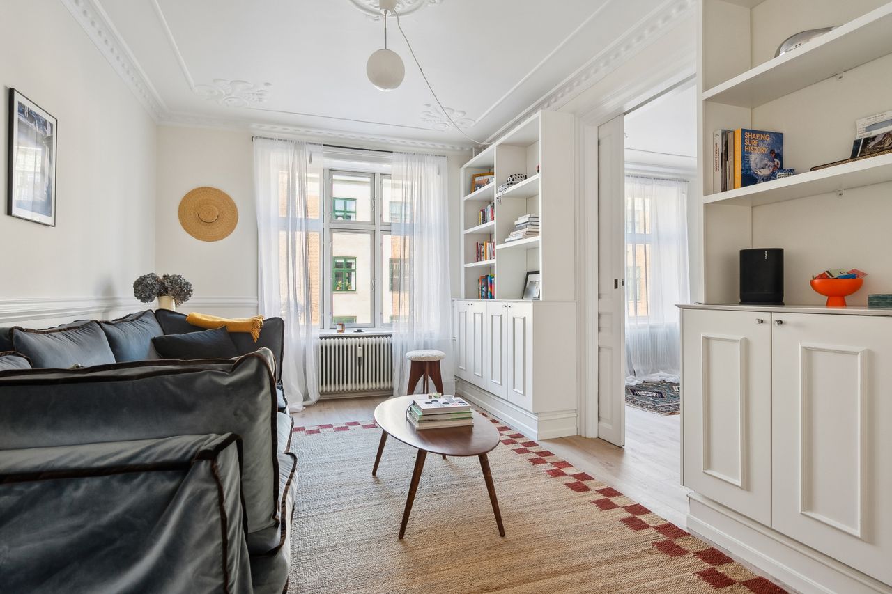 Her mødes du af smukke, originale detaljer og en indretning, der kombinerer klassisk elegance med moderne komfort. Fra entréen er der adgang til to herskabelige stuer en suite samt et indbydende køkken-alrum, hvilket skaber en skøn, åben rumfornemmelse. Stuerne er rige på atmosfære og kendetegnes ved klassiske stuk- og rosetdetaljer, der understreger boligens historiske charme. De to stuer kan enten bruges som opholdsstue og værelse – eller som to separate soveværelser, afhængigt af behov.