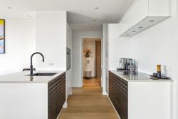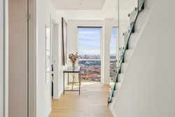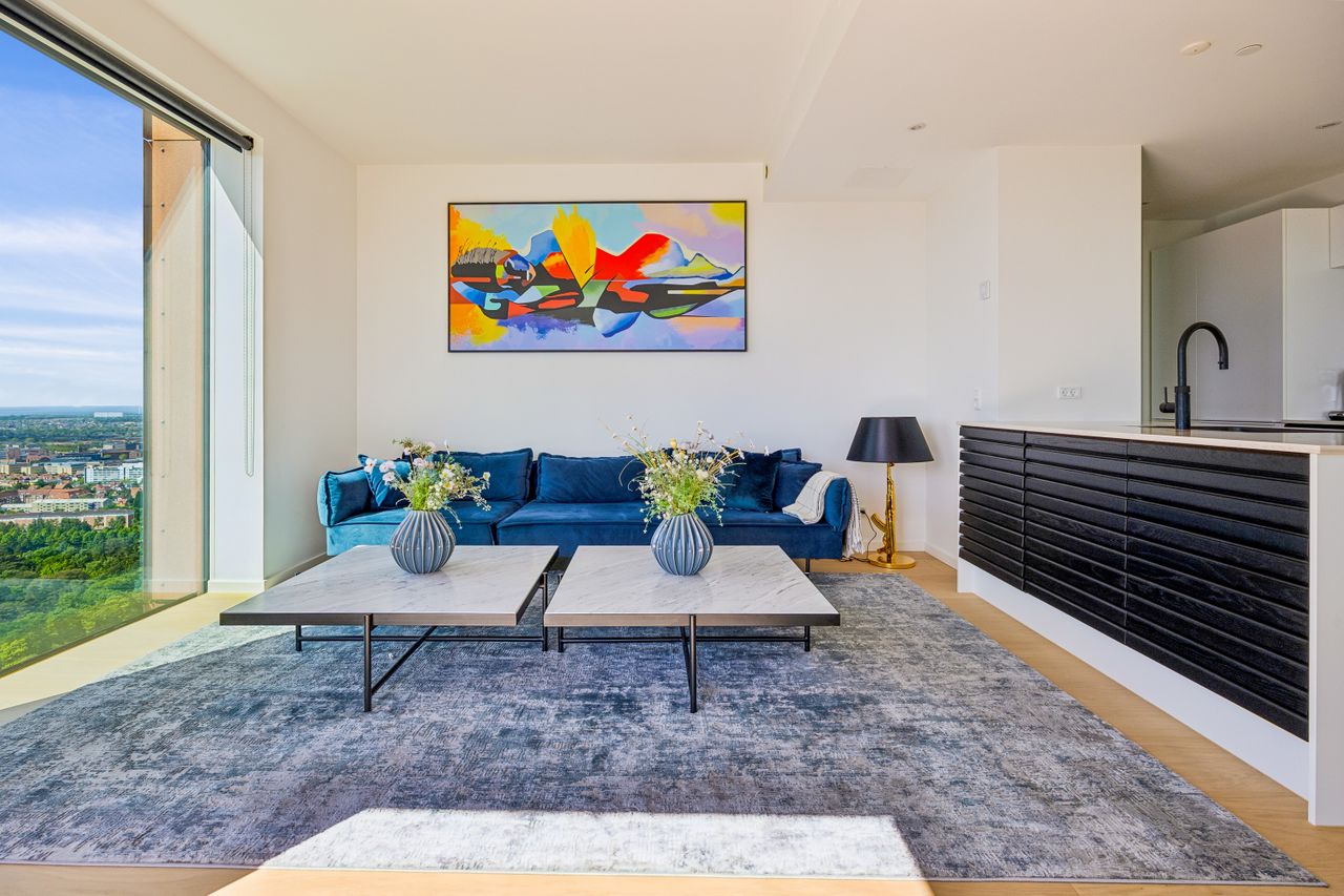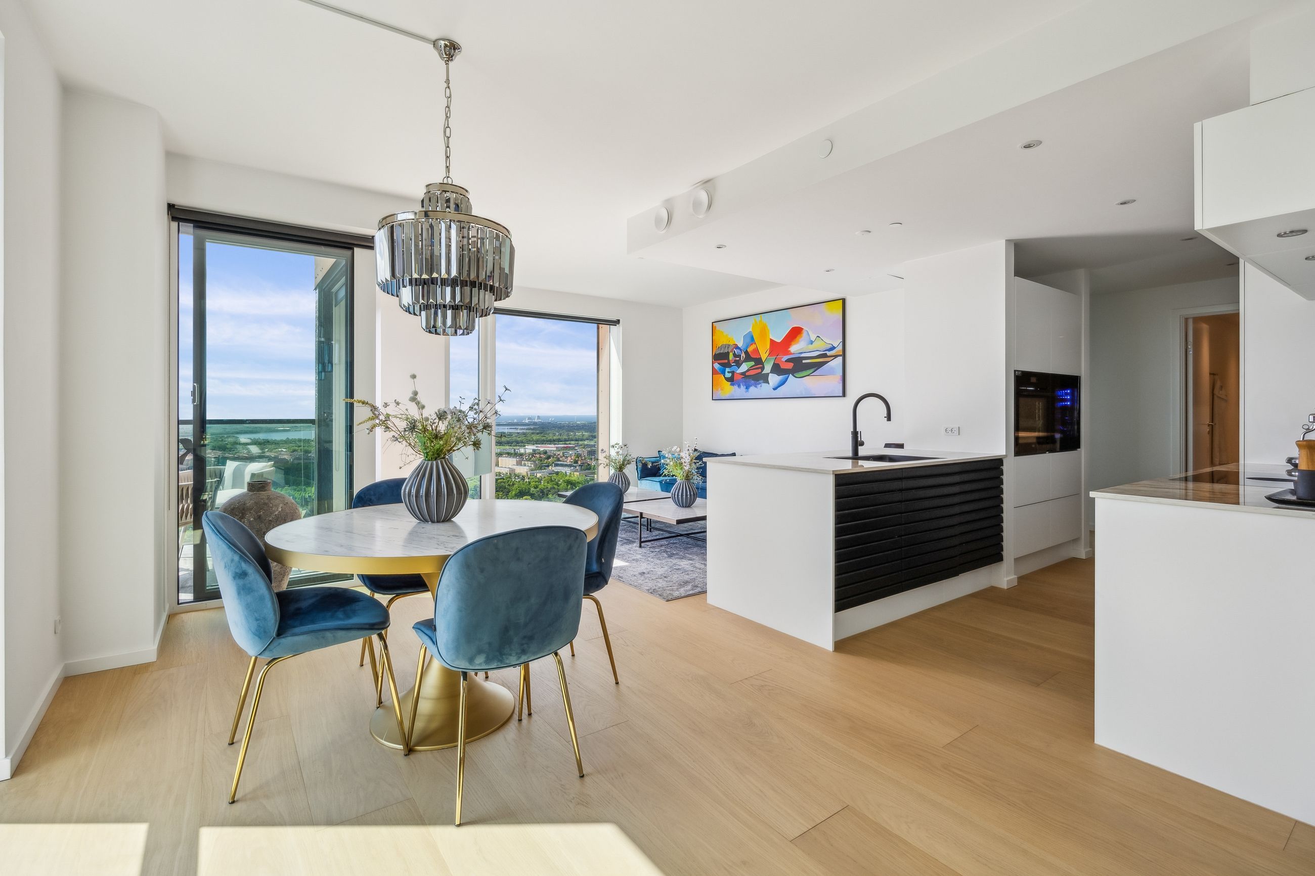 Lejligheden på 145 kvadratmeter byder på tre værelser, et køkkenalrum og to badeværelser – masser af plads til et luksuriøst liv. Det hele er lyst og stilrent, næsten som om du svæver mellem himmel og jord. Og når du har brug for bilen, går elevatoren direkte ned til parkeringskælderen, hvor en parkeringsplads står klar til leje.