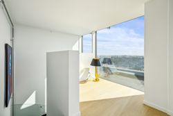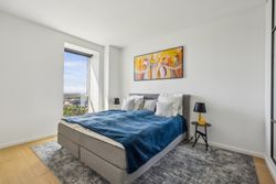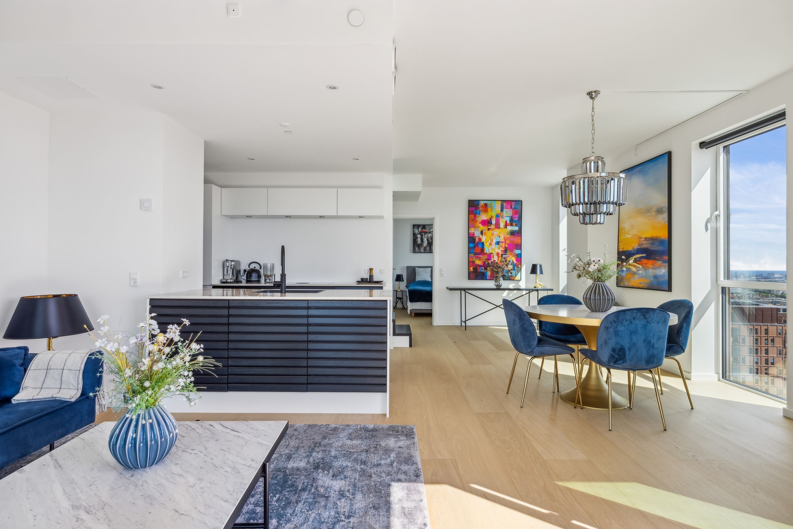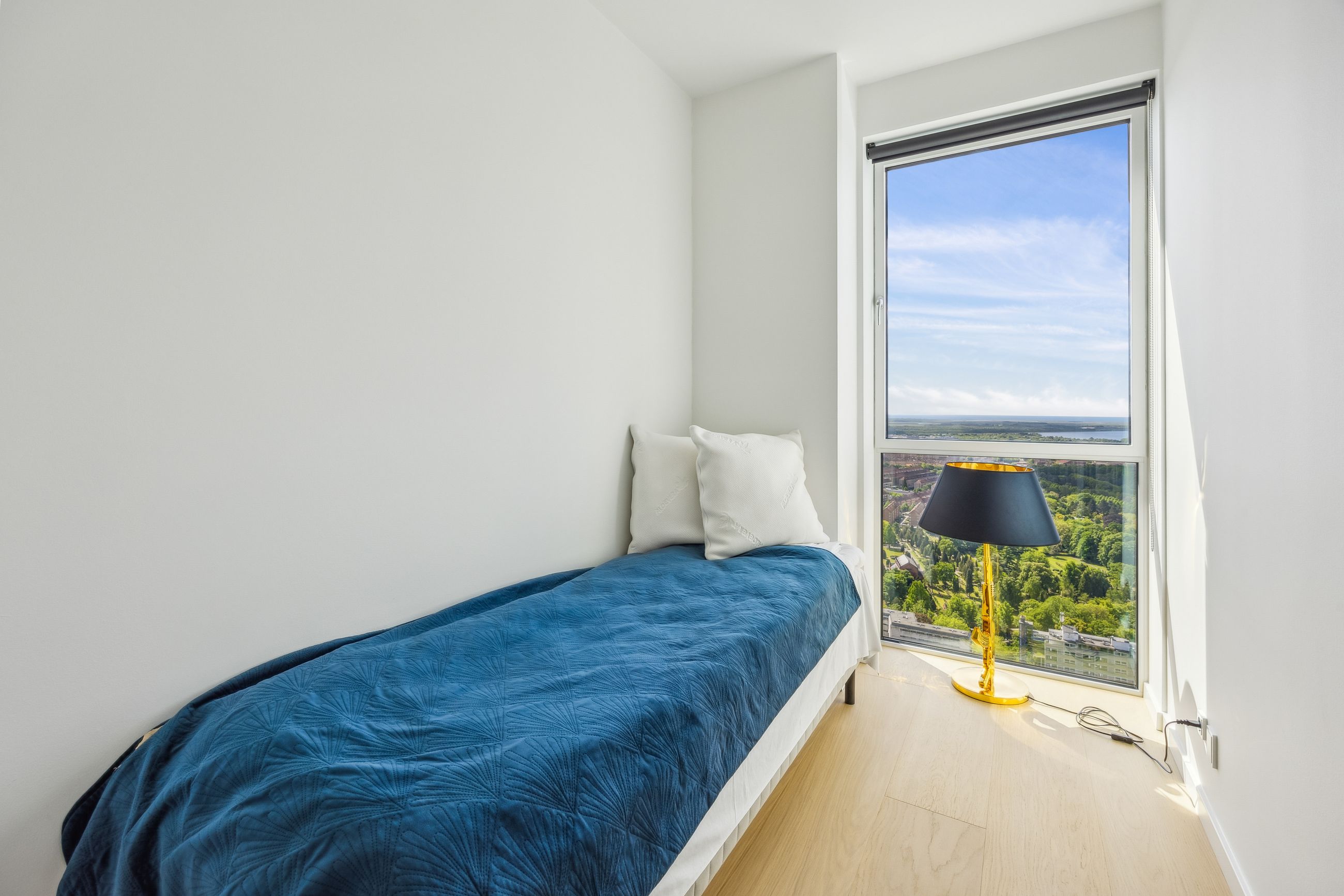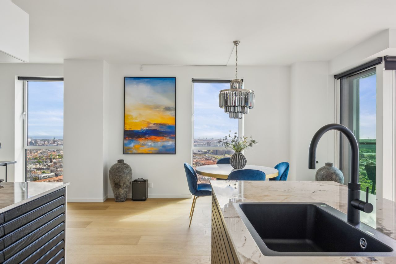 Lejligheden er også i topklasse, når det gælder materialer og rummelighed. Med både altan og en stor tagterrasse får du mulighed for at nyde solskinnet og den imponerende udsigt fra alle vinkler. Selvom du er oppe på 37. etage, er der næsten ingen vind på tagterrassen, så du kan slappe af og nyde roen uden besvær.