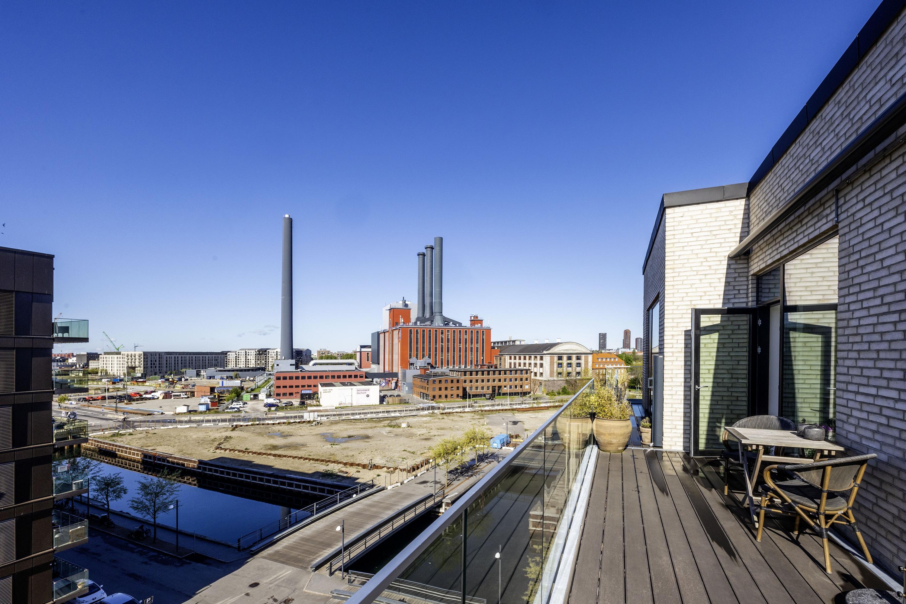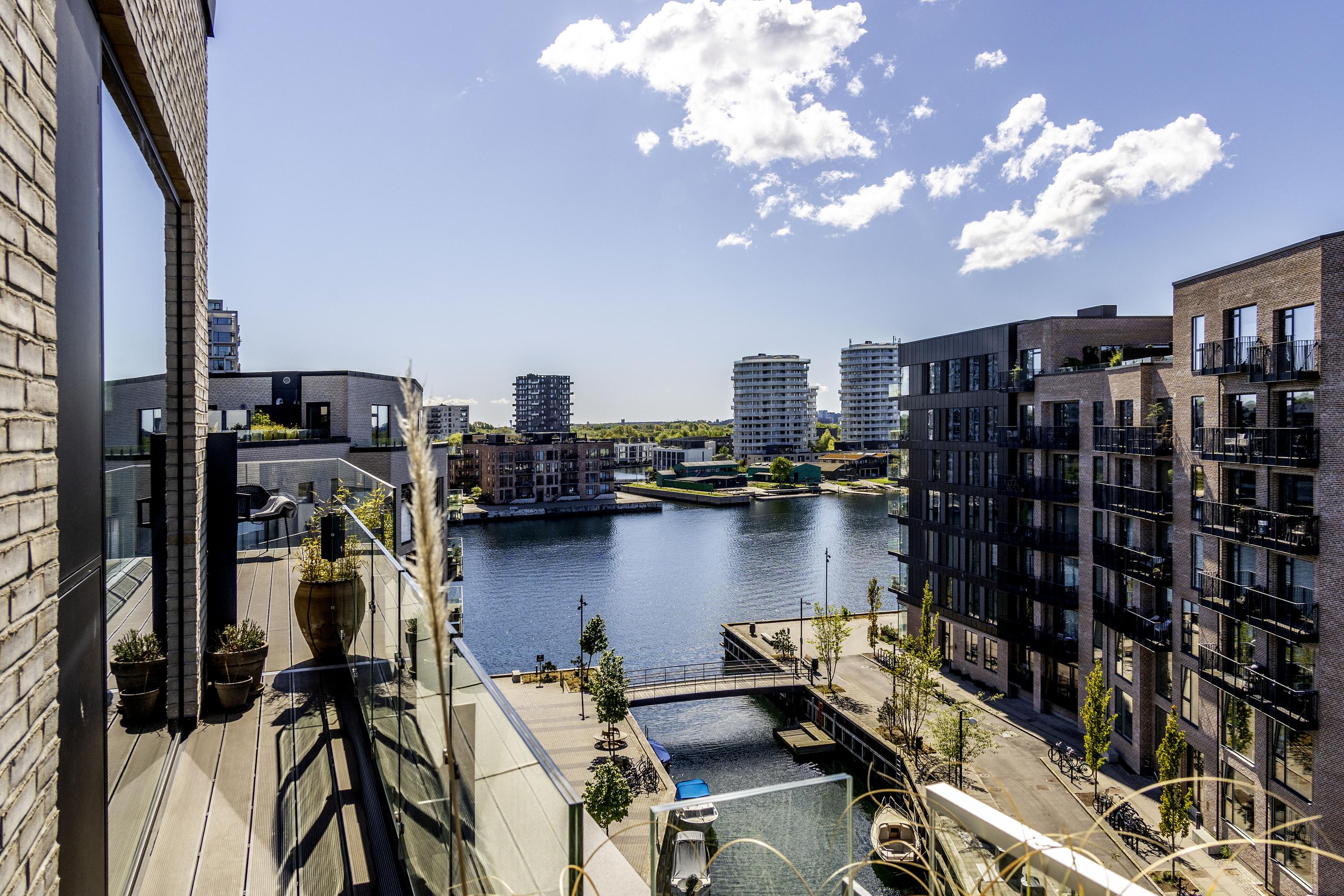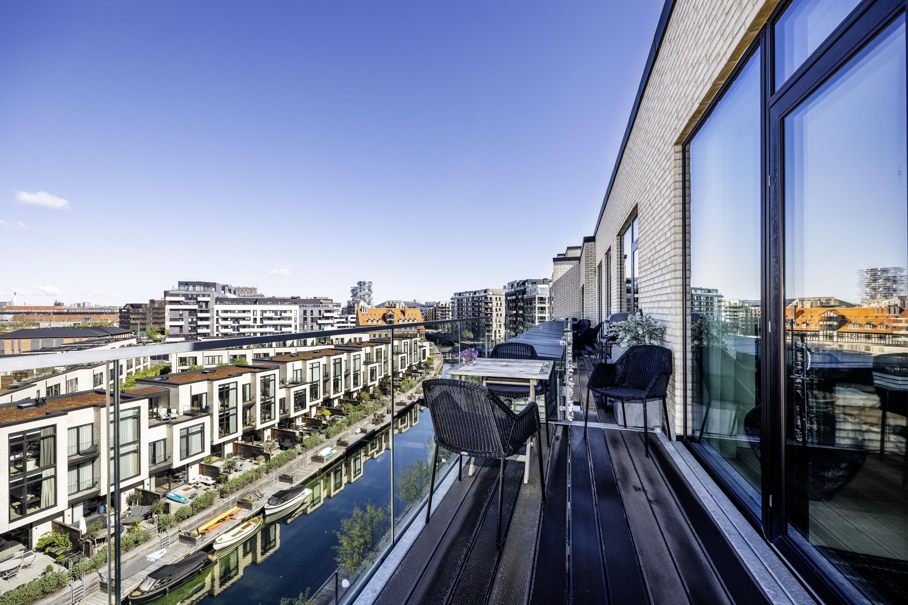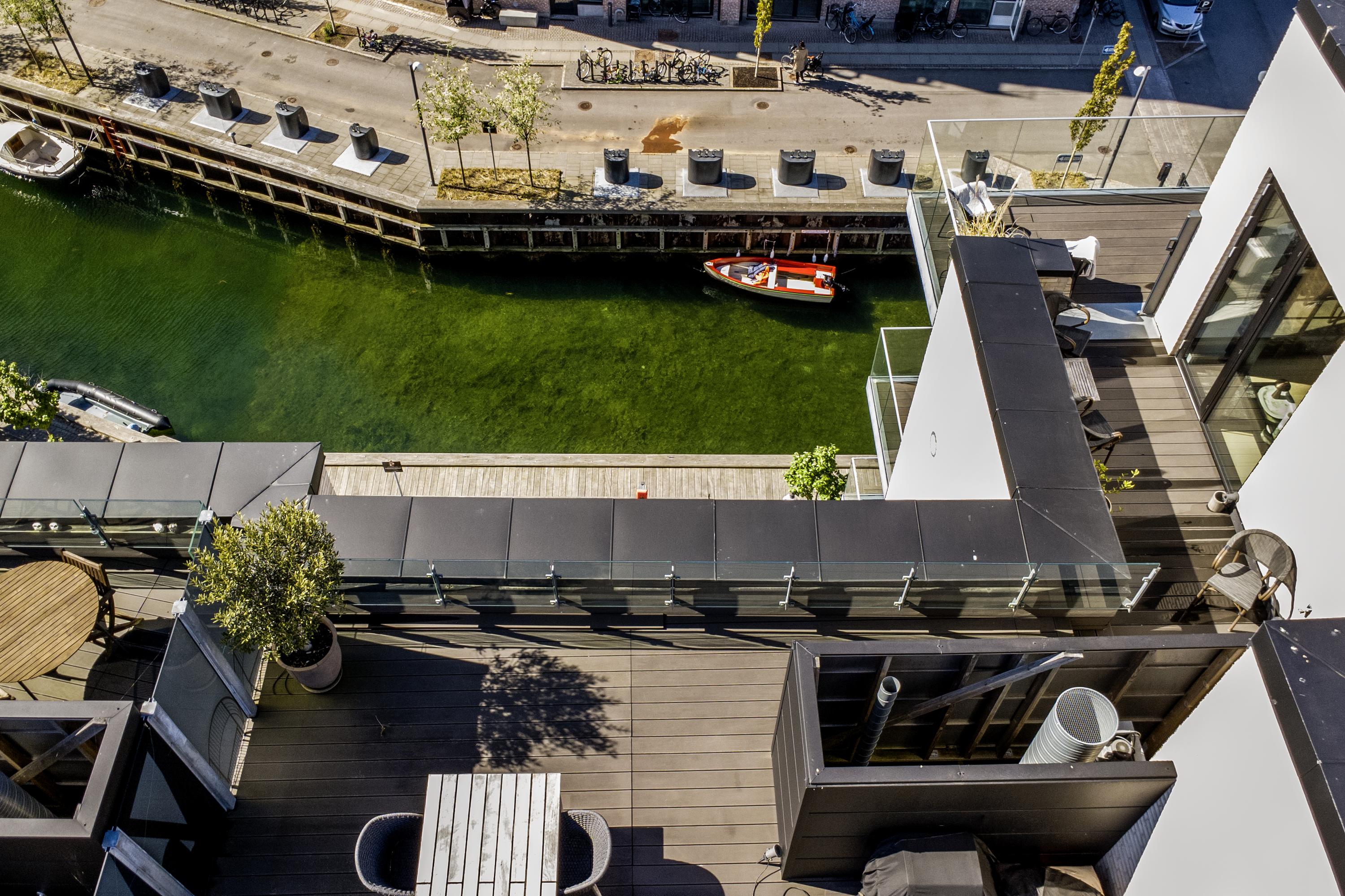 Velkommen til penthouse-lejligheden på 5. sal en eksklusiv boligoplevelse, hvor æstetik, komfort og udsigt smelter sammen i ét. Denne unikke hjørnelejlighed imponerer med sin omfattende tagterrasse, samt altan der omkranser hele boligen og giver dig 360 graders udsigt over kanalerne, byens