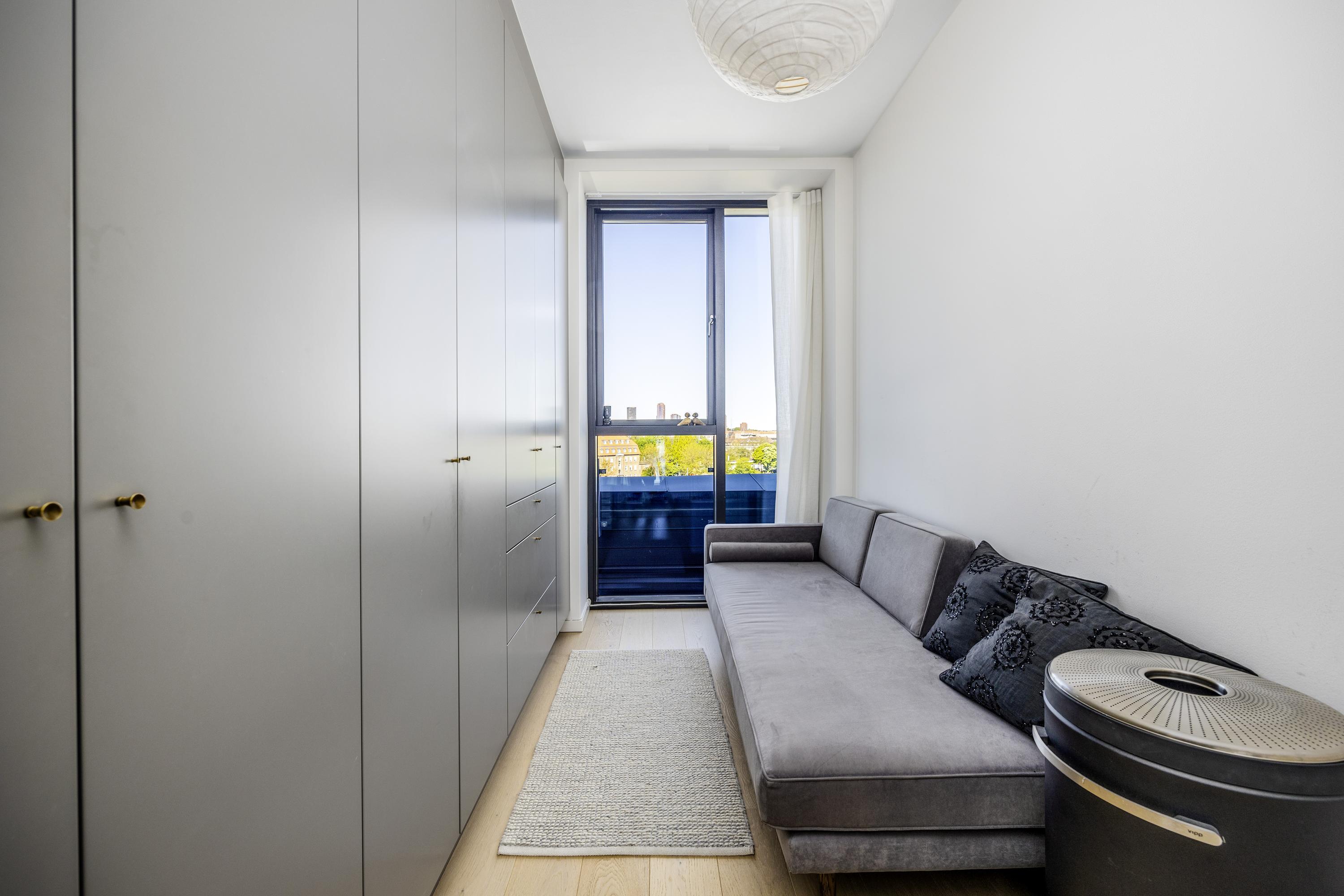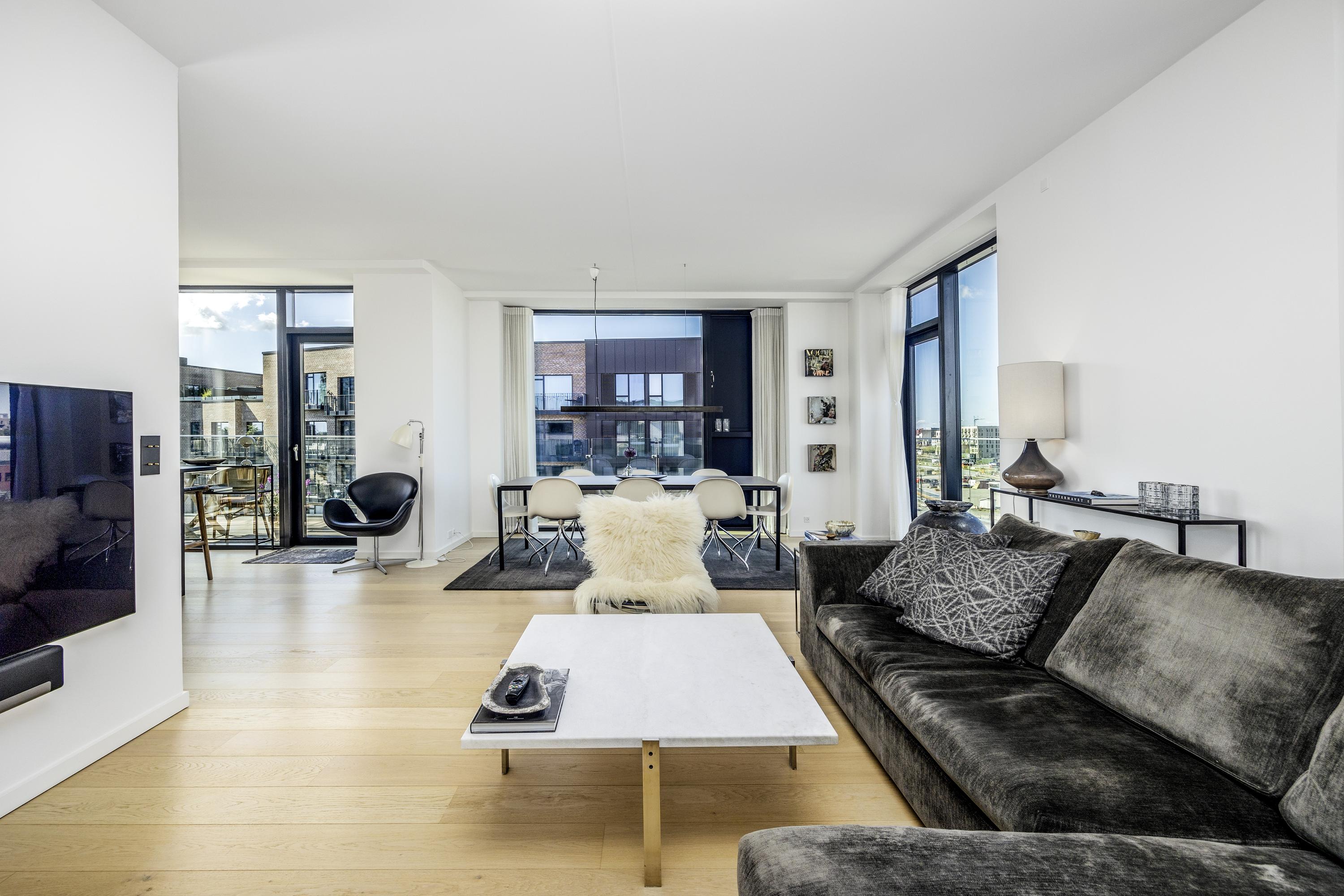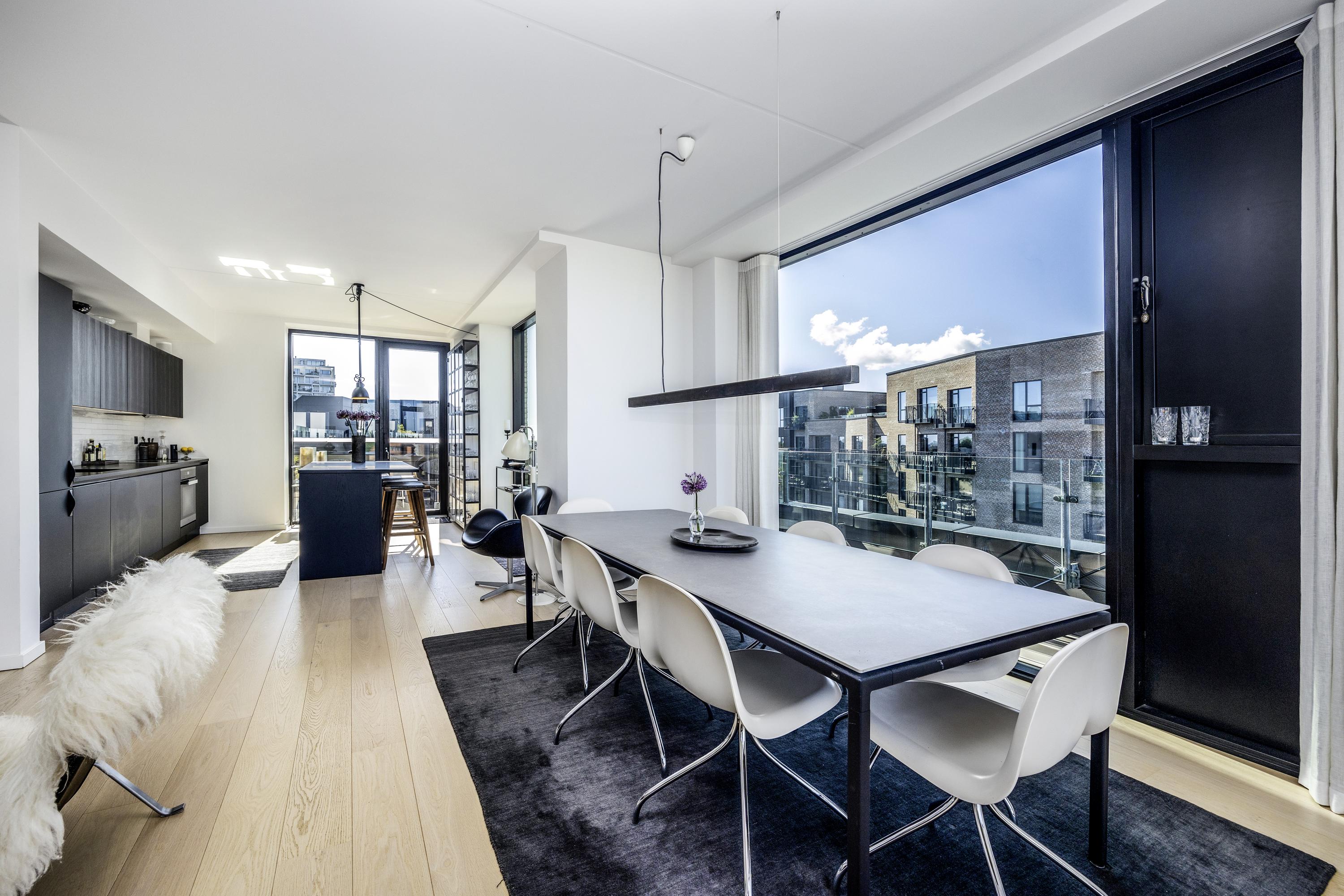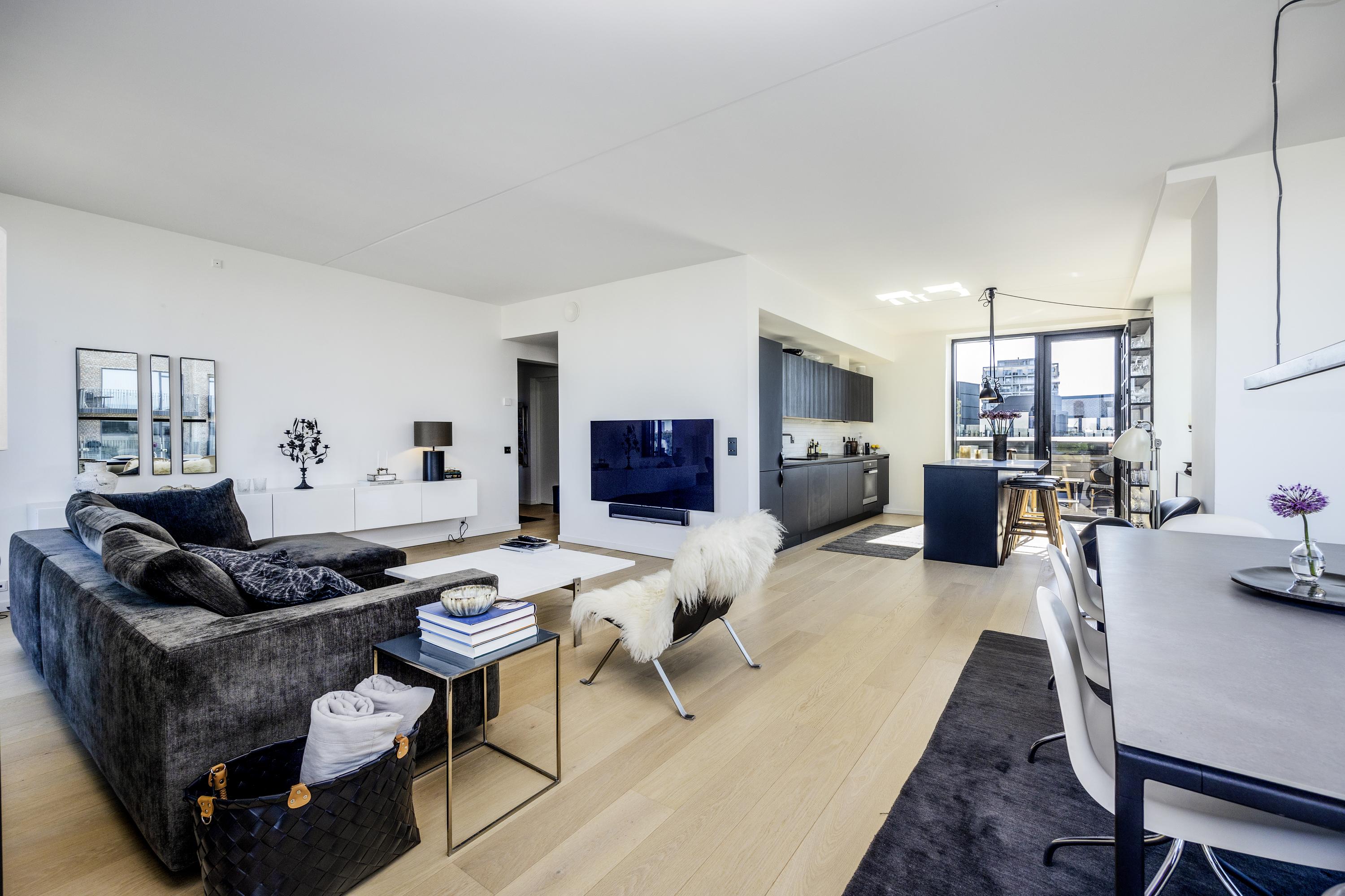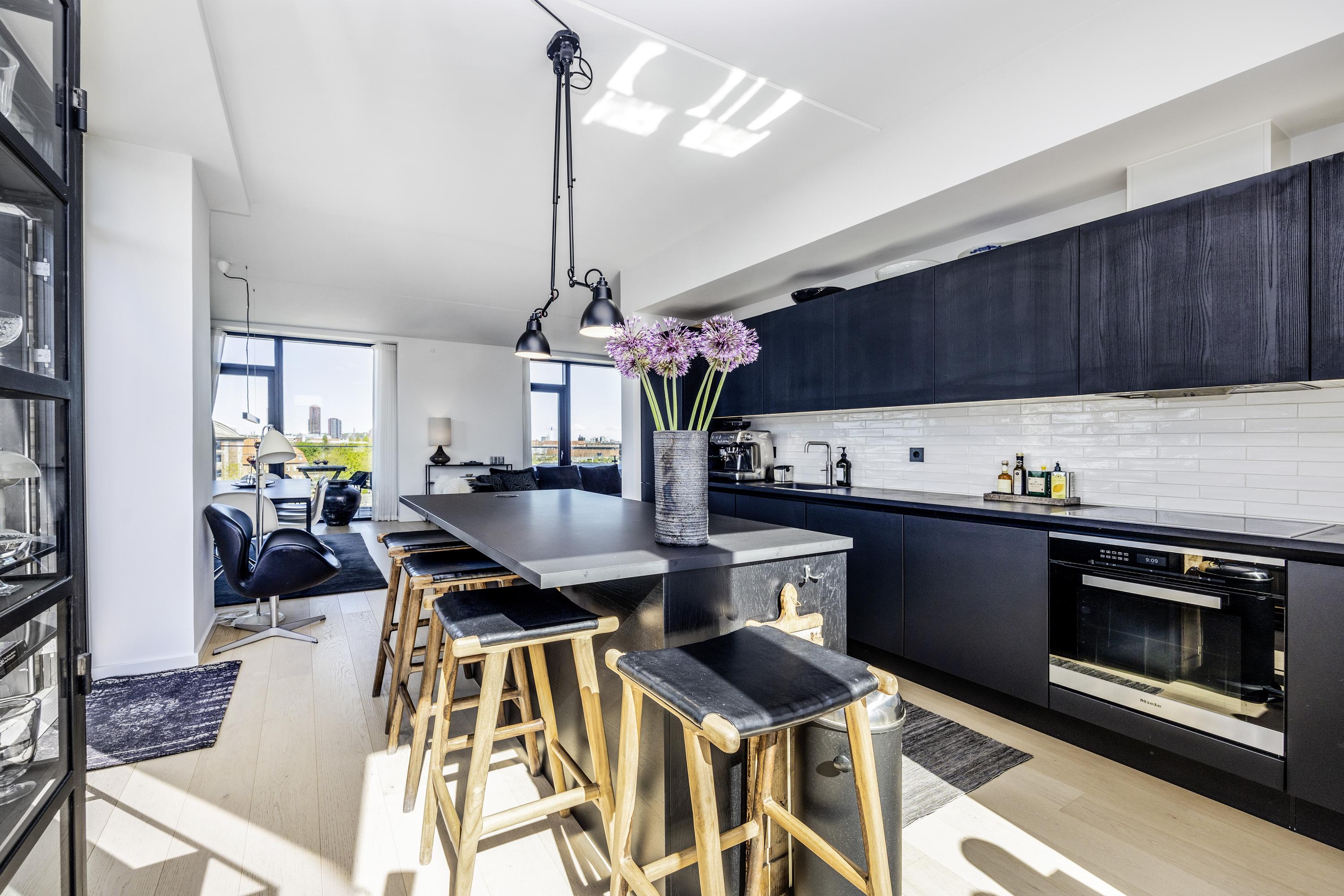 Velkommen til penthouse-lejligheden på 5. sal en eksklusiv boligoplevelse, hvor æstetik, komfort og udsigt smelter sammen i ét. Denne unikke hjørnelejlighed imponerer med sin omfattende tagterrasse, samt altan der omkranser hele boligen og giver dig 360 graders udsigt over kanalerne, byens