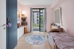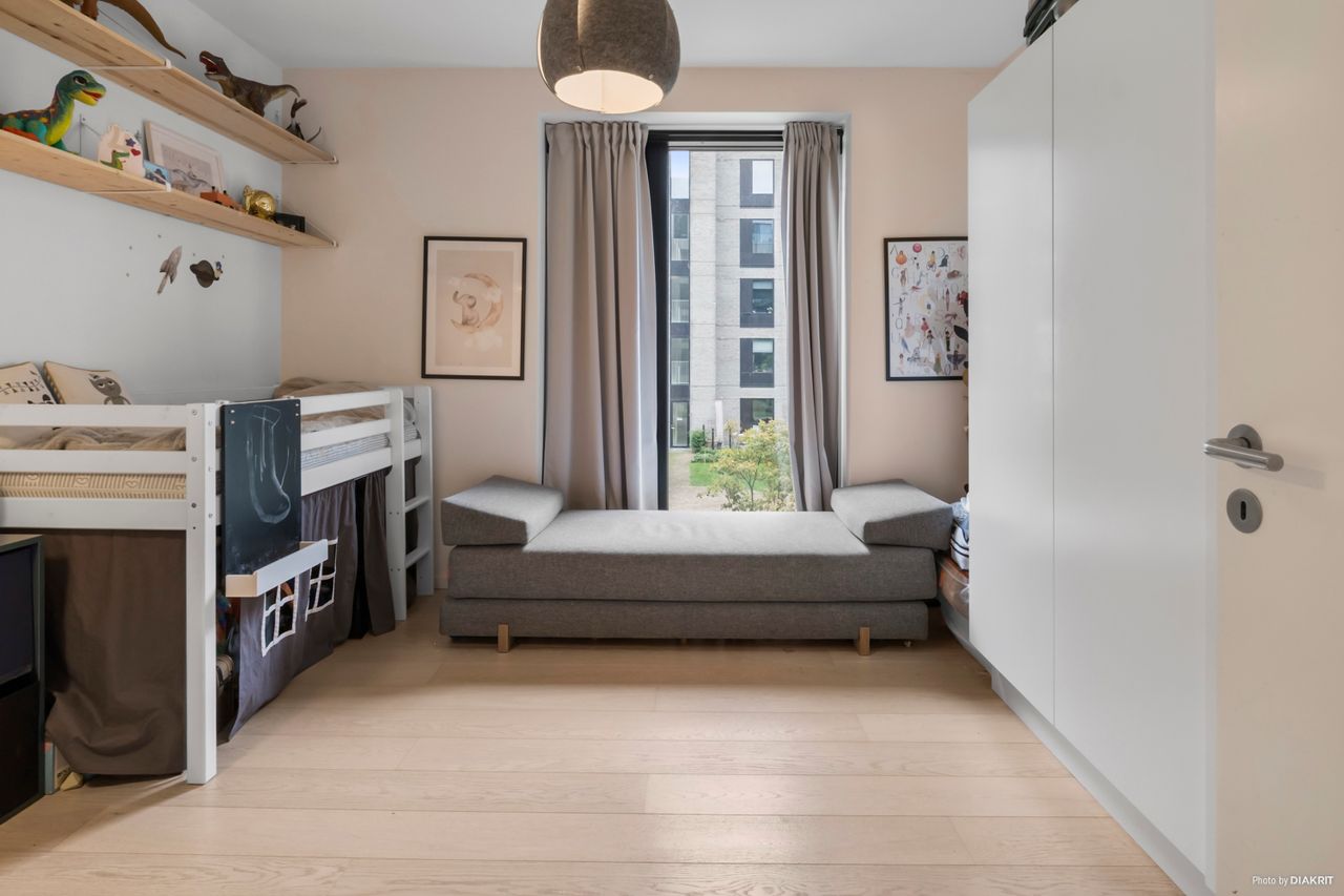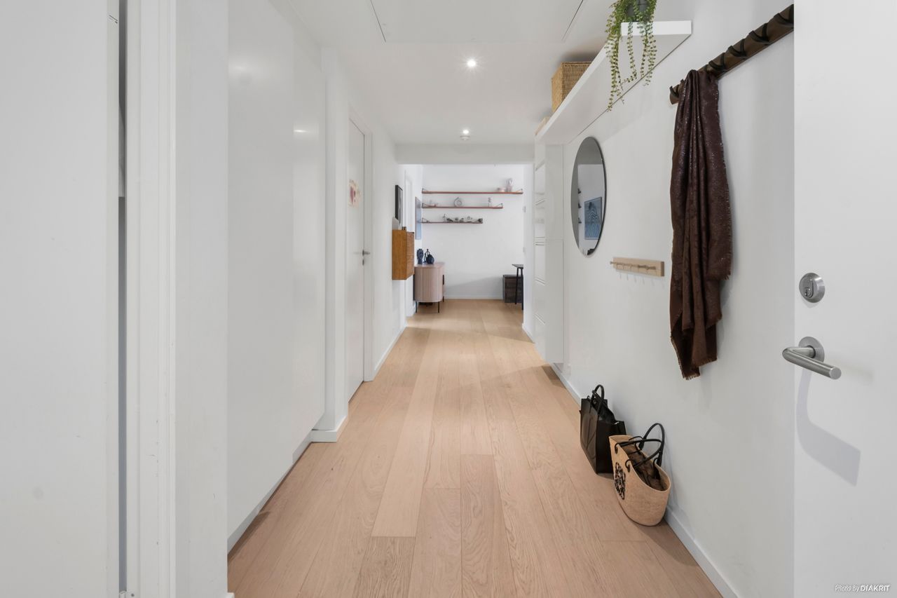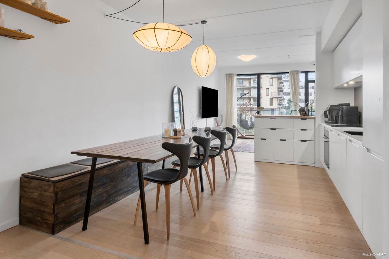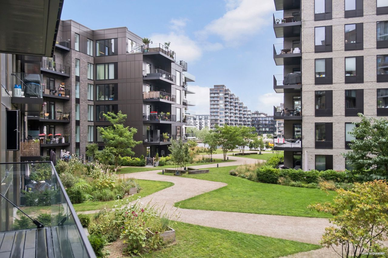 Lejligheden byder på et skønt og åbent opholdsrum med elegant køkken i stilrent design, integrerede hvidevarer og god skabsplads. Herfra er der direkte udgang til en rummelig altan med fantastisk kig til kanalen – en oplagt oase til morgenkaffen eller et glas vin i aftensolen. Fra altanen strækker det dragende kanalkig sig, så langt øjet rækker, helt ned til de historiske tage i Christianshavn. Og når man står i det store køkkenalrum eller opholdsstuen og kigger ud mod vandet, føles det næsten som om, at kanalen flyder helt ind i boligen – en udsigt, der skaber ro og rummer byen på én og samme tid. Planløsningen er gennemtænkt og indrettet med tre reelle værelser – herunder et lyst forældresoveværelse med udgang til grønne omgivelser, samt to børneværelser, som begge har fin størrelse og gode opbevaringsmuligheder. Badeværelset fremstår ligeledes moderne med separat bruseniche, vaskesøjle og stilrene materialer. Lejligheden fremstår i en harmonisk og nutidig stil med lyse gulve, store vinduespartier og en gennemgående rolig farvepalette. Entréen byder velkommen med indbygget opbevaring og en god fordeling til lejlighedens rum. Der er gulvvarme i hele boligen, hvilket sikrer en behagelig temperatur året rundt. Altanen mod vandet giver ikke blot skønne uderum, men trækker samtidig det maritime miljø helt ind i boligen – her forenes byliv og natur på smukkeste vis.