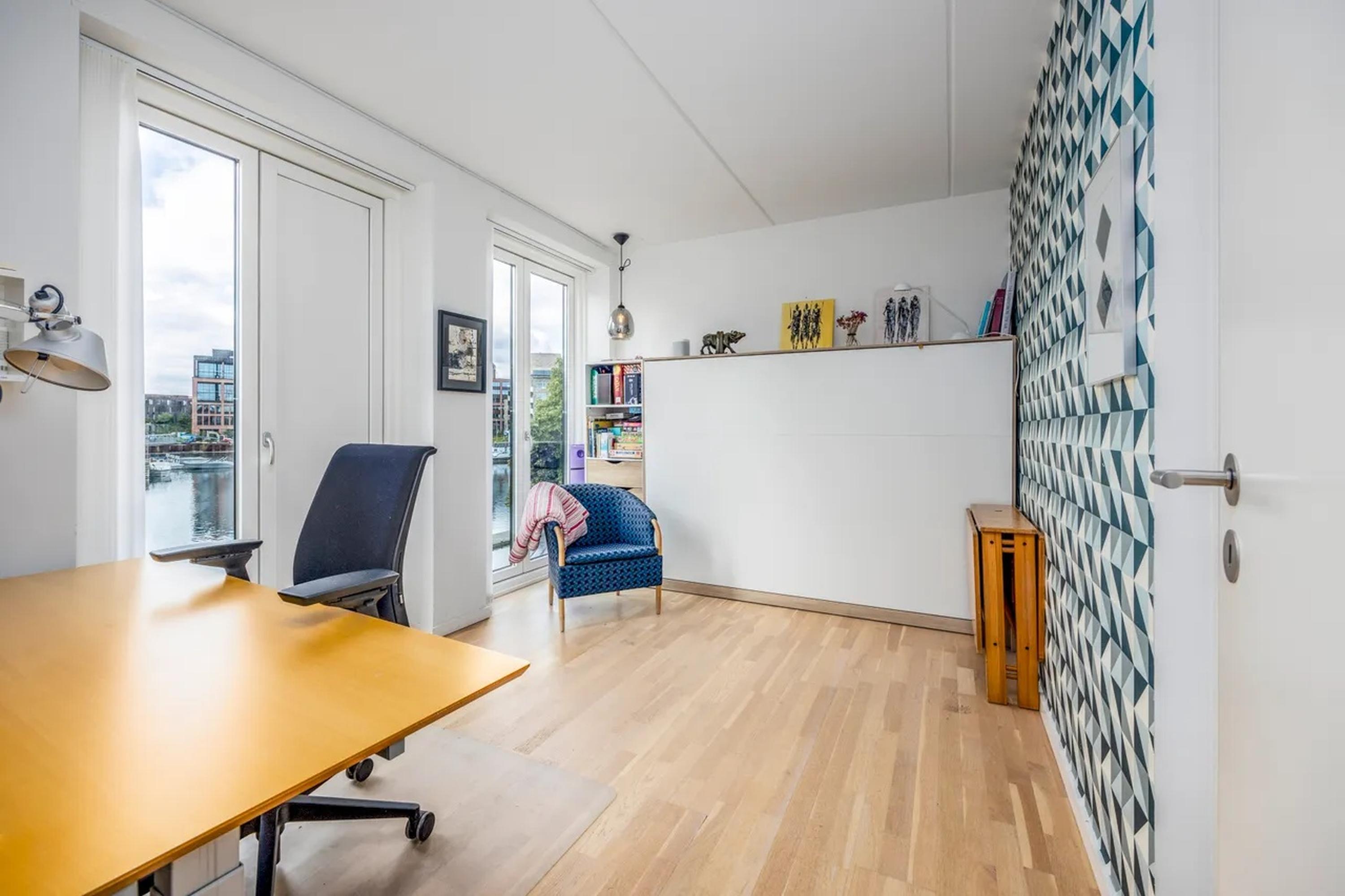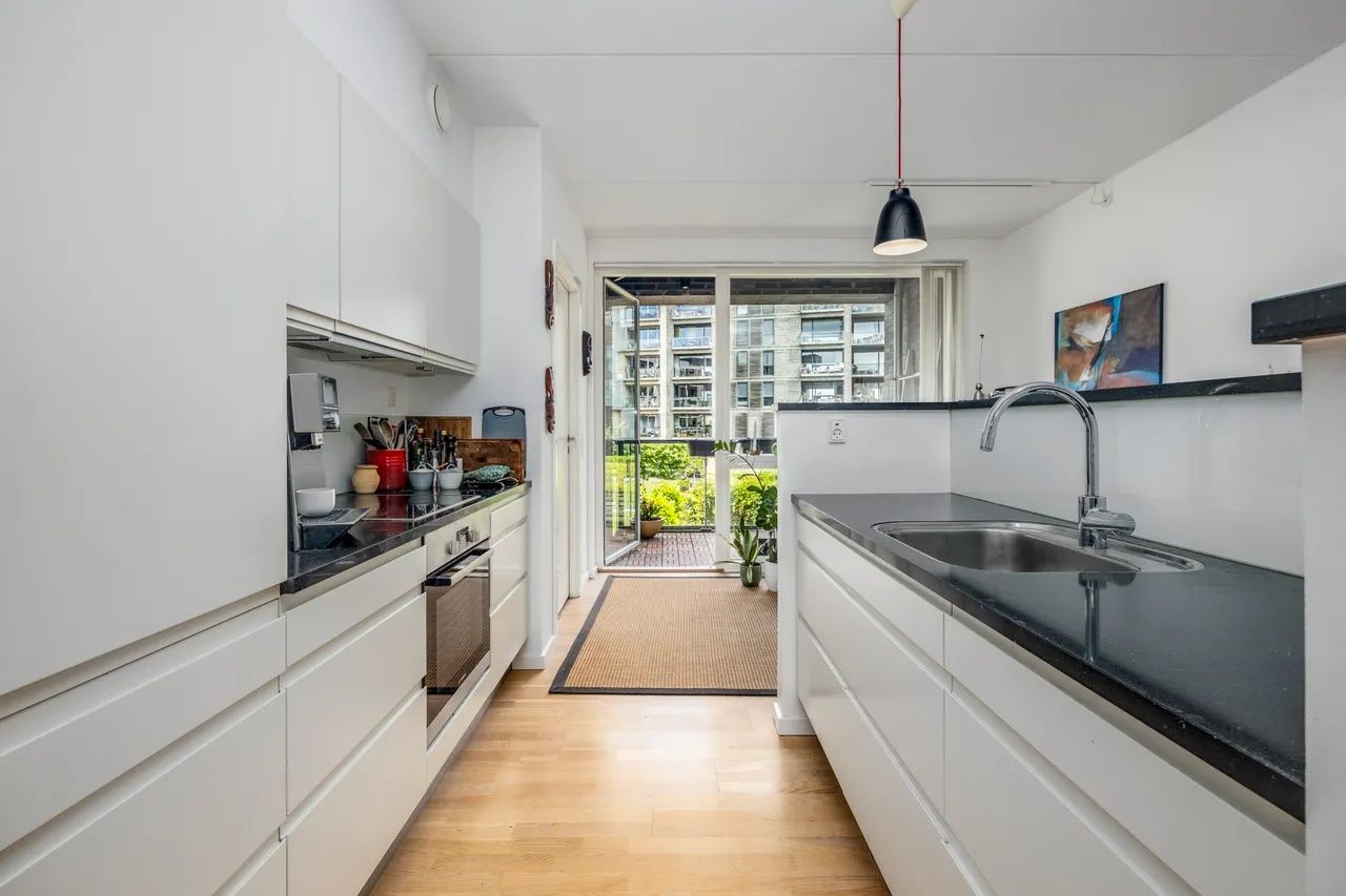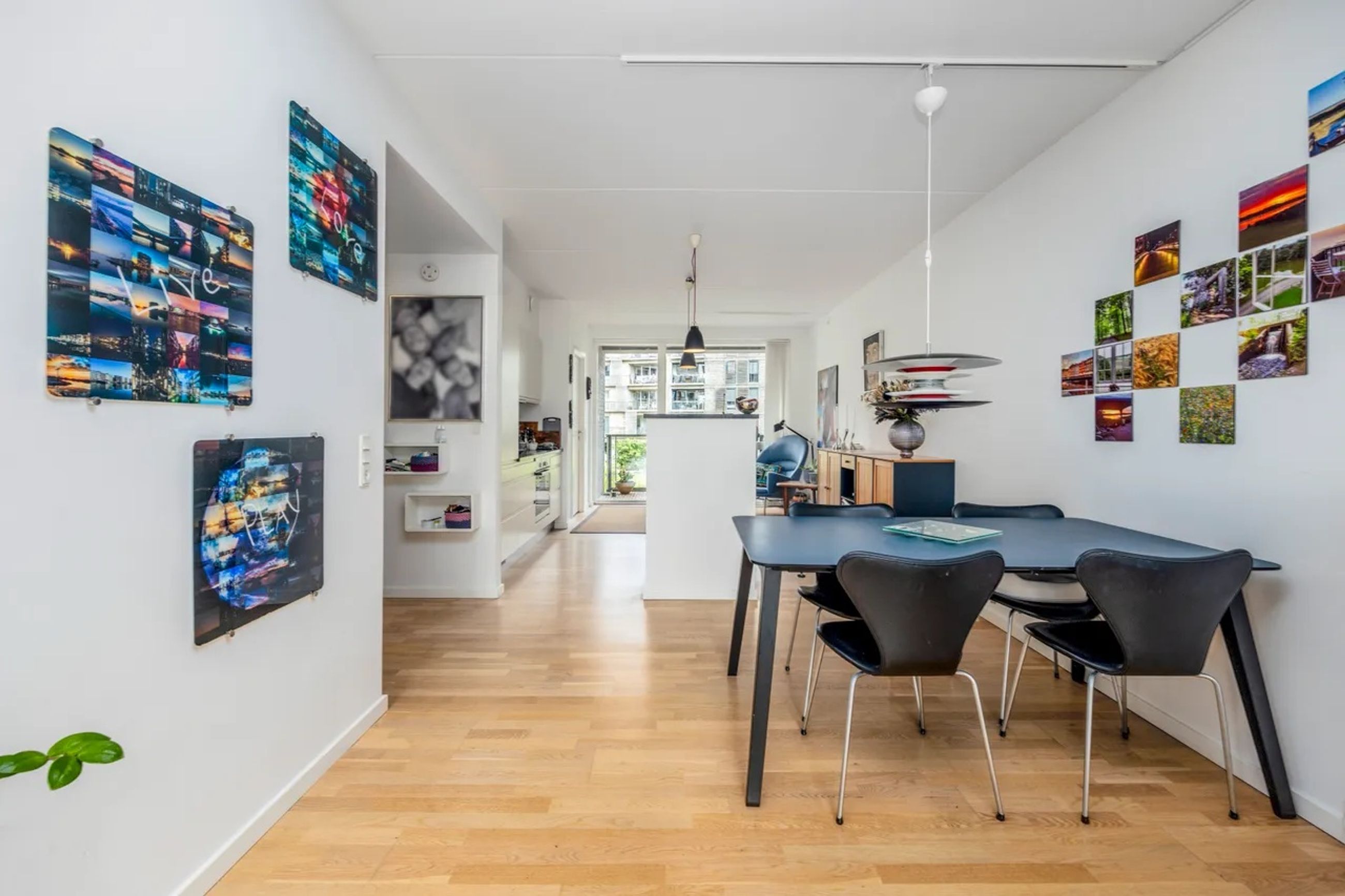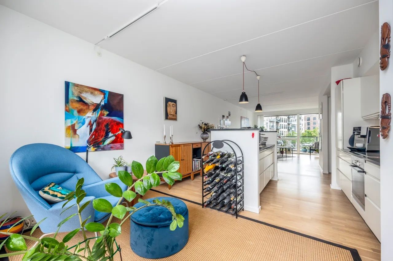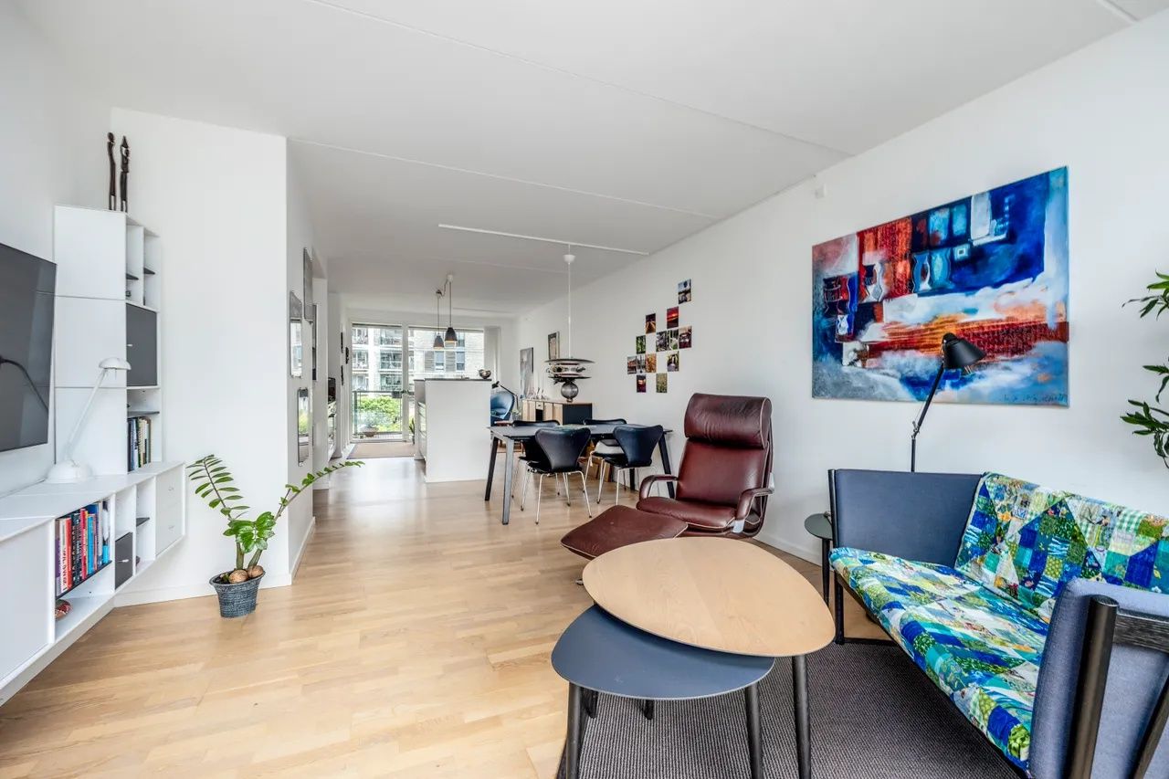 Højt til himlen, sol fra syd og kig til det glitrende vand – på Thad Jones Vej 14, 1. th. finder du en lys og veldisponeret lejlighed på 100 kvm, hvor funktionalitet, atmosfære og delevenlighed går hånd i hånd.