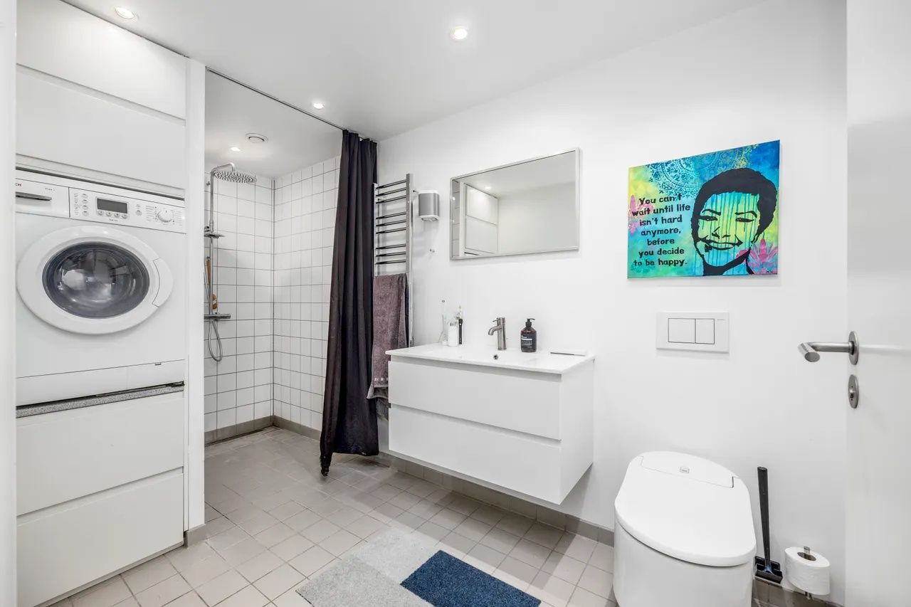 Badeværelset er moderne og veludnyttet med separat bruseniche, vaskesøjle og douchetoilet – en luksusdetalje, der gør hverdagen endnu mere komfortabel.