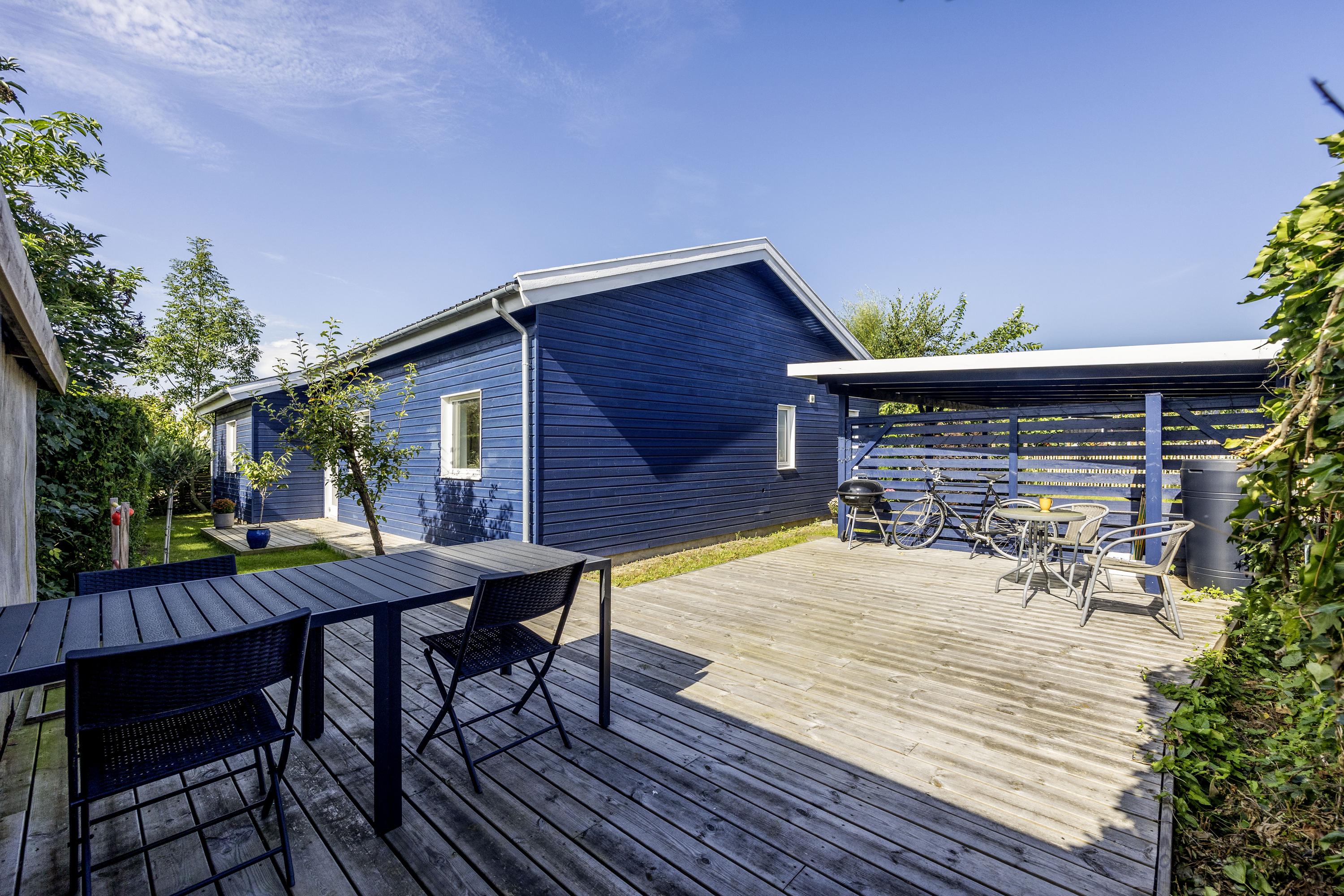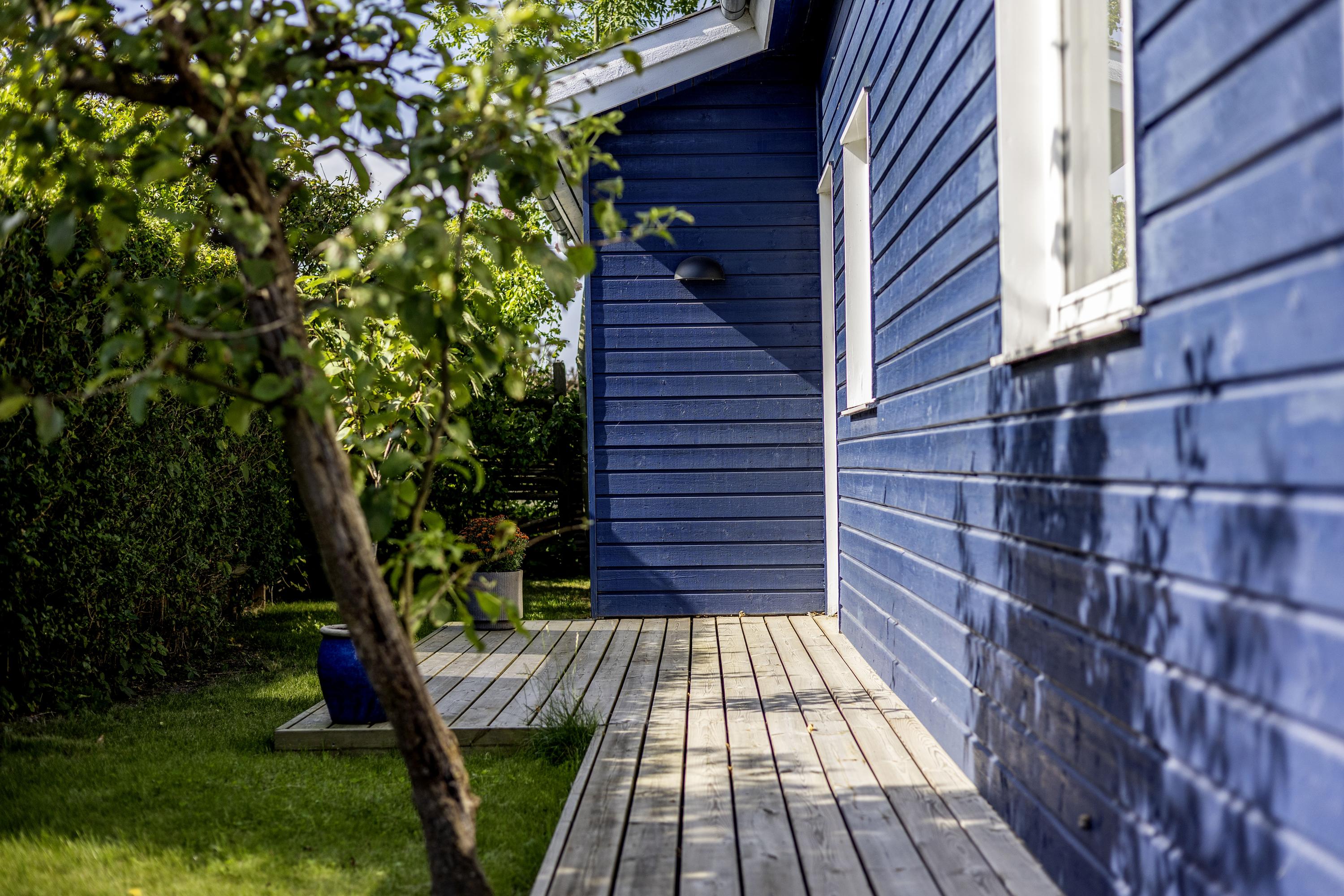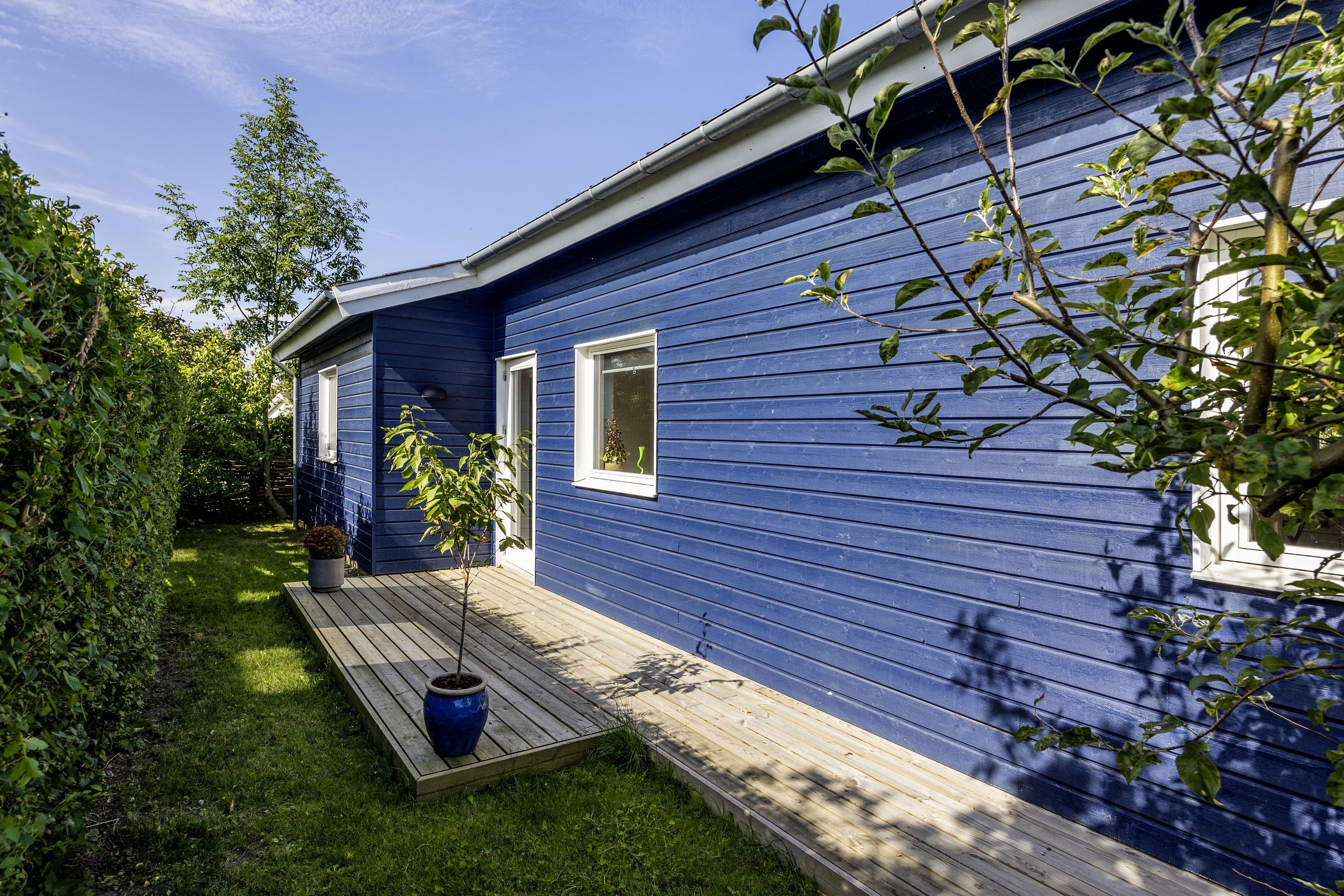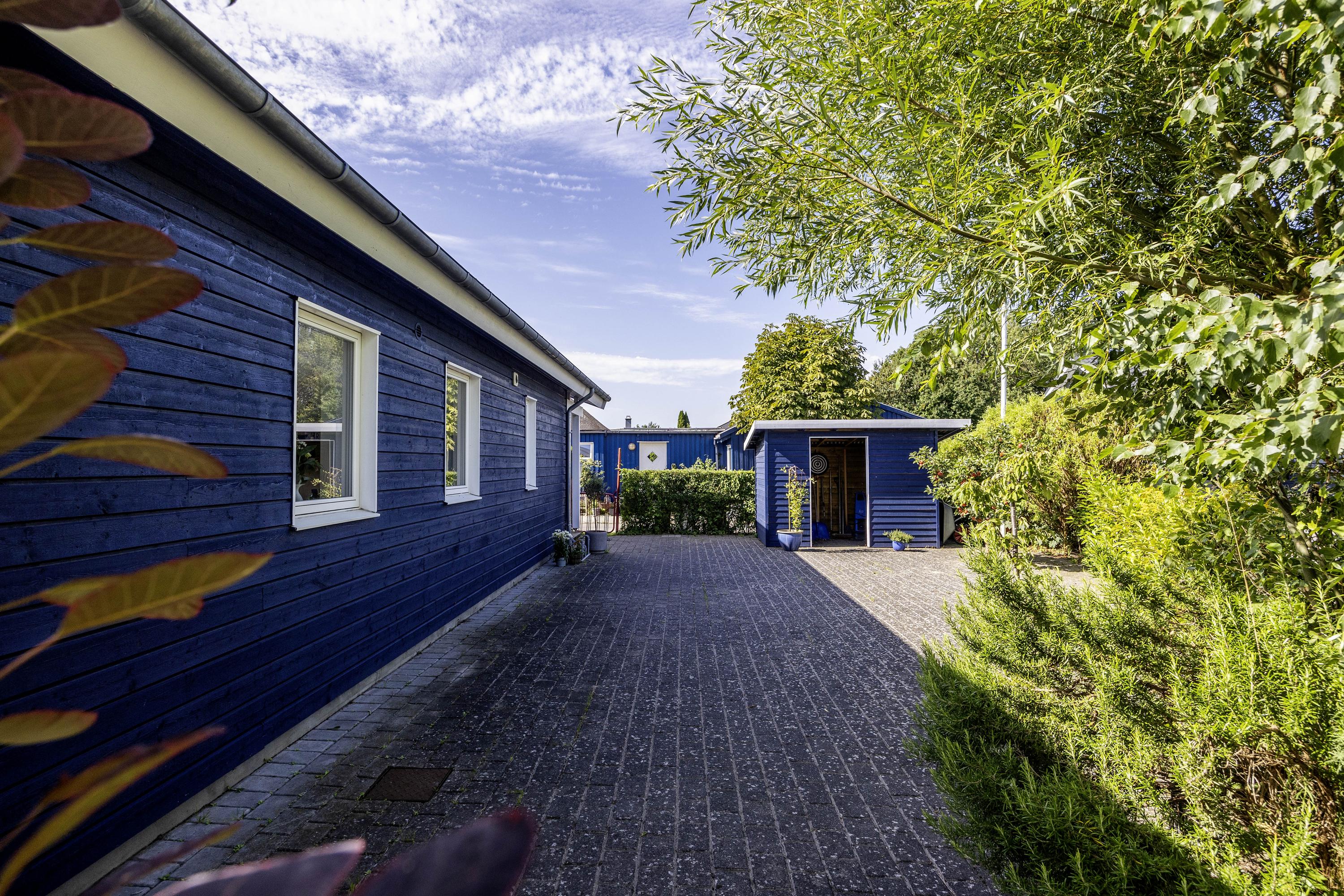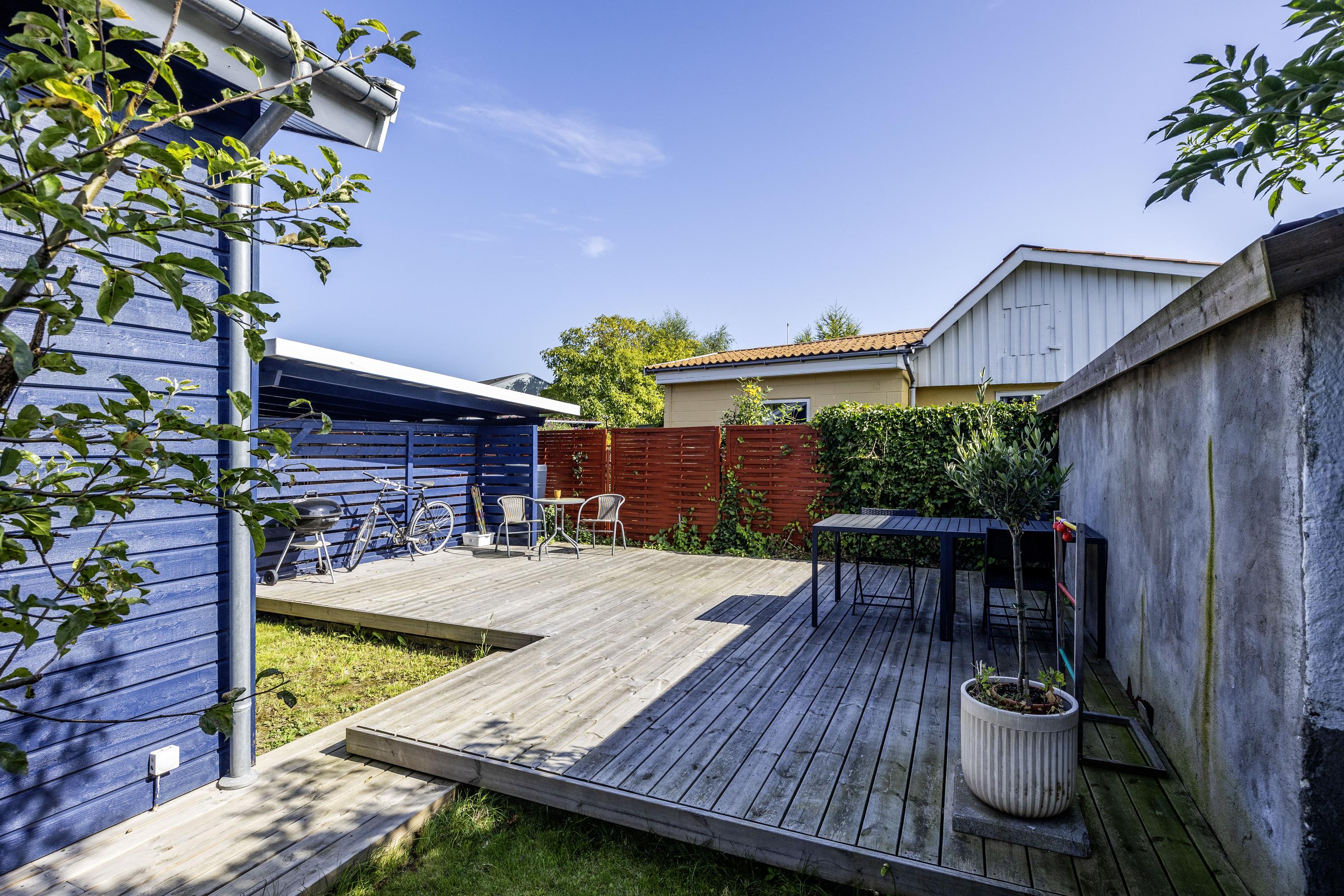 Velkommen til et sjældent skønt haveforeningshus, hvor ro, lys og grønne omgivelser går hånd i hånd med byens bekvemmeligheder. Det blå træhus præsenterer sig indbydende med brede træterrasser, carport i direkte forbindelse og en nem, frodig have til sommerliv fra første dag.