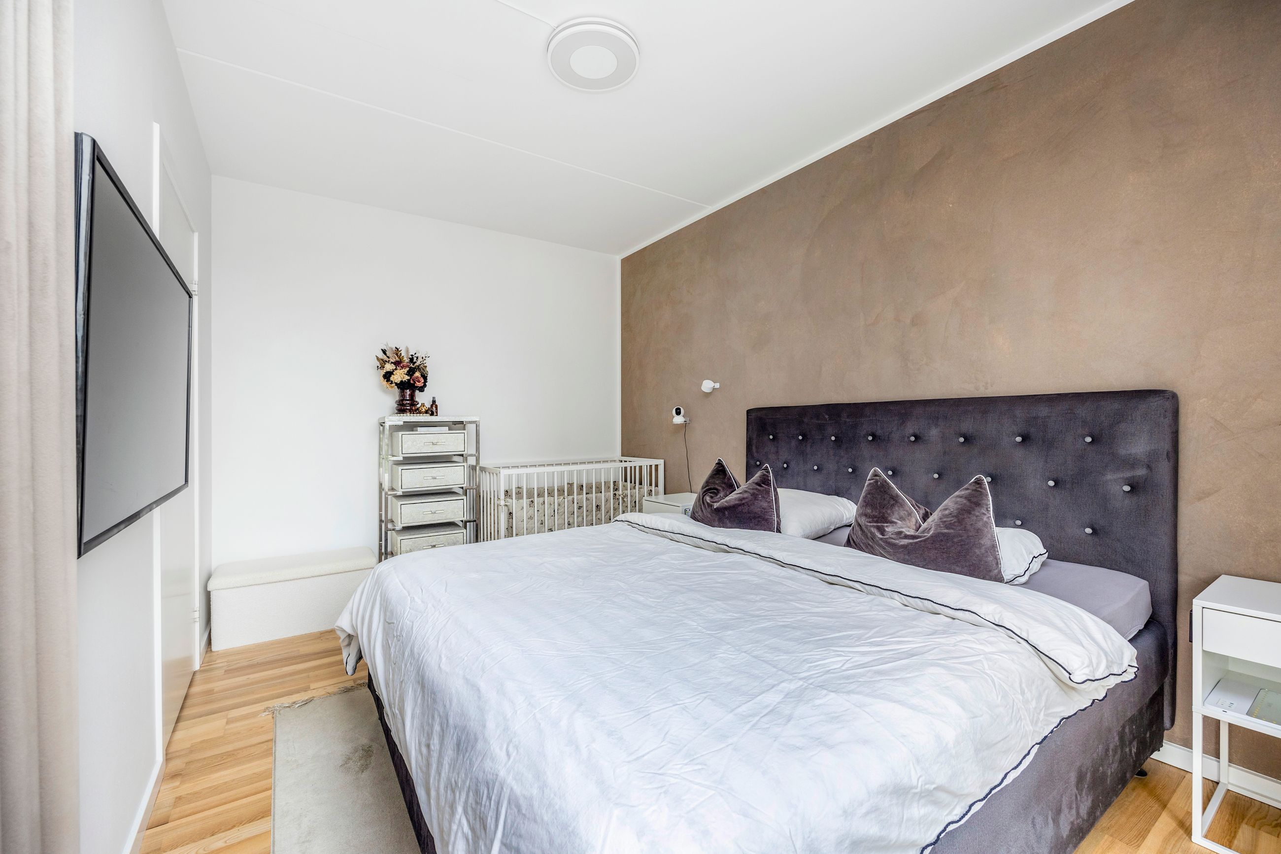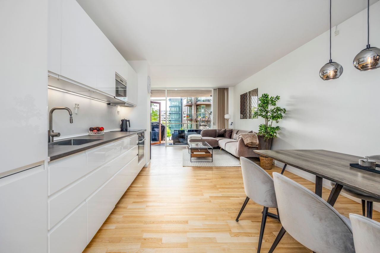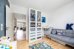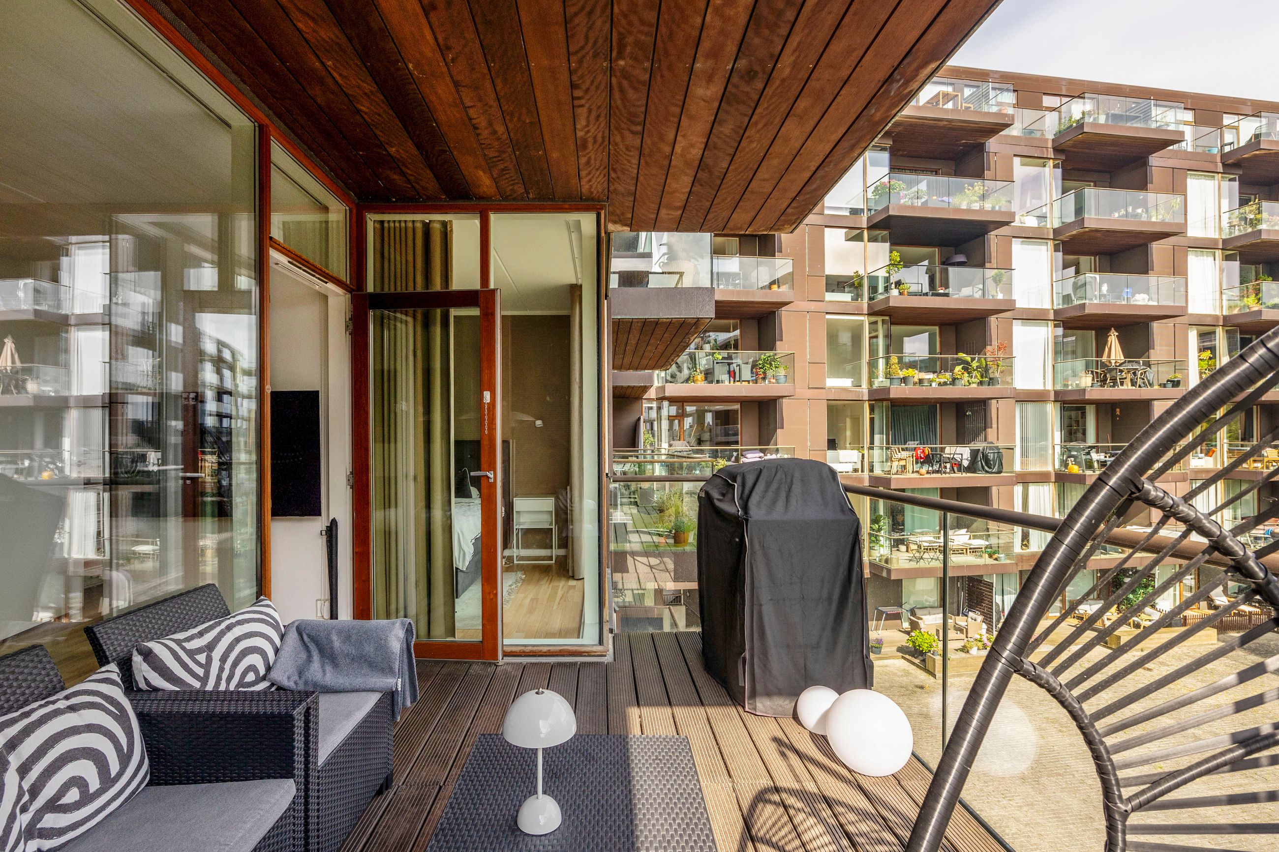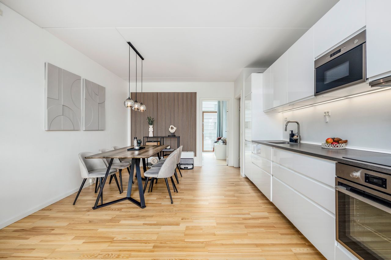 Lejligheden rummer tre indbydende værelser– et oplagt master bedroom med stort vinduesparti og smuk udsigt til vandet, et lyst børneværelse med fransk altan og ligeledes kig til vandet samt et fleksibelt værelse, der i dag fungerer som walk-in, men også kan indrettes som kontor eller gæsteværelse. Hjertet i lejligheden er det lyse, åbne køkken/alrum og stue i ét. Det elegante, hvide grebsfrie køkken er udstyret med integrerede hvidevarer, ovn i ergonomisk højde, opvaskemaskine og rigeligt med bordplads– perfekt til både hverdagsmad og gæstemiddage. De store vinduespartier i opholdsrummet lader solen strømme ind og skaber en indbydende atmosfære året rundt. Herfra er der direkte adgang til den rummelige, overdækkede altan, hvor der er plads til både loungemøbler og grill. En indbygget stikkontakt gør det muligt at tilslutte terrassevarmer eller hyggelig belysning, så du kan nyde de lange sommeraftener eller de kølige efterårsdage i fulde drag.
