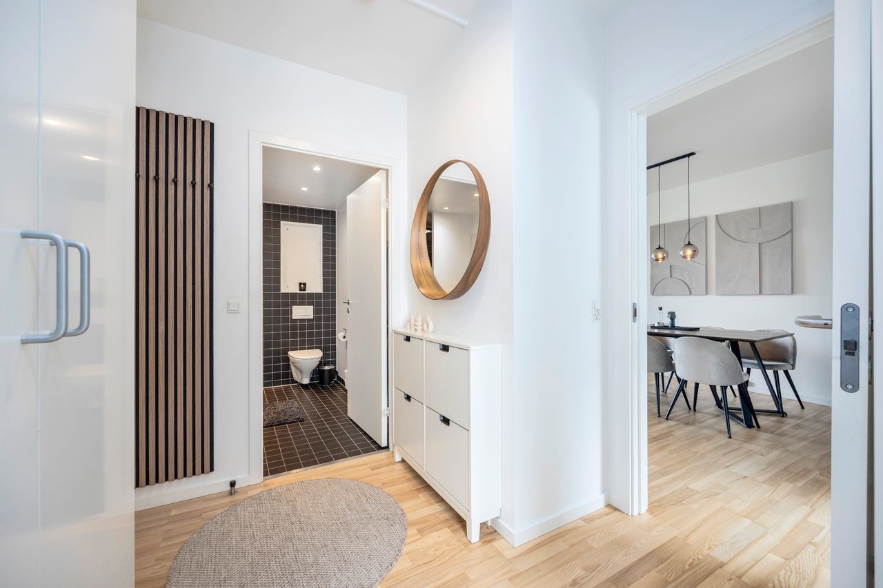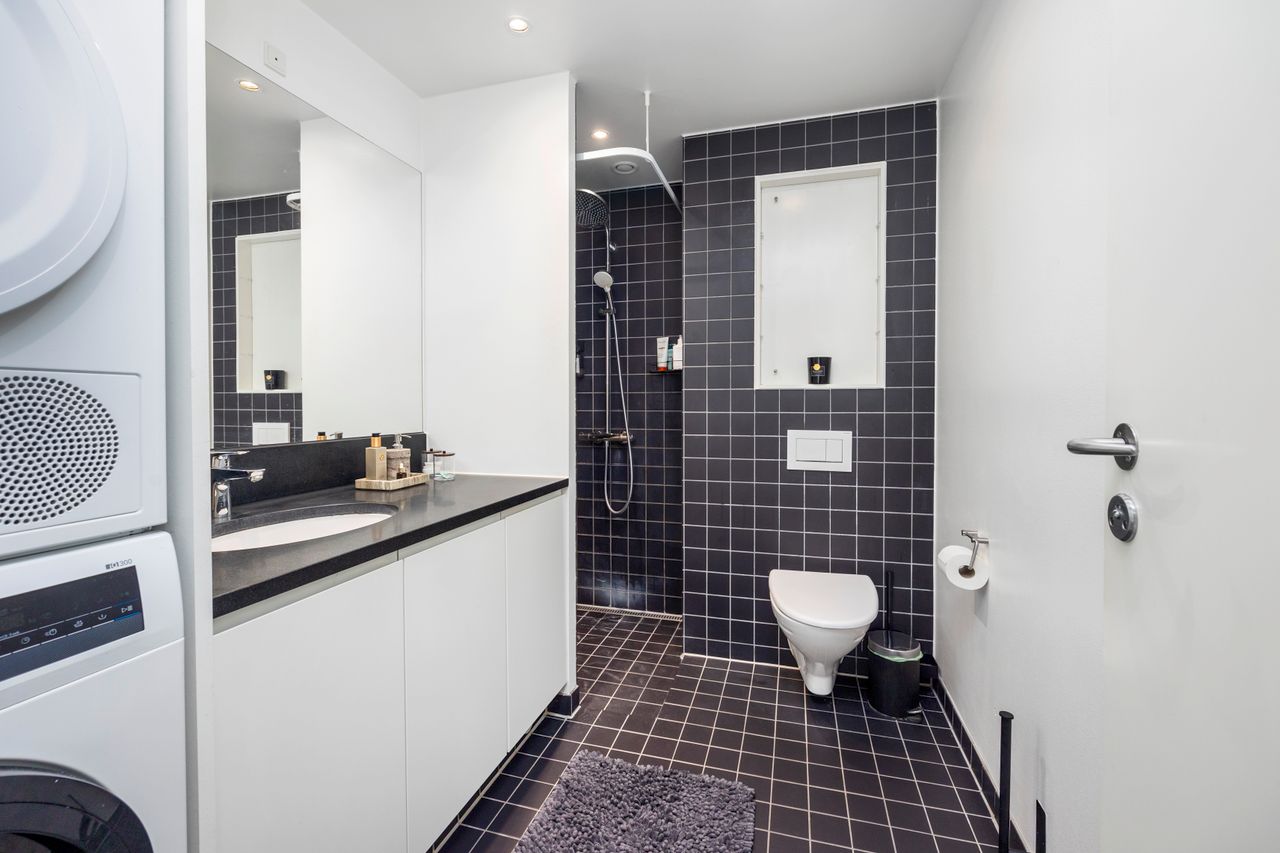 Lys og moderne 4-værelses lejlighed på 2. sal med skøn, overdækket altan og en gennemtænkt planløsning. Boligen byder velkommen i en rummelig entré med god skabsplads, og herfra er der adgang til et stilrent badeværelse med separat bruseniche, vaskesøjle og elegante mørke klinker.