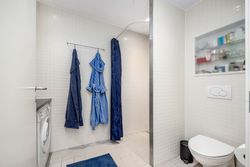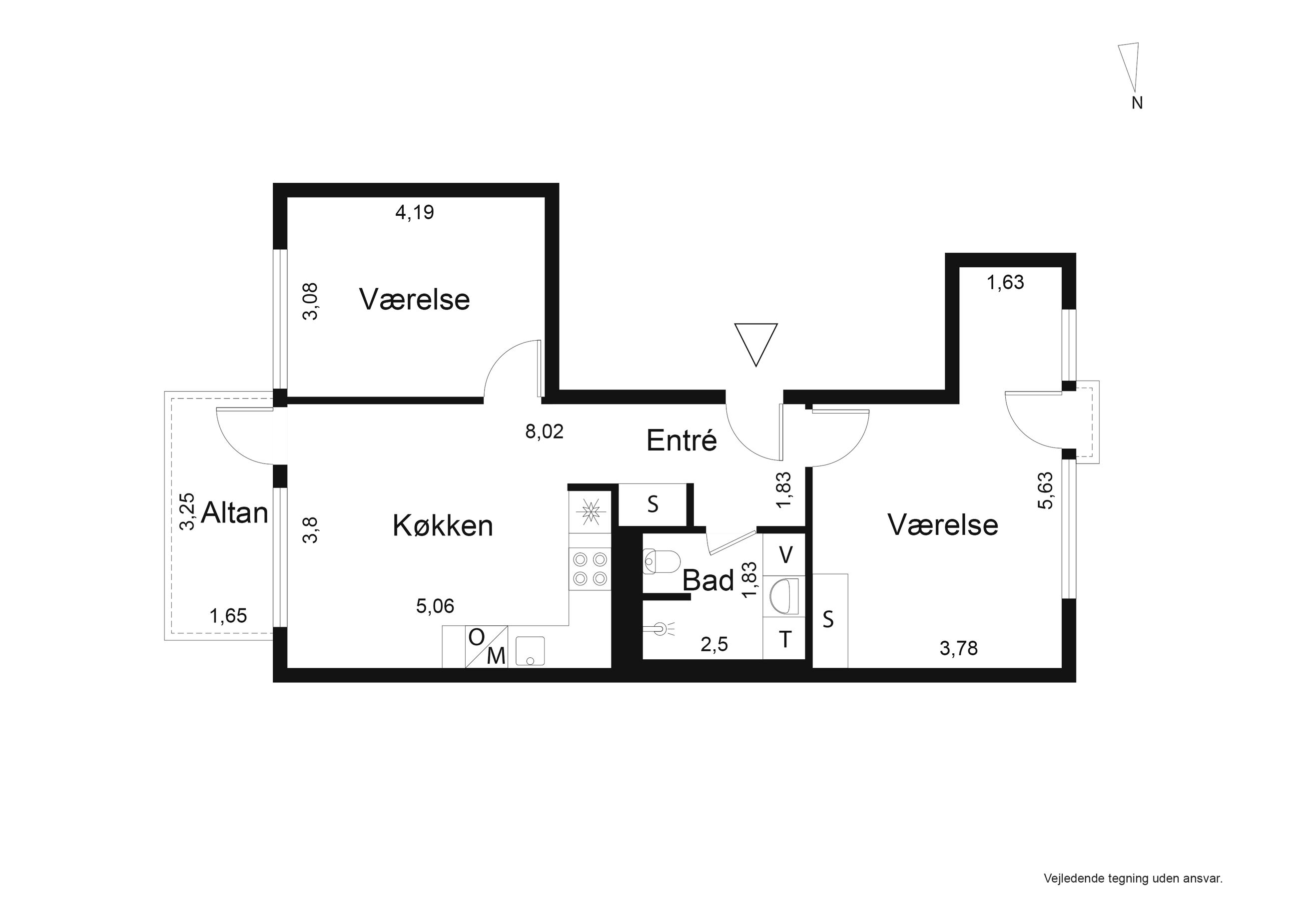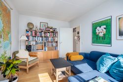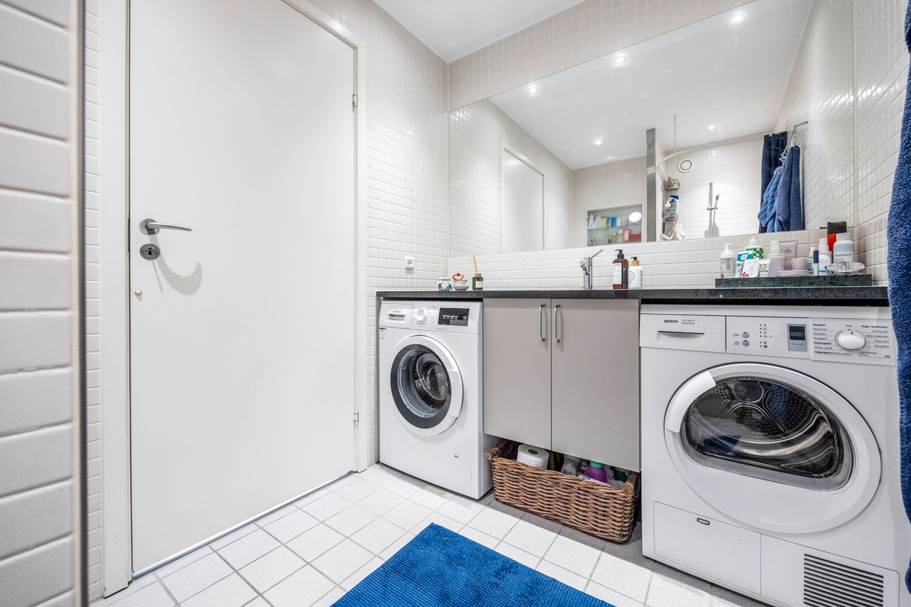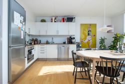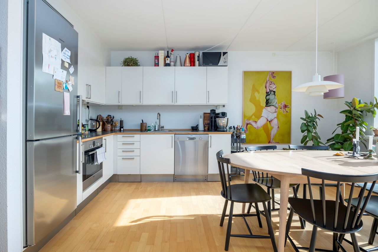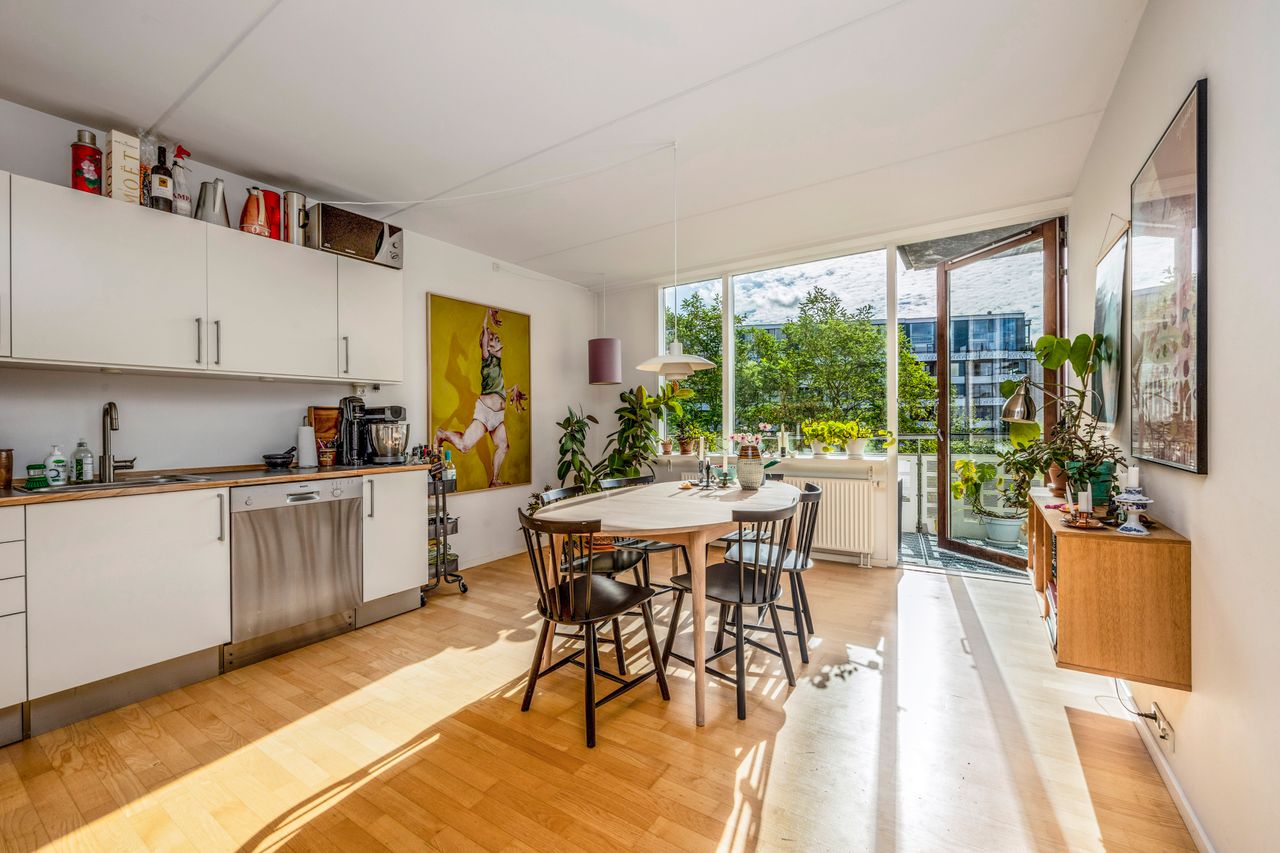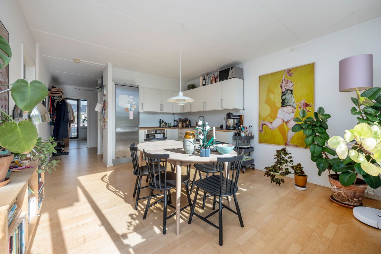 Lejligheden har et åbent og indbydende køkken-alrum i forbindelse med stuen, hvorfra der er udgang til altanen. Køkkenet er opført i stilrene materialer med alt i hårde hvidevarer og god plads til både madlavning og opbevaring. De to værelser er regulære og ligger i hver sin ende af lejligheden, hvilket giver fleksibel indretning – perfekt til både par, børnefamilien eller hjemmearbejde. Badeværelset er rummeligt og funktionelt med separat bruseniche, vaskesøjle og opbevaringsplads.