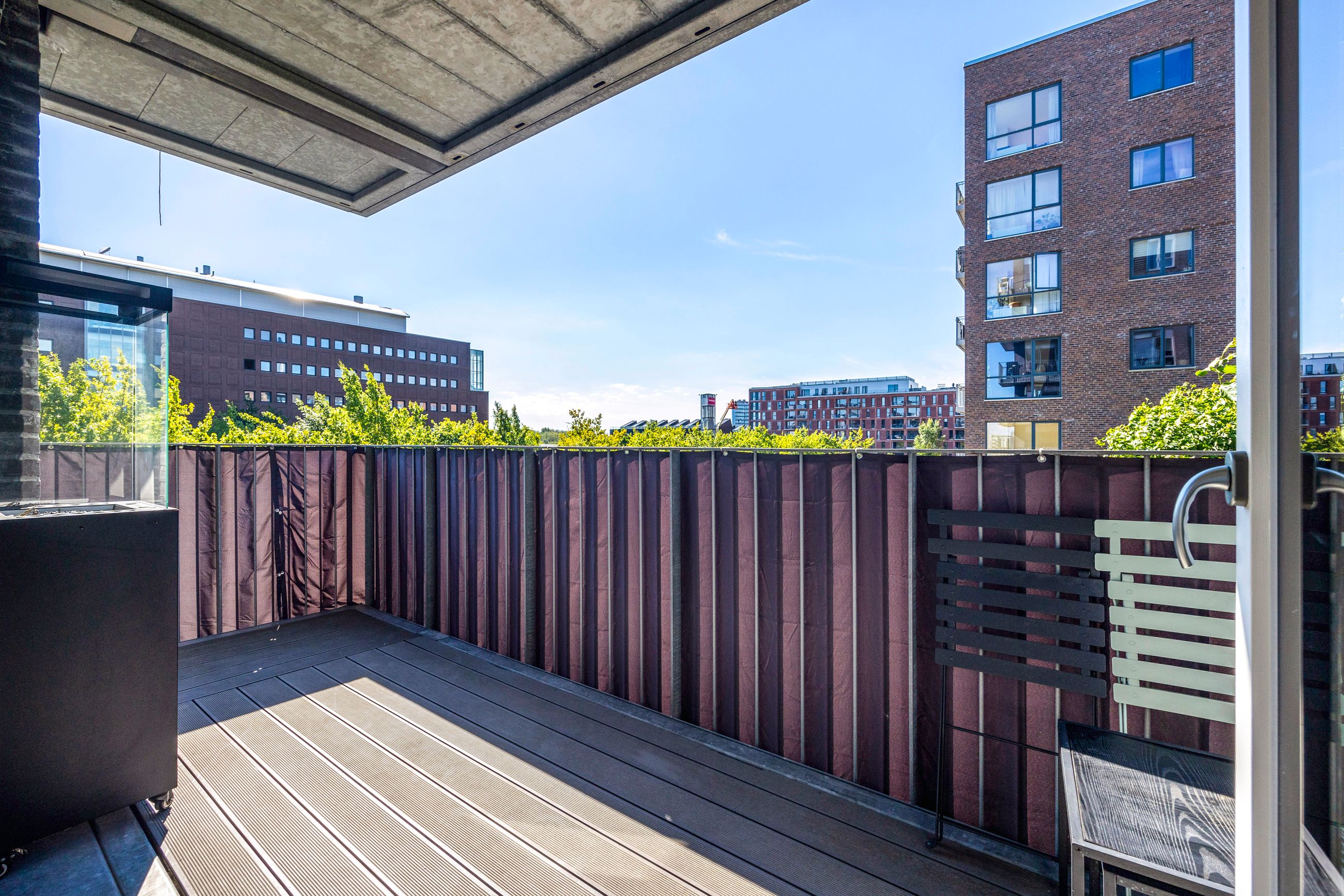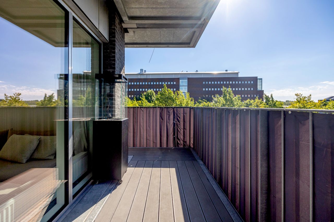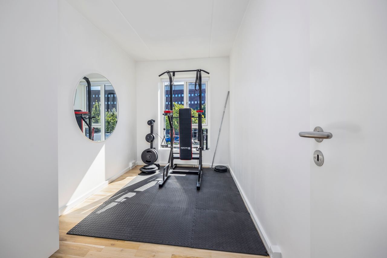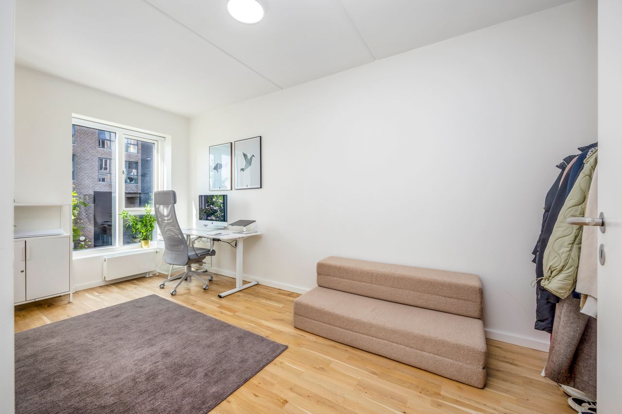 Altanen vender mod grønne omgivelser og giver et sjældent pusterum midt i byen. De tre værelser er regulære og fleksible - oplagte som soveværelse, børneværelse, hjemmekontor eller fitness. Badeværelset er elegant og praktisk indrettet med separat brus og vaskesøjle, og entréen byder på god opbevaringsplads.