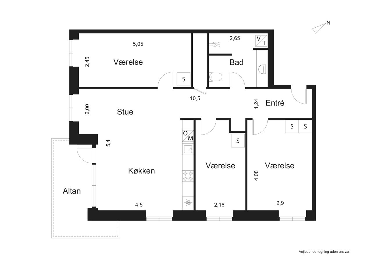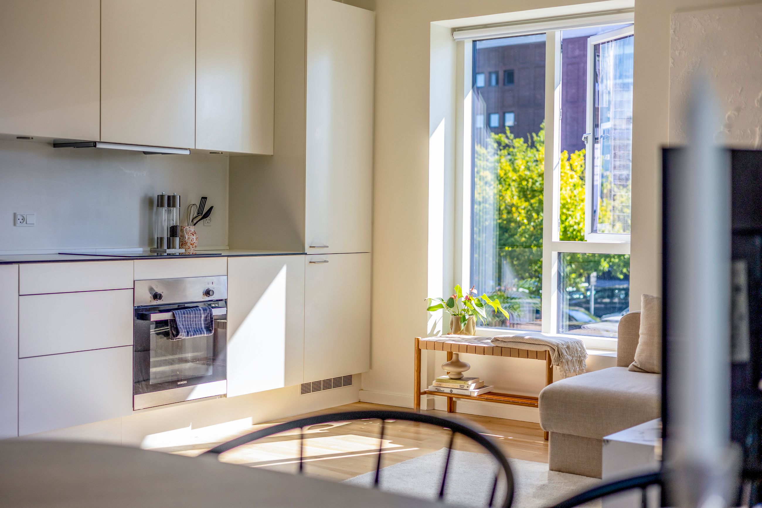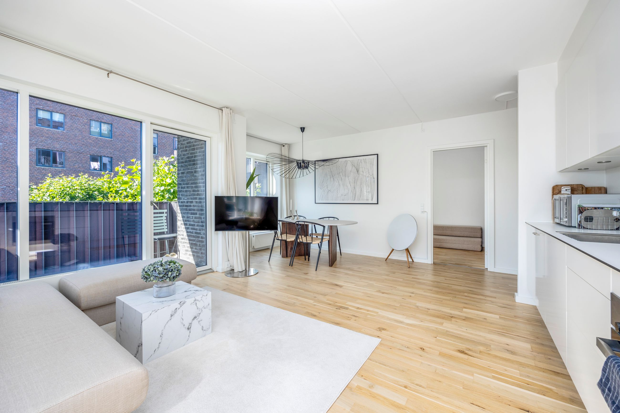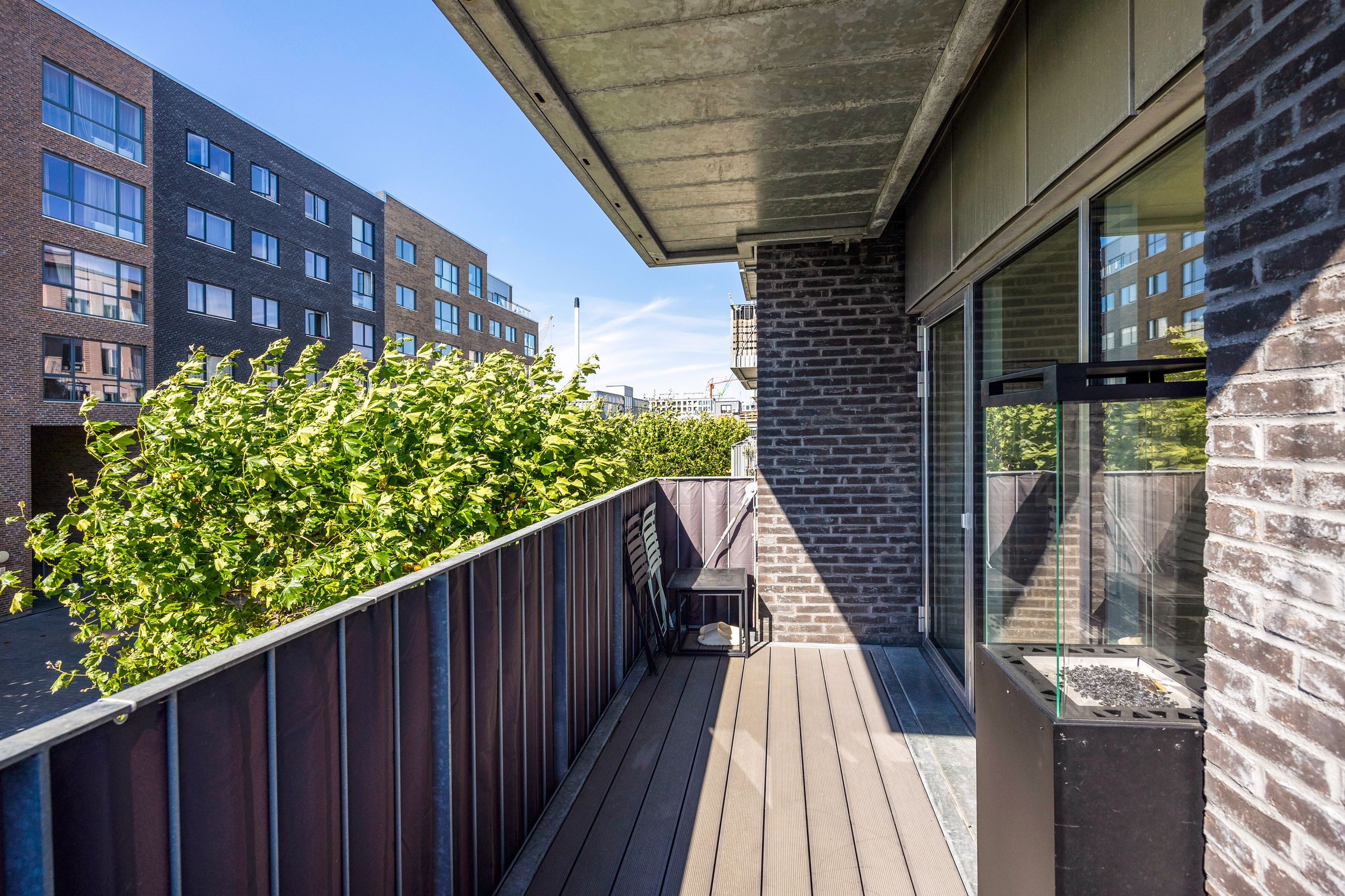 Altanen vender mod grønne omgivelser og giver et sjældent pusterum midt i byen. De tre værelser er regulære og fleksible - oplagte som soveværelse, børneværelse, hjemmekontor eller fitness. Badeværelset er elegant og praktisk indrettet med separat brus og vaskesøjle, og entréen byder på god opbevaringsplads.