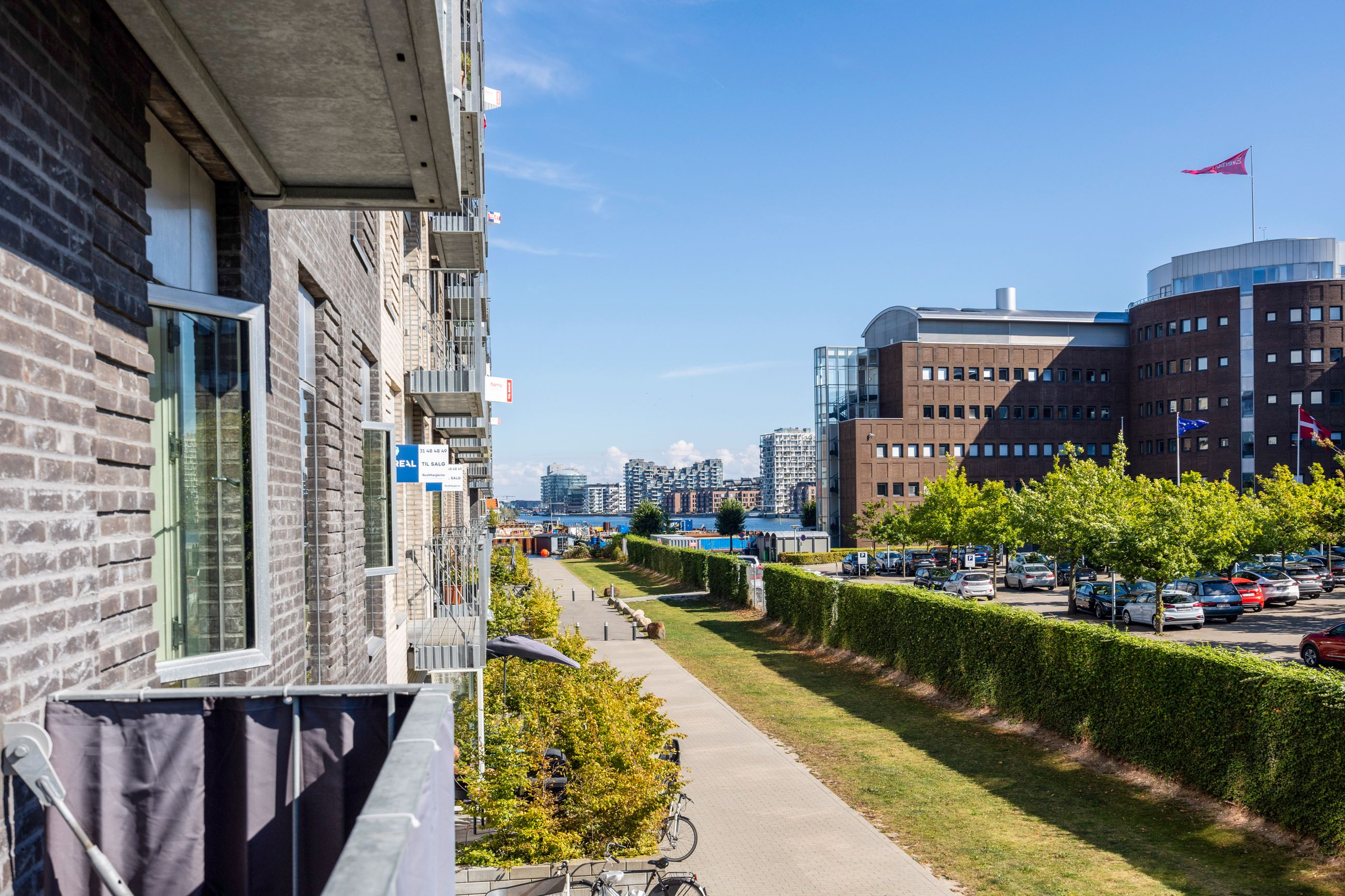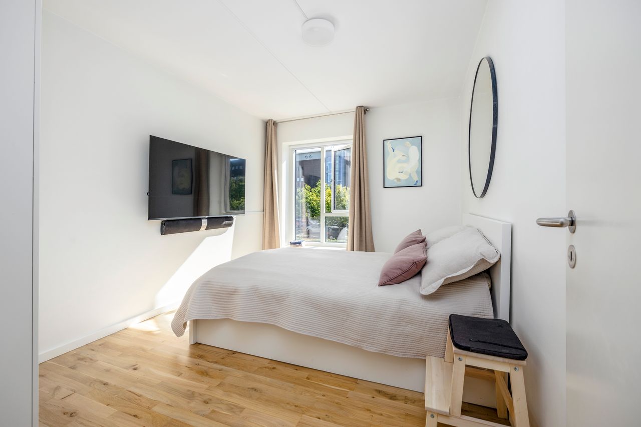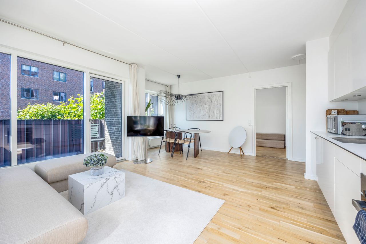 Ejendommen er moderne med elevator, aflåst opgang og adgang til en hyggelig gårdhave med bænke og cykelparkering. Til lejligheden hører også brugsret til kælderrum. Beliggenheden er ideel - tæt på havnepromenade, metro og havnebus. Du bor i et område med caféer, indkøb og grønne arealer lige i nærheden, og med få minutter påcykel til både Vesterbro og Indre By.