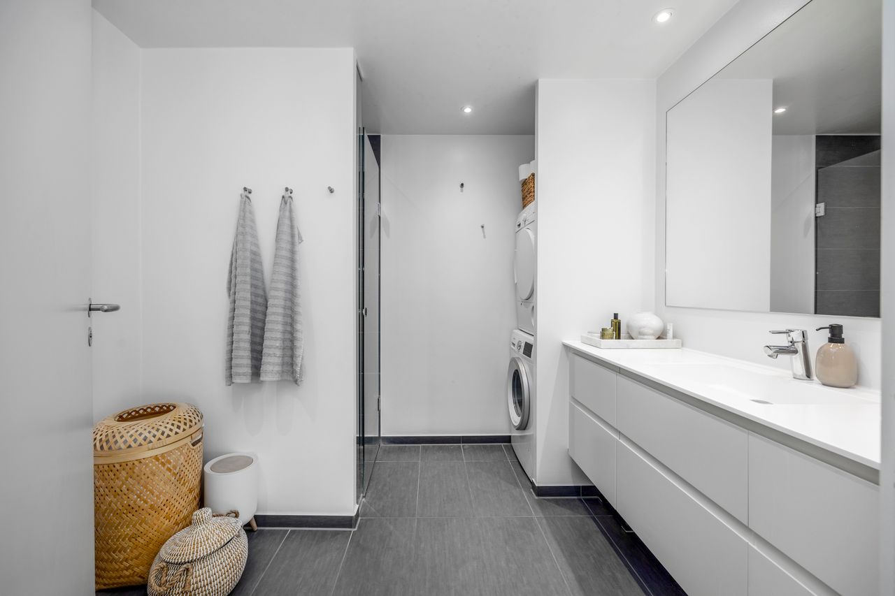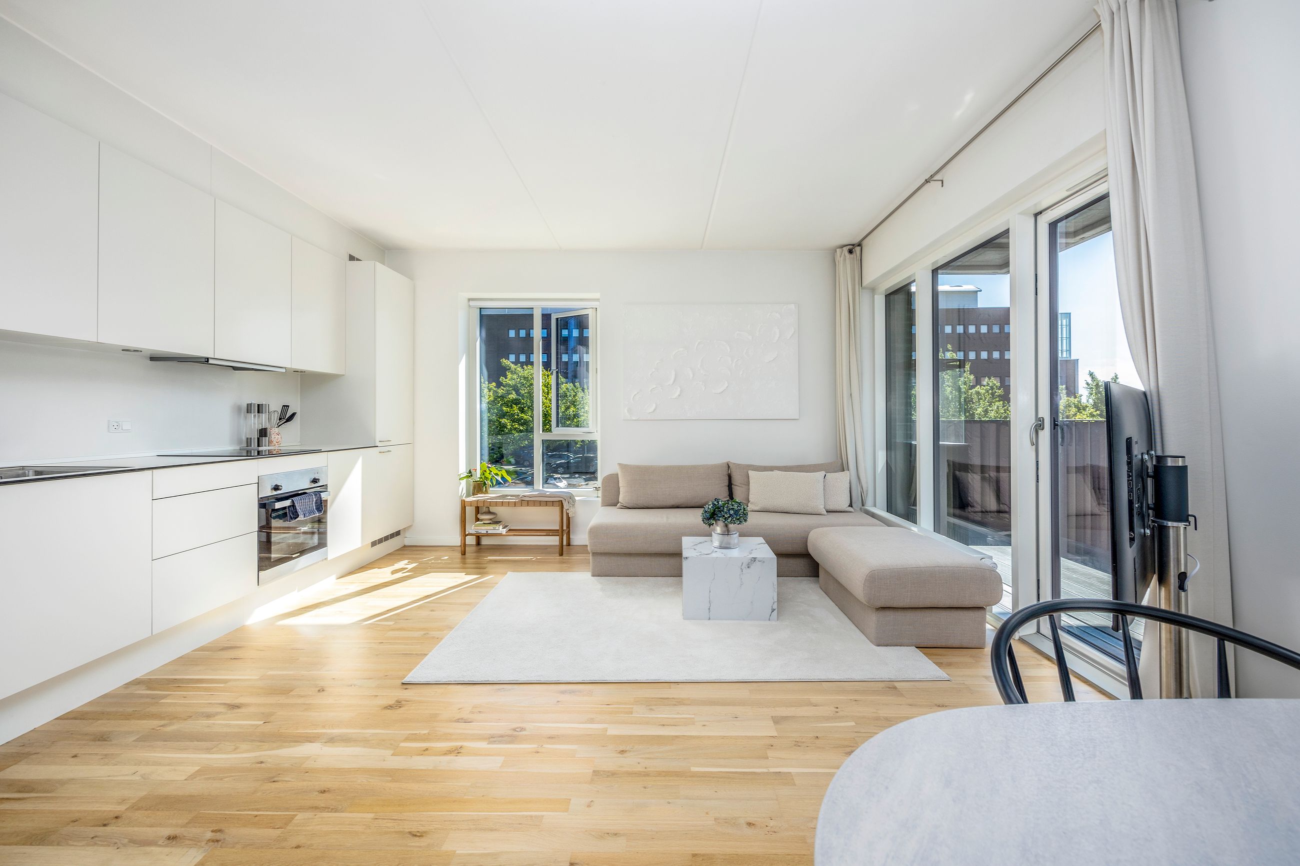 Lejligheden rummer 94 veludnyttede kvadratmeter med en åben og funktionel planløsning. Det moderne køkken ligger i åben forbindelse med stuen, hvorfra der er direkte udgang til altanen - et skønt uderum med plads til både loungemøbler, spisebord og grill.