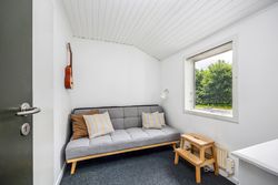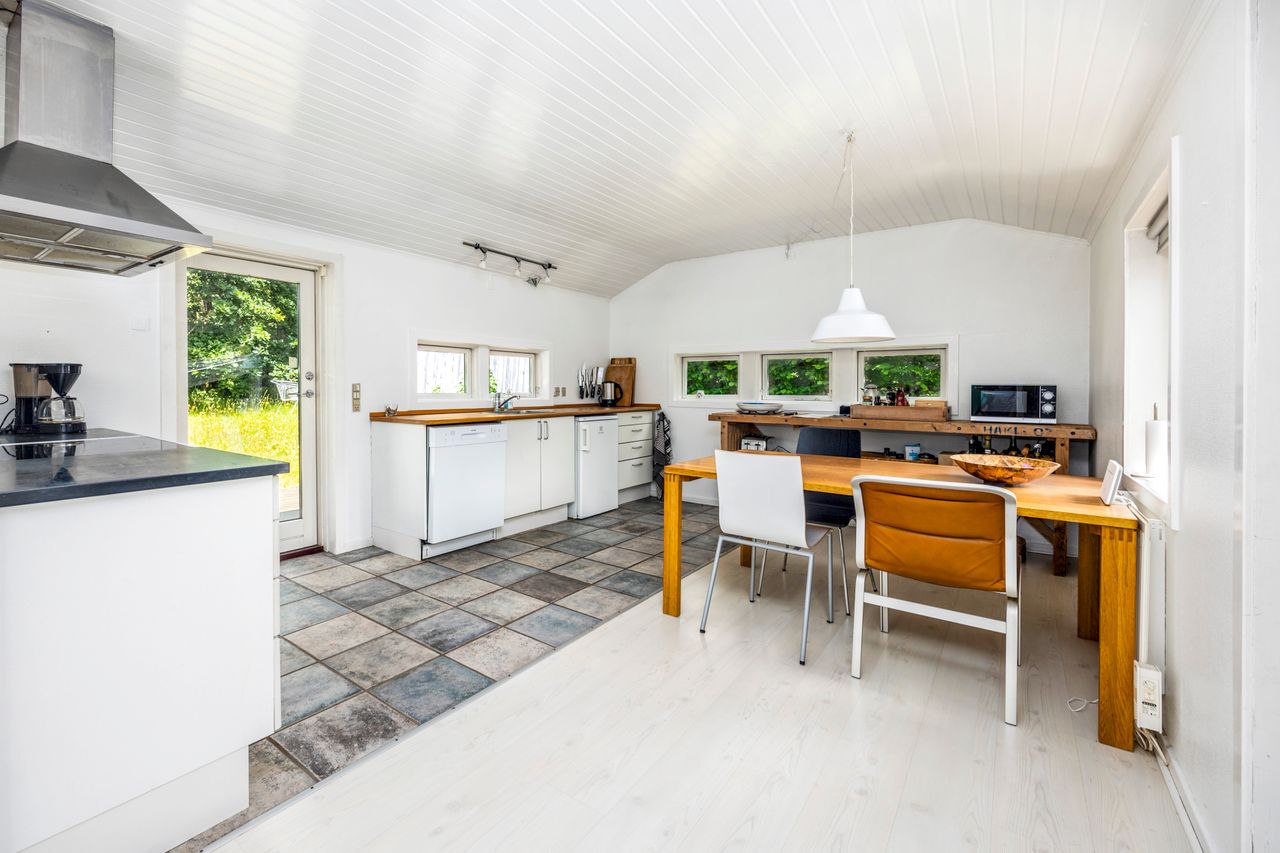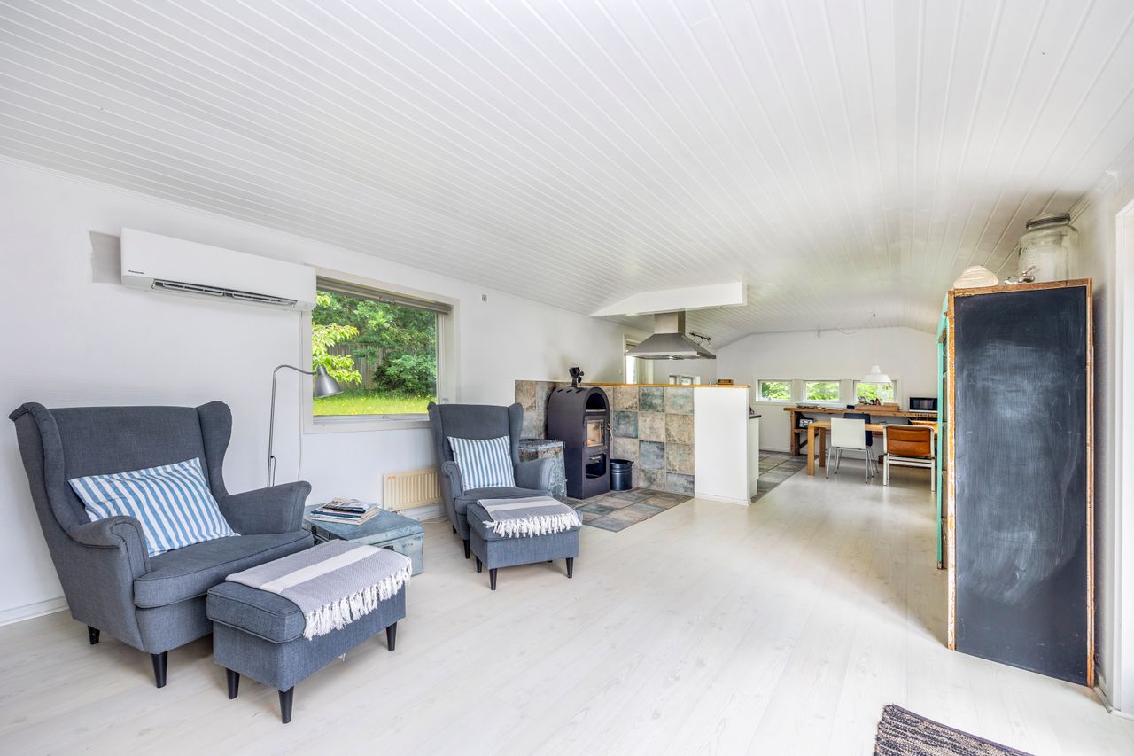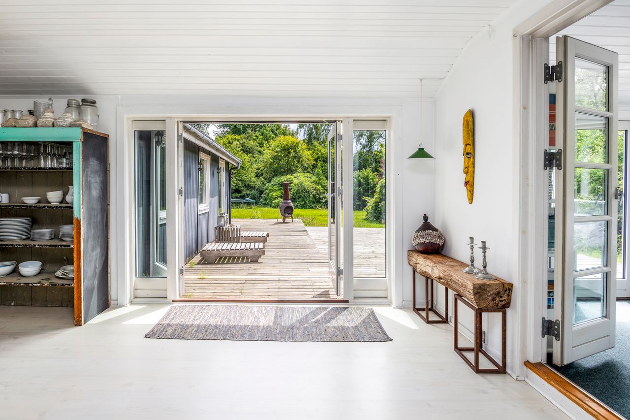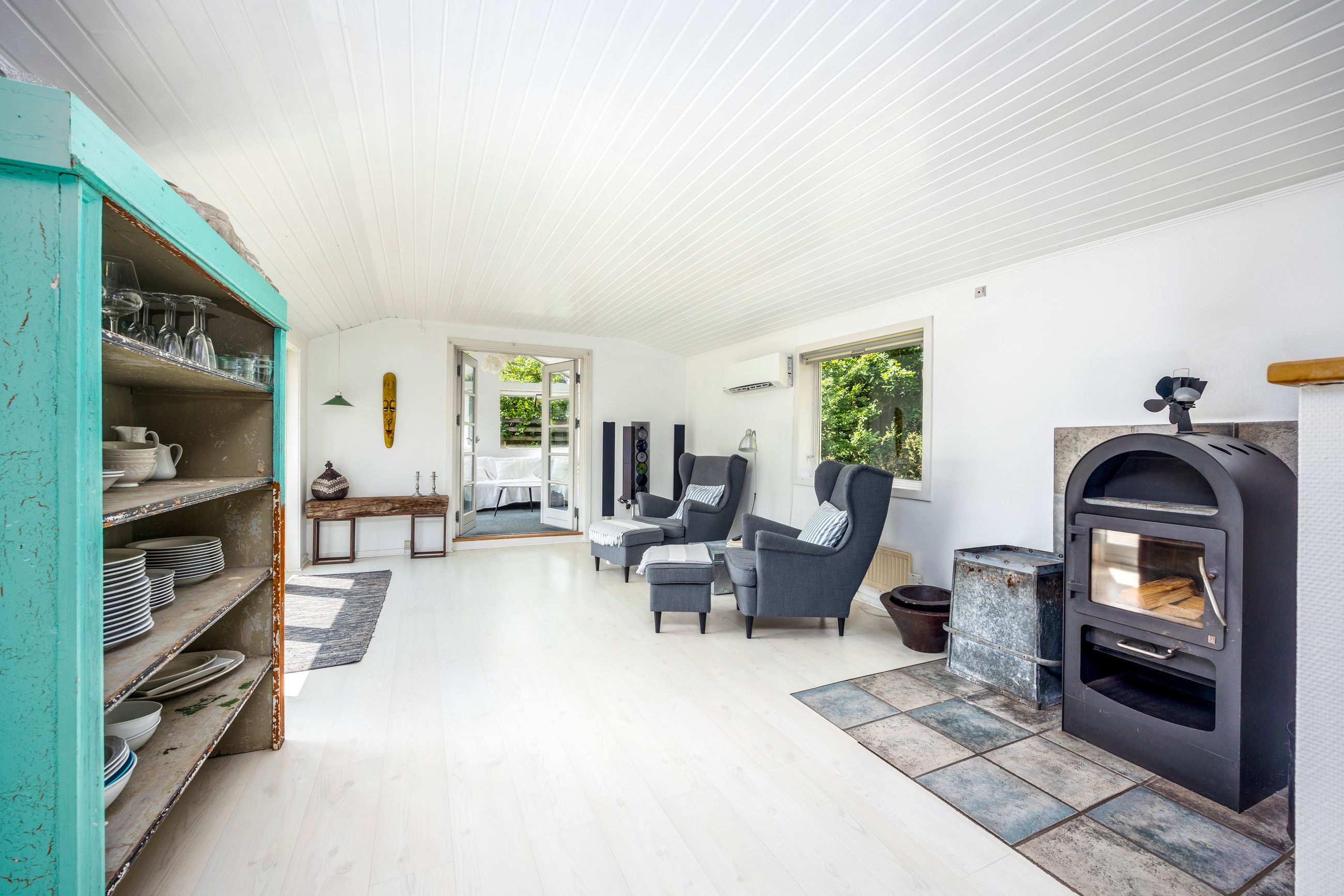 Huset byder på et lyst og åbent opholdsrum med stue og køkken i ét. De store vinduespartier og den direkte udgang til den solrige træterrasse inviterer lyset og naturen helt ind i rummet. Her er der plads til hyggelige måltider, afslappende læsestunder og samvær foran brændeovnen på de køligere aftener. Indretningen er enkel og venlig med et afslappet sommerhusudtryk.