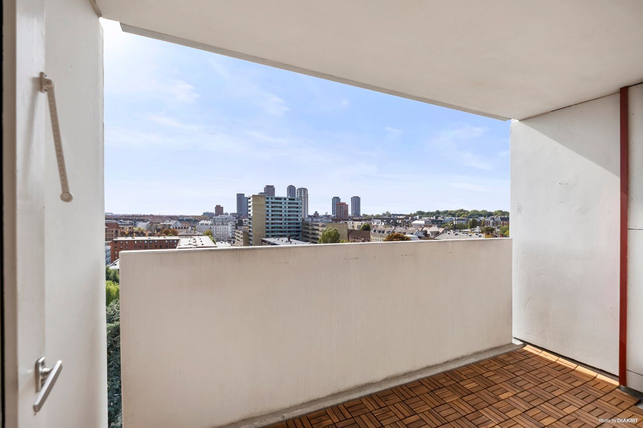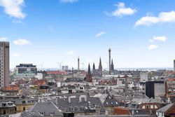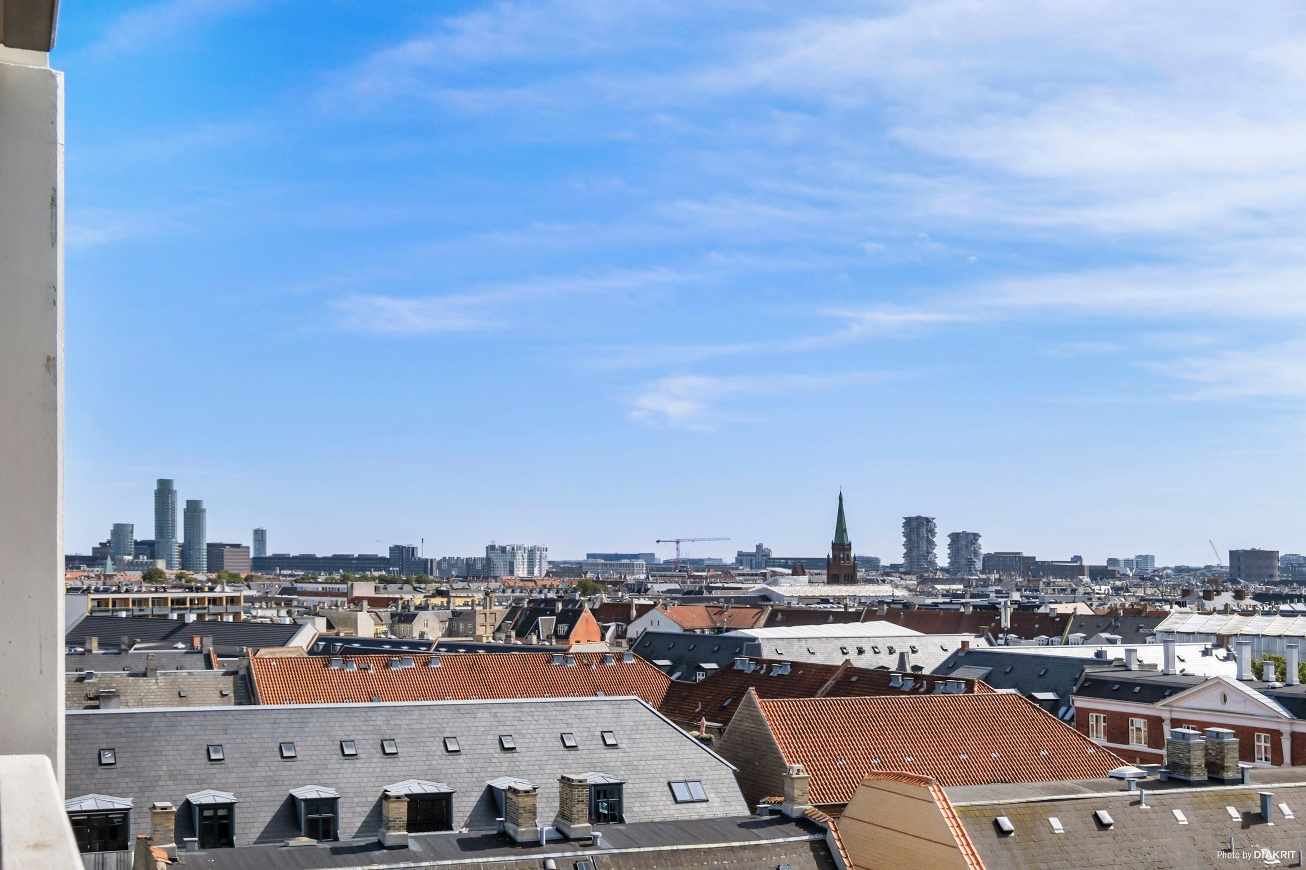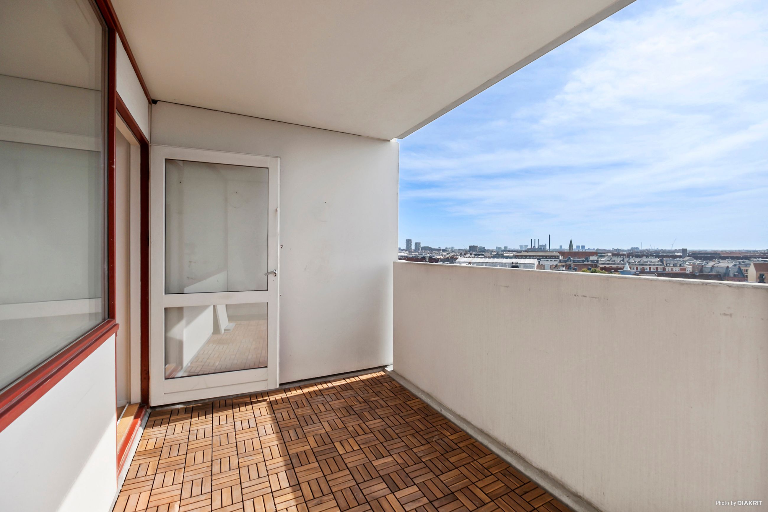 Udsigtslejlighed på 9. sal med frit kig over København. Boligen vender mod syd/sydvest, hvilket giver et stærkt lysindfald dagen igennem. Altanen er stor, sydvendt og ugeneret.