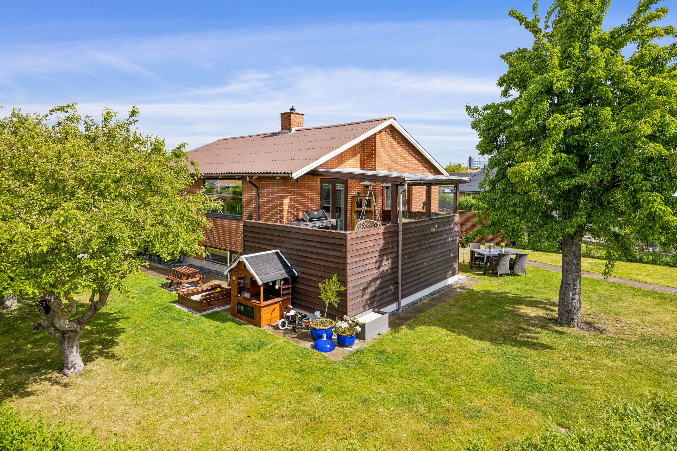 Velkommen til denne skønne murstensbungalow, der er opført i 1965 og byder på et boligareal på 92 kvadratmeter. Ejendommen fremstår velholdt og indflytningsklar med en moderne indretning, der vil tiltale både familier og par. Når du træder indenfor, mødes du af et åbent køkkenalrum, der smelter sammen med den rummelige dagligstue. Herfra er der direkte adgang til en dejlig terrasse, hvor man kan nyde de mange solskinstimer i den sydvestvendte have.