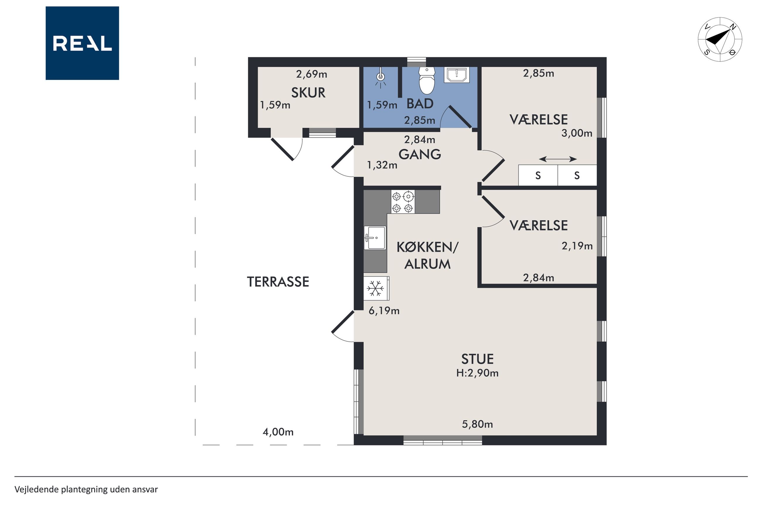 Boligen byder på 57 kvadratmeter boligareal fordelt på to store værelser samt et køkken-alrum med rigelig plads til spisebord. Her kan familie og venner samles om måltiderne og nyde hinandens selskab i lyset fra de store vinduer, der bader rummet i naturligt lys.
