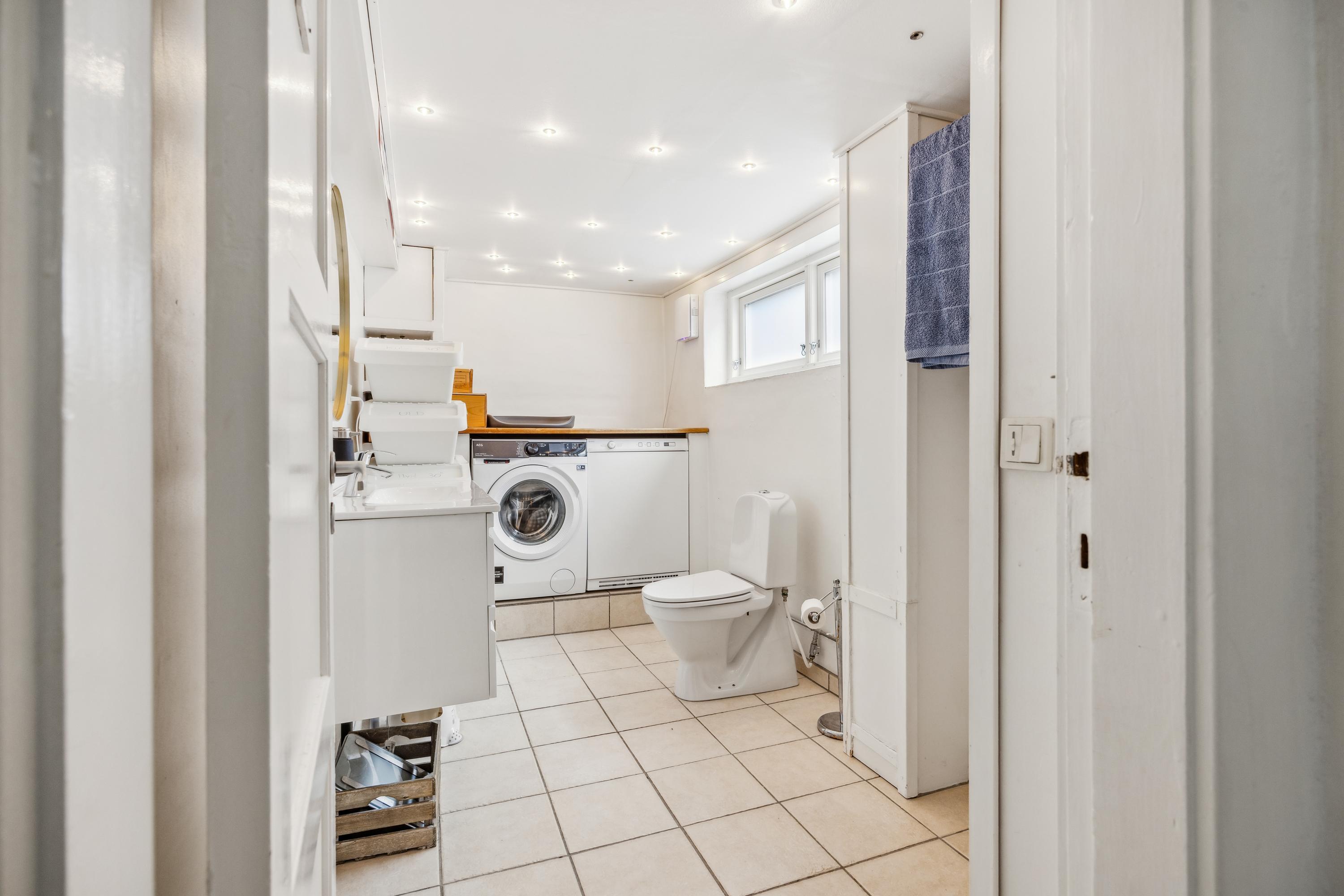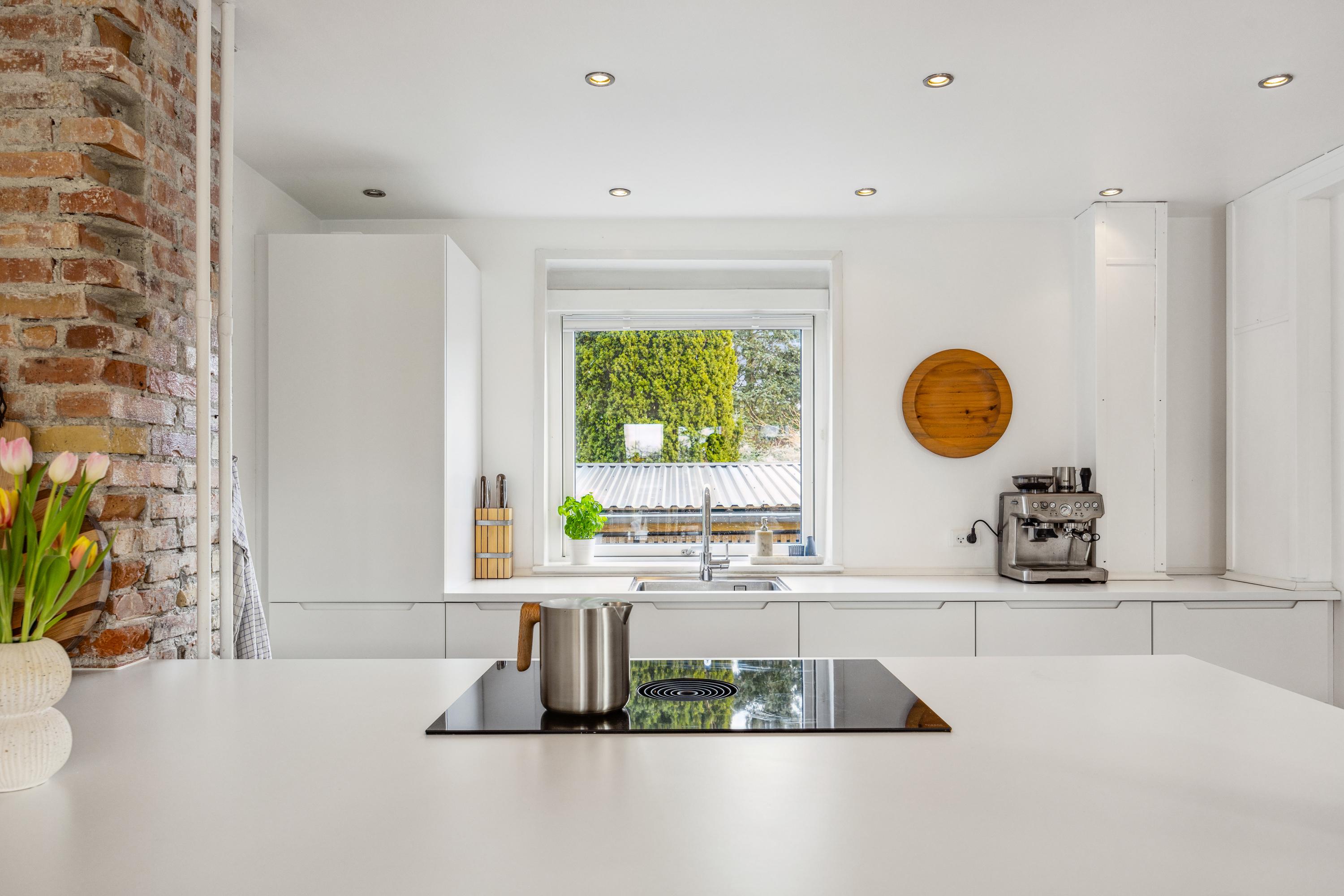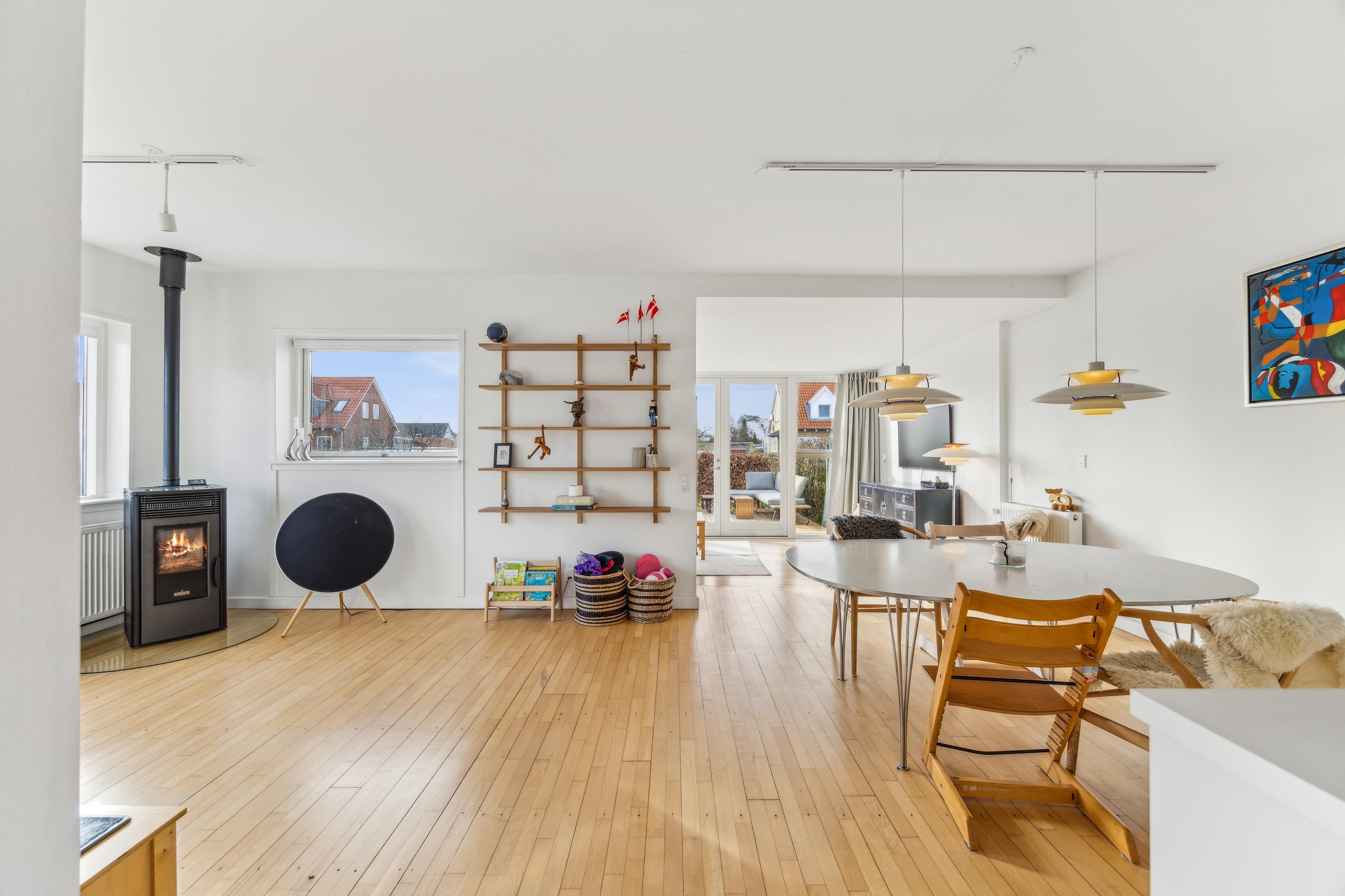 Velkommen til denne fantastiske ejendom, der tilbyder en unik kombination af charme fra 1954 og moderne bekvemmeligheder. Dette dobbelthus i tre plan byder på et åbent stueetage-design, hvor køkkenalrummet er husets hjerte. Det stilfulde køkken med hvide fronter åbner op mod både spise- og
