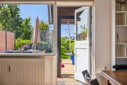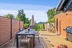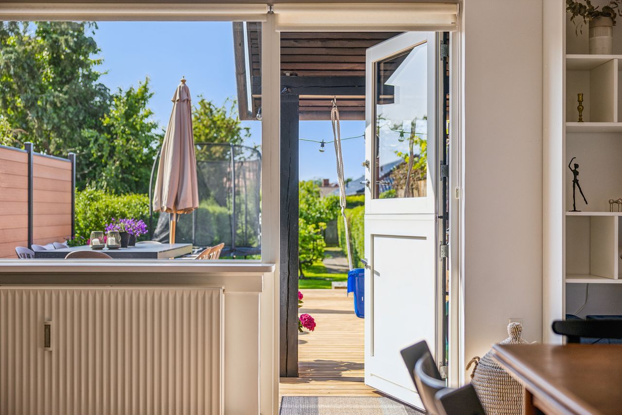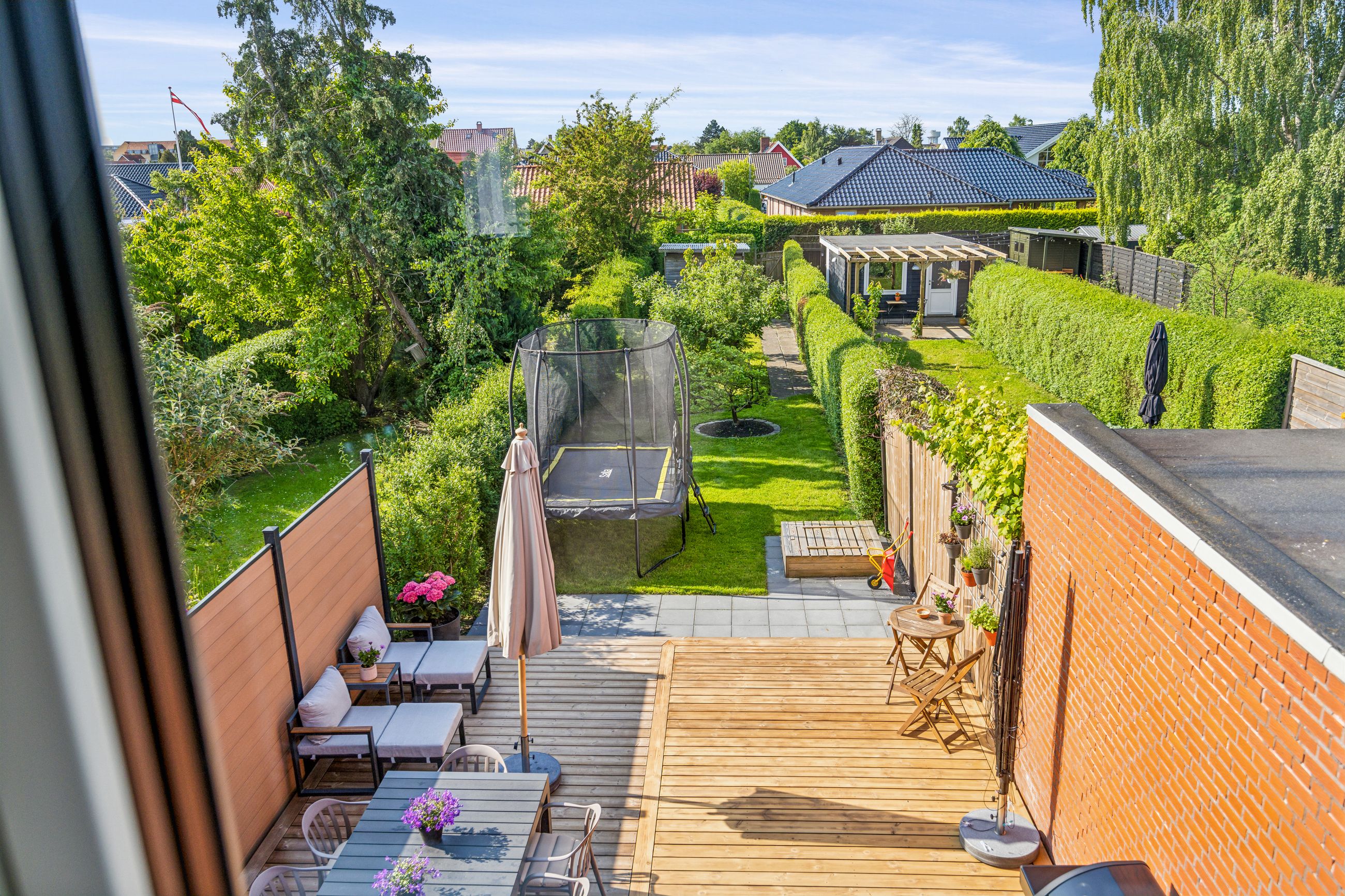 Fra stuen er der direkte adgang til en skøn træterrasse, som giver jer mulighed for at få frisk luft inden døre og forlænge opholdsarealet udendørs. Her kan man nyde solen i dagtimerne og slappe af på lune sommeraftener. Den fantastiske terrasse suppleres af et dejligt havestykke, hvor I kan skabe jeres egen oase midt i byen. Haven er sydvendt og giver rig mulighed for at sætte sit eget præg – om det så skal være blomsterbede eller en køkkenhave.