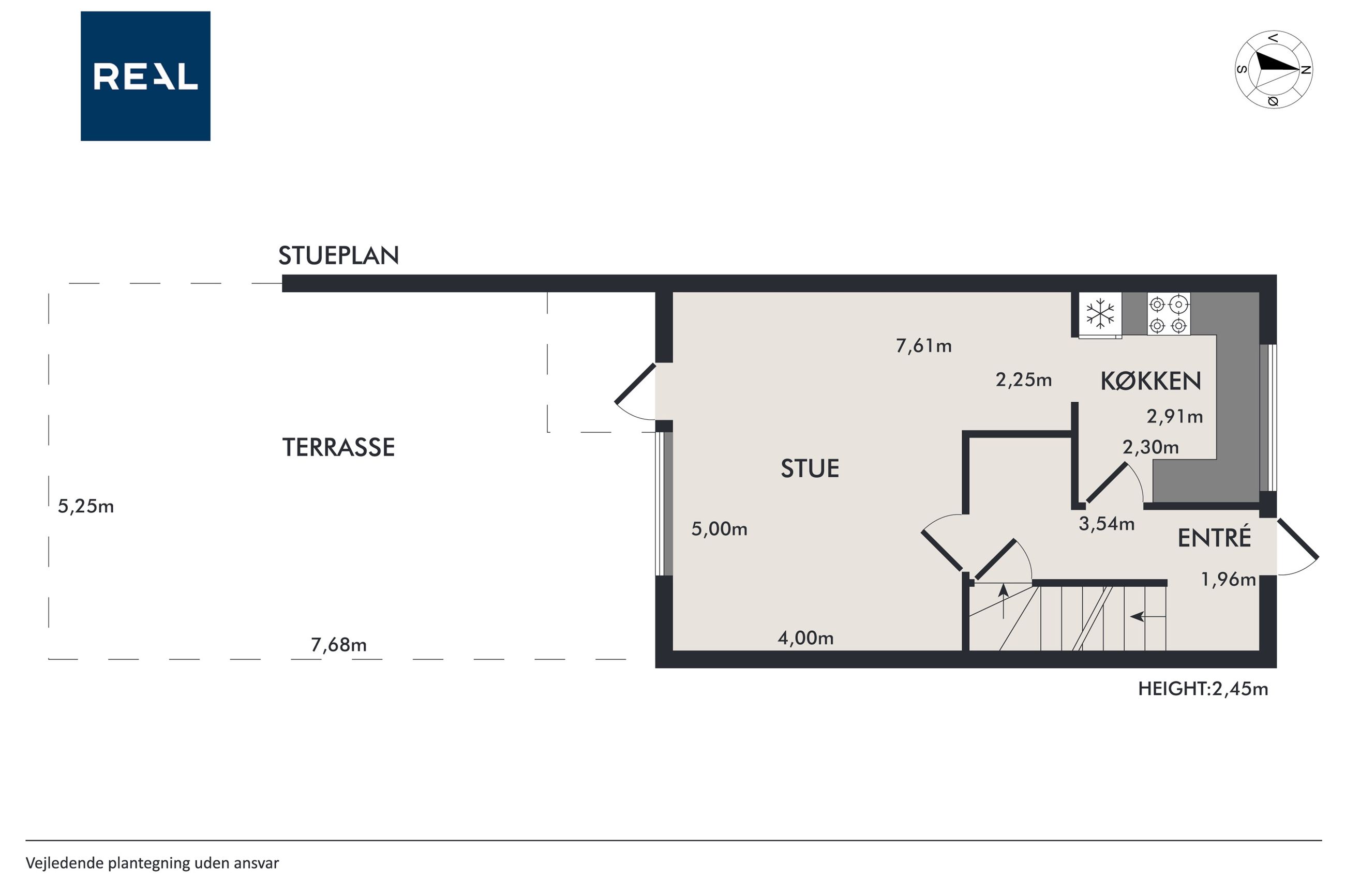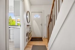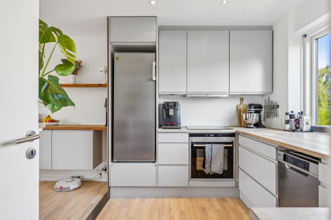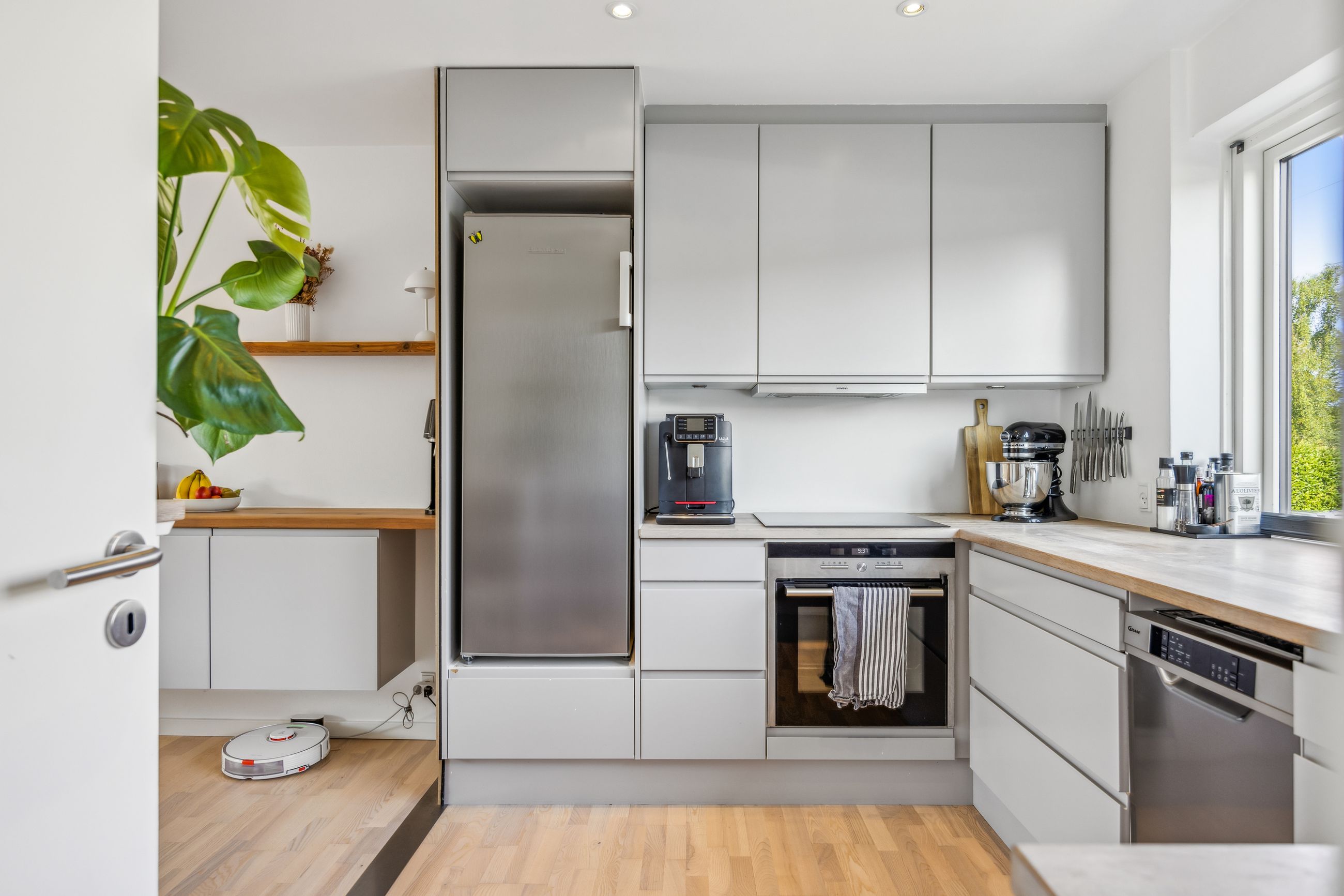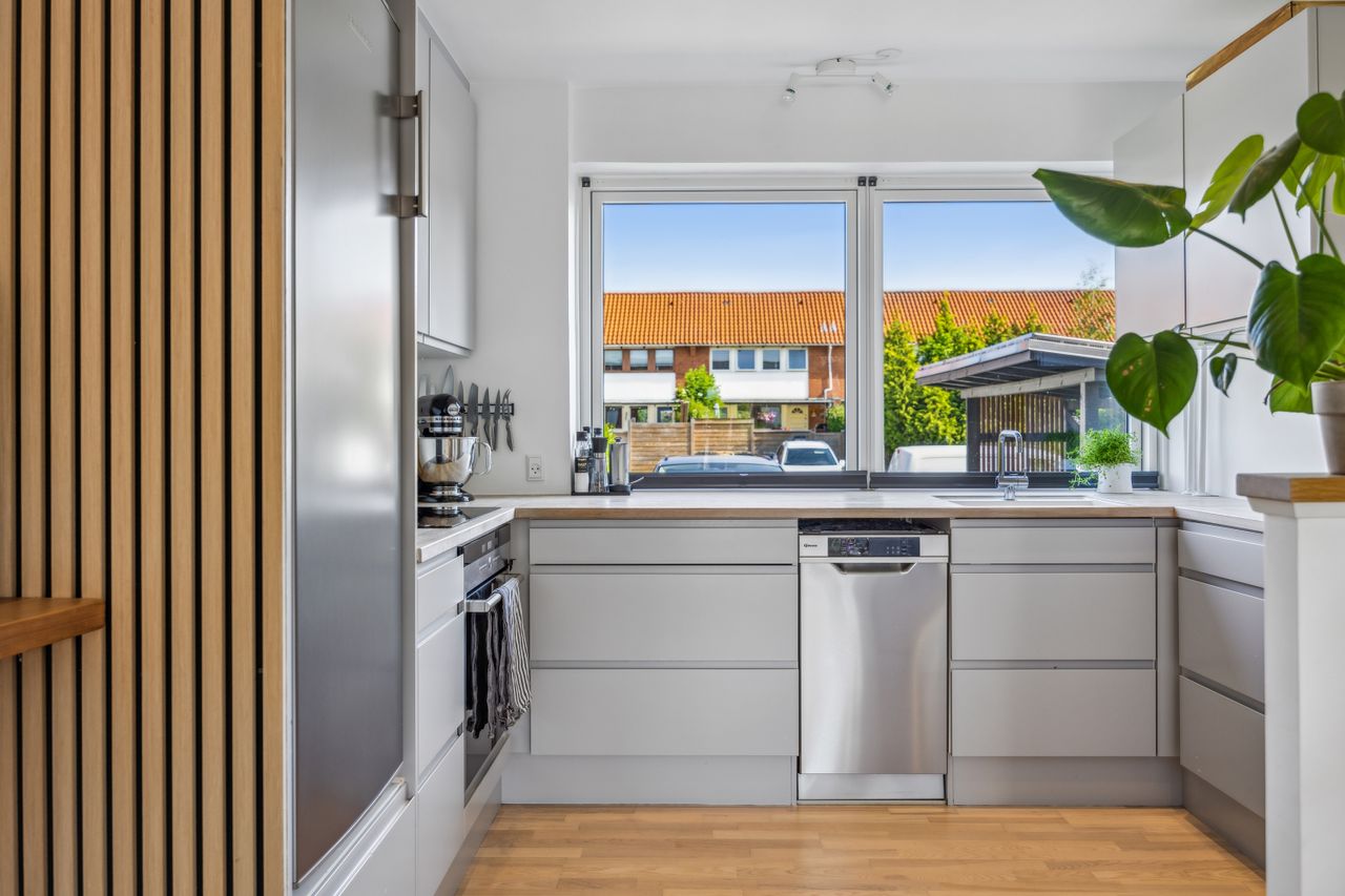 Når du træder ind i den lyse entré, vil du straks føle dig hjemme. Herfra åbner boligen sig op mod et lyst og stilrent køkken med en elegant træbordplade – et naturligt samlingspunkt for madlavning og samvær. Køkkenet ligger i åben forbindelse med den rummelige stue, hvor familiens dagligdag kan udfolde sig frit. Stuen er nem at indrette lige efter jeres ønsker med plads til både spiseafdeling og et hyggeligt sofaområde.