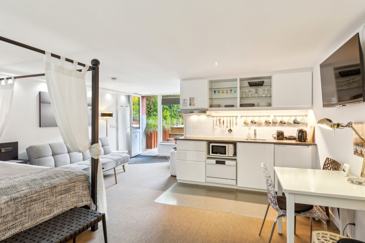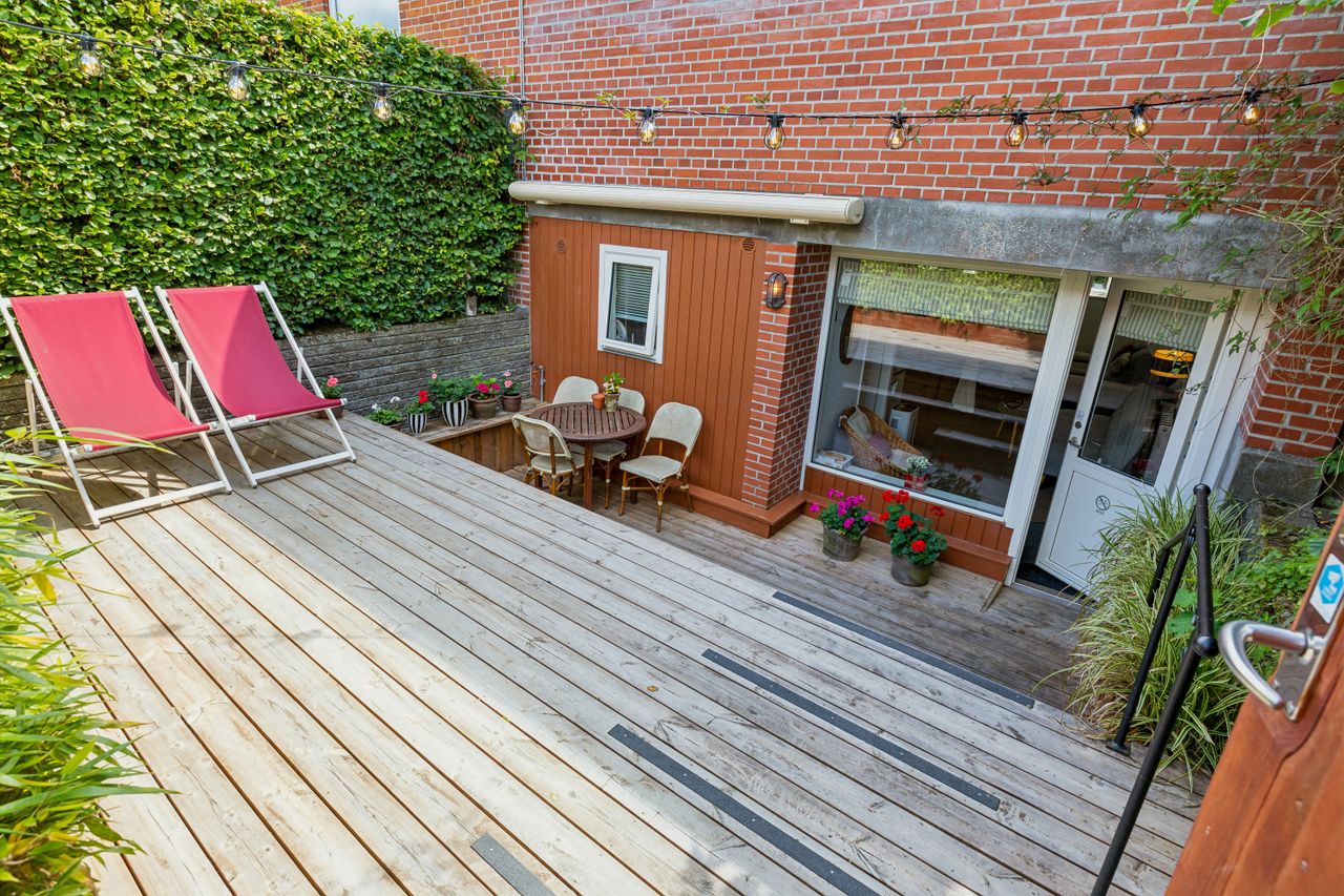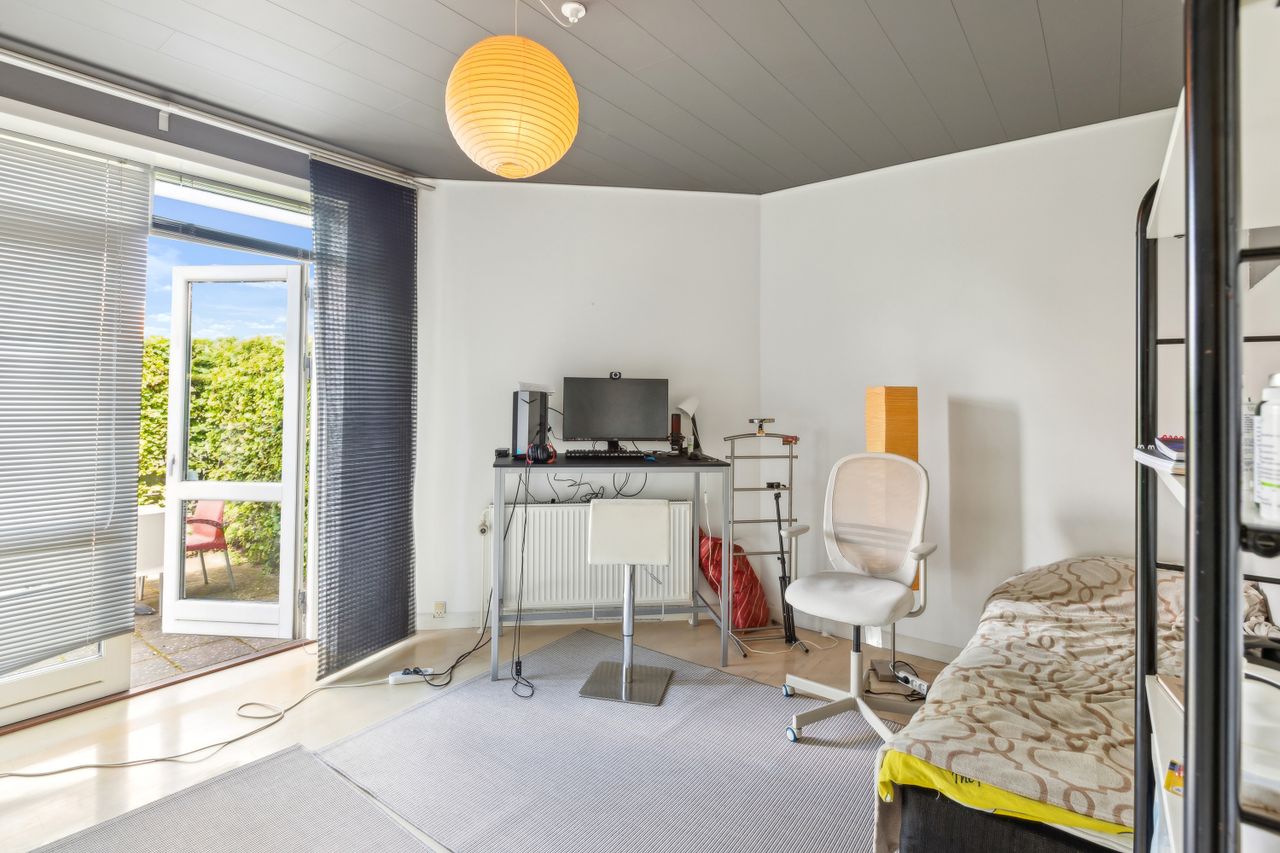 Den tidligere dobbeltgarage er nu omdannet til en luksuriøs studiolejlighed på 34 m2 med egen indgang og privat terrasse. Lejligheden har fuldt udstyret køkken, eget badeværelse samt opholds- og spiseplads – alt hvad man behøver for komfortabelt ophold. Med sin attraktive udlejningshistorik via Airbnb og Booking.com kan lejligheden generere betydelige lejeindtægter eller bruges som teenagerafdeling eller gæstebolig.