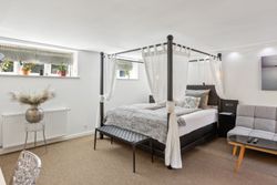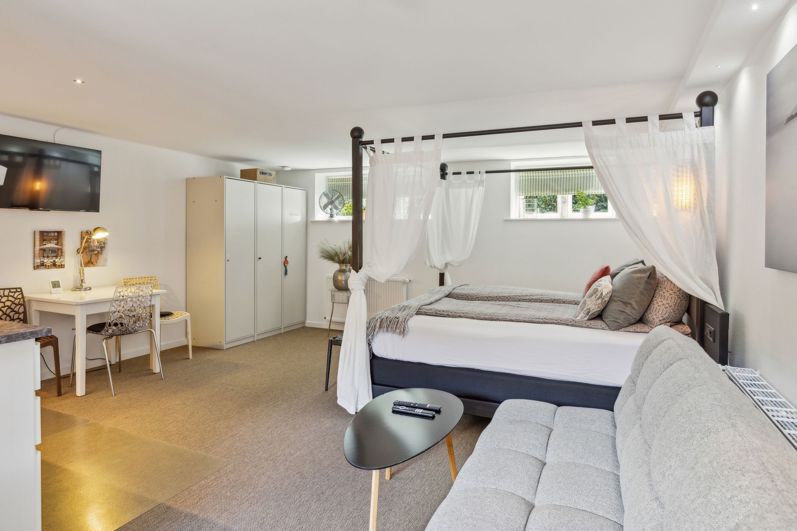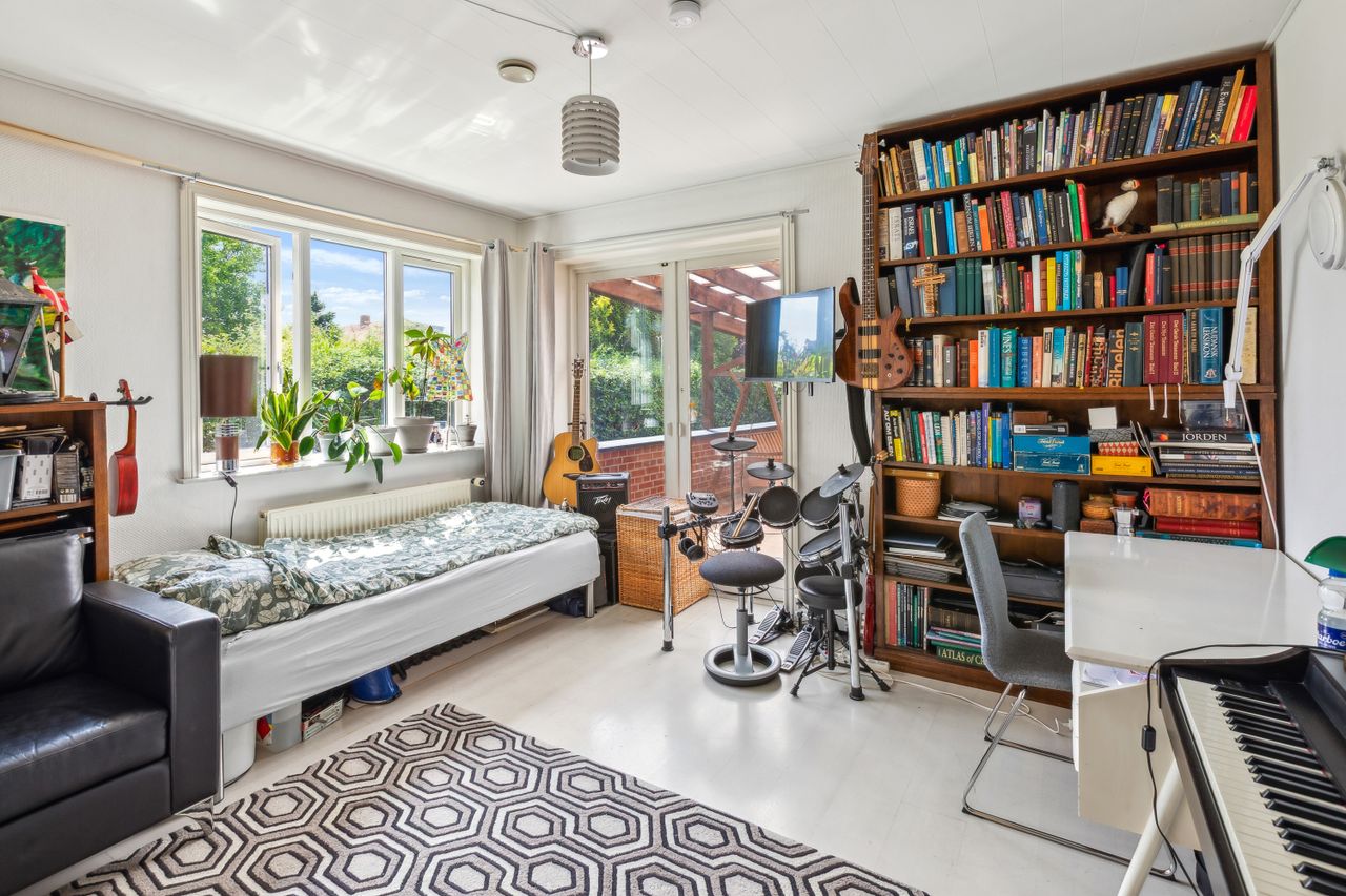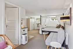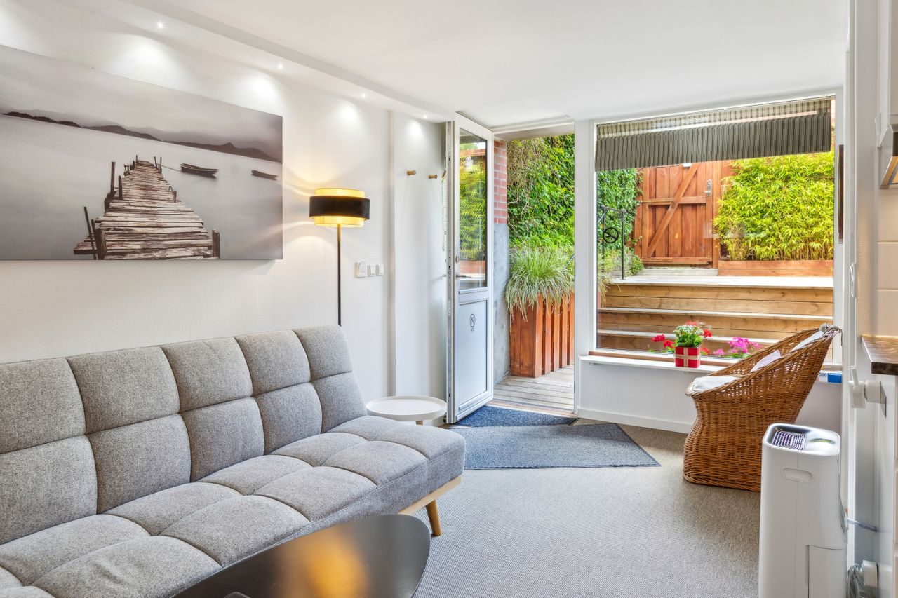 Den tidligere dobbeltgarage er nu omdannet til en luksuriøs studiolejlighed på 34 m2 med egen indgang og privat terrasse. Lejligheden har fuldt udstyret køkken, eget badeværelse samt opholds- og spiseplads – alt hvad man behøver for komfortabelt ophold. Med sin attraktive udlejningshistorik via Airbnb og Booking.com kan lejligheden generere betydelige lejeindtægter eller bruges som teenagerafdeling eller gæstebolig.