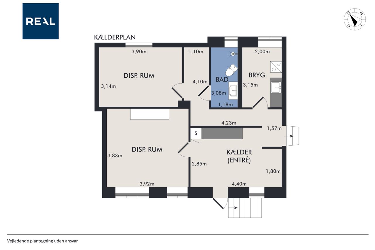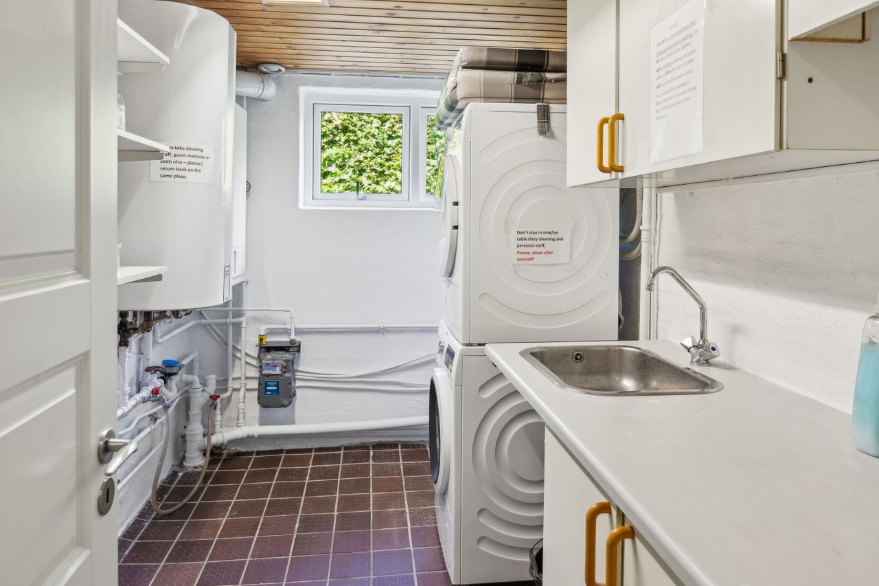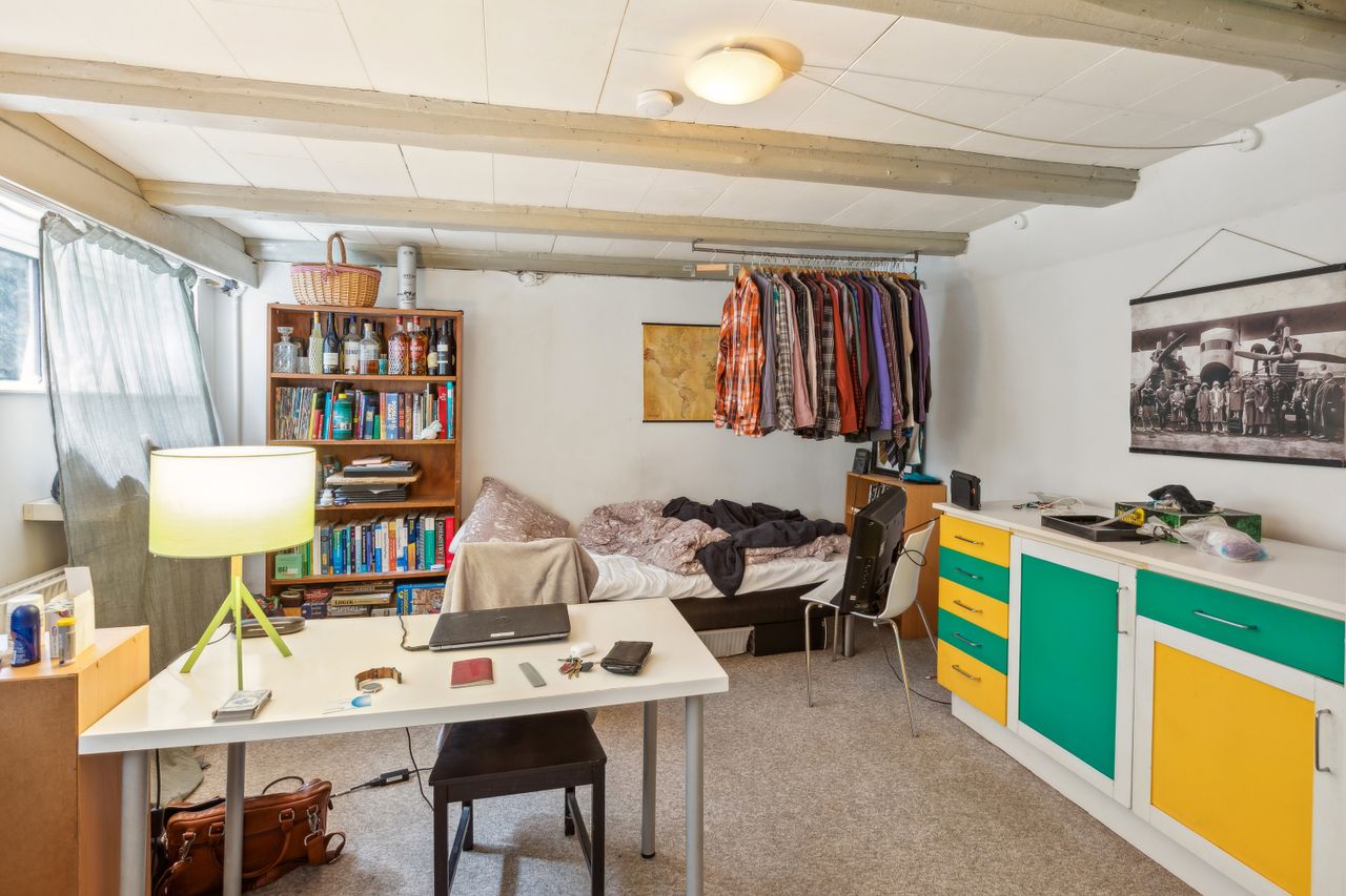 Kælderen på 114 m2 er et kapitel for sig selv. Med sin gode loftshøjde og tørre, isolerede forhold tilbyder den mange anvendelsesmuligheder. Her findes et badeværelse med brus, to disponible rum samt et vaskerum og opholdsrum/tekøkken. Egen nedgang fra haven gør kælderen særdeles praktisk.