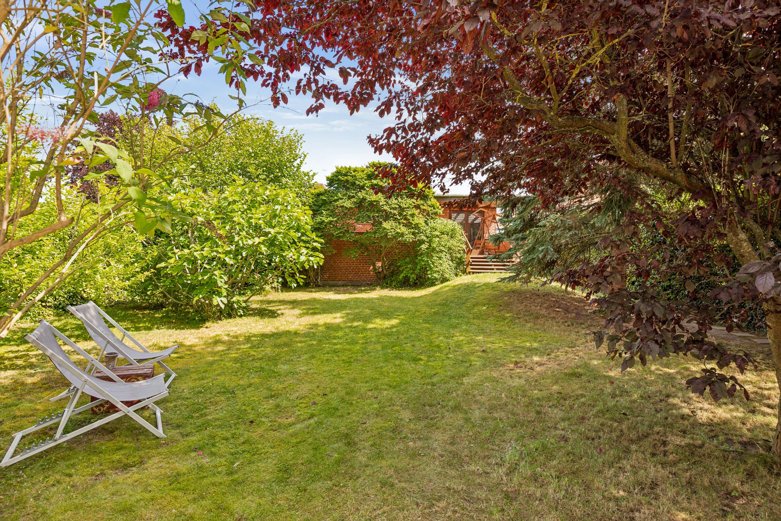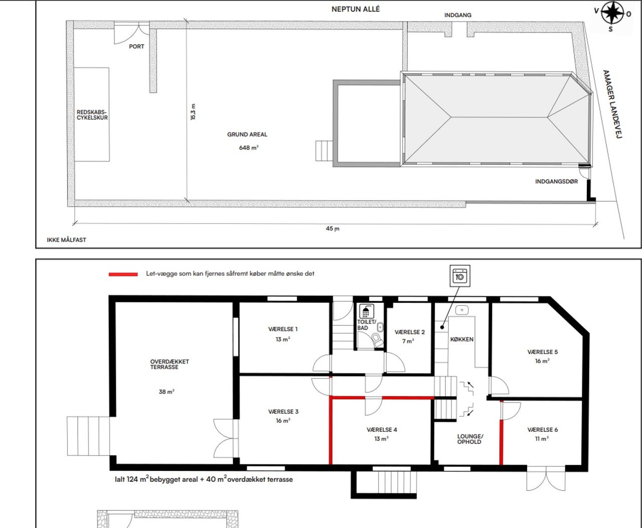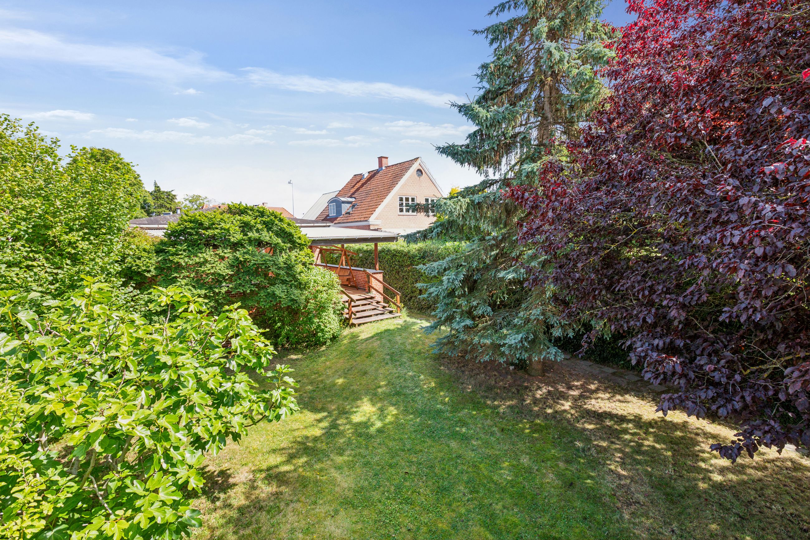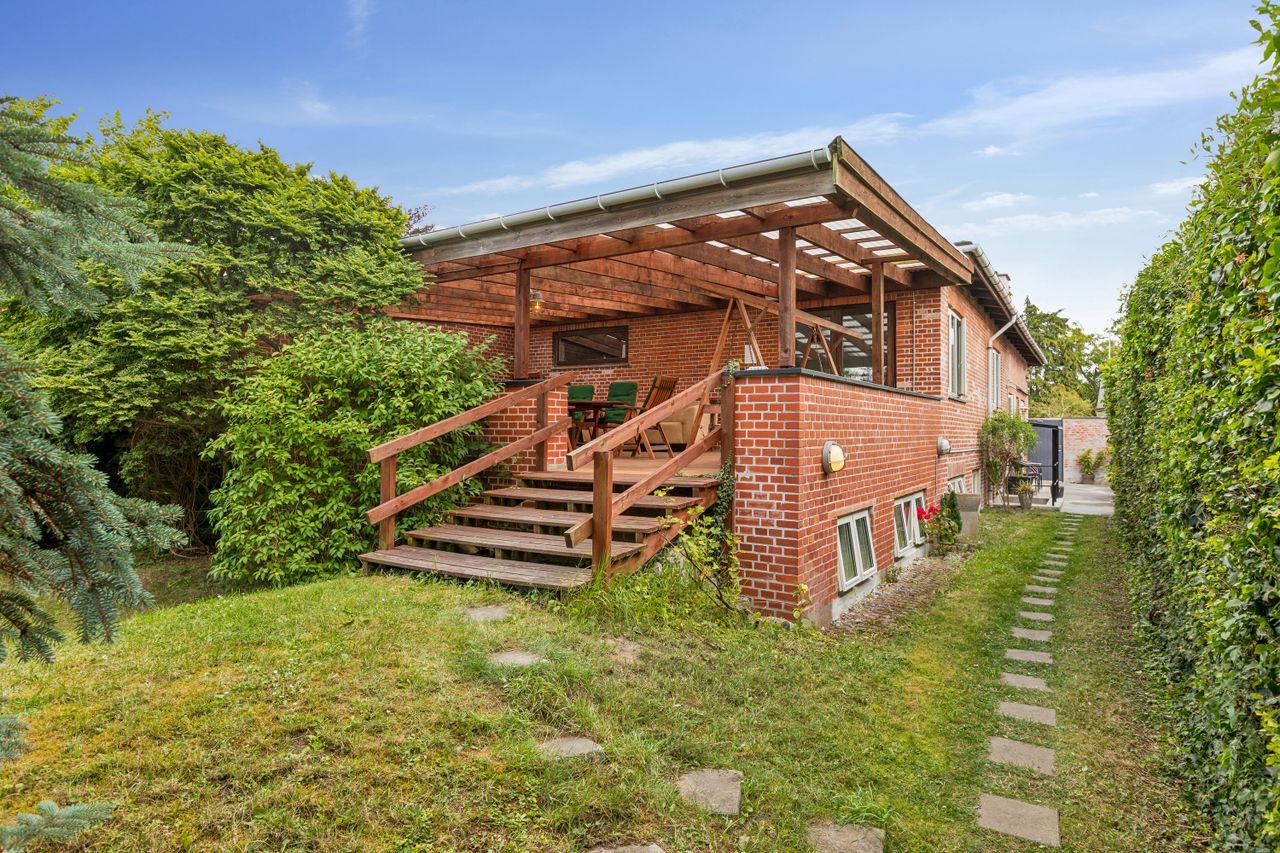 Grunden strækker sig over 648 m2 med en vestvendt baghave fyldt med sollys det meste af dagen. Den overdækkede terrasse giver mulighed for afslapning uanset vejret, mens redskabsskuret og cykelparkeringen sørger for praktiske løsninger i hverdagen.