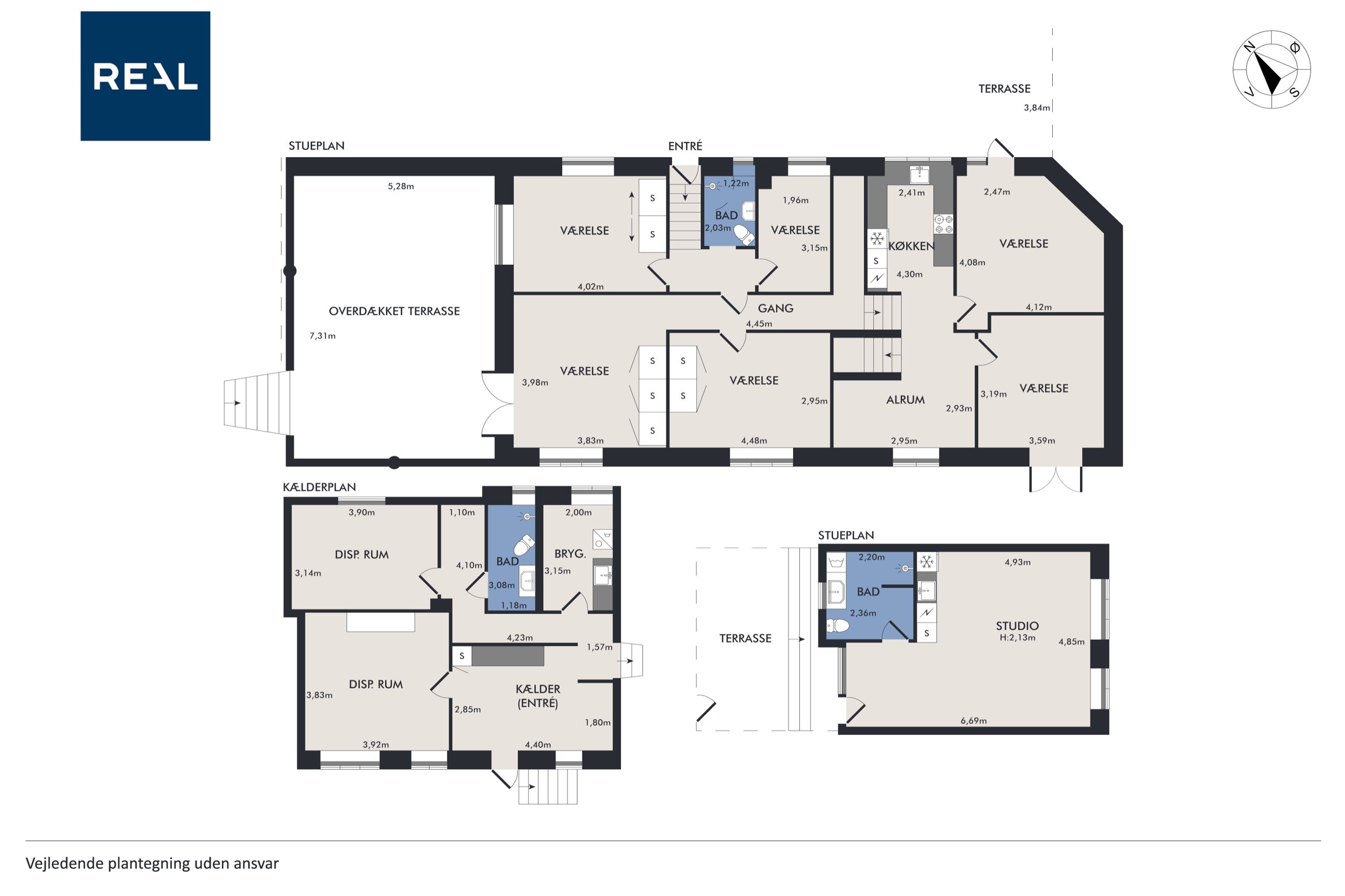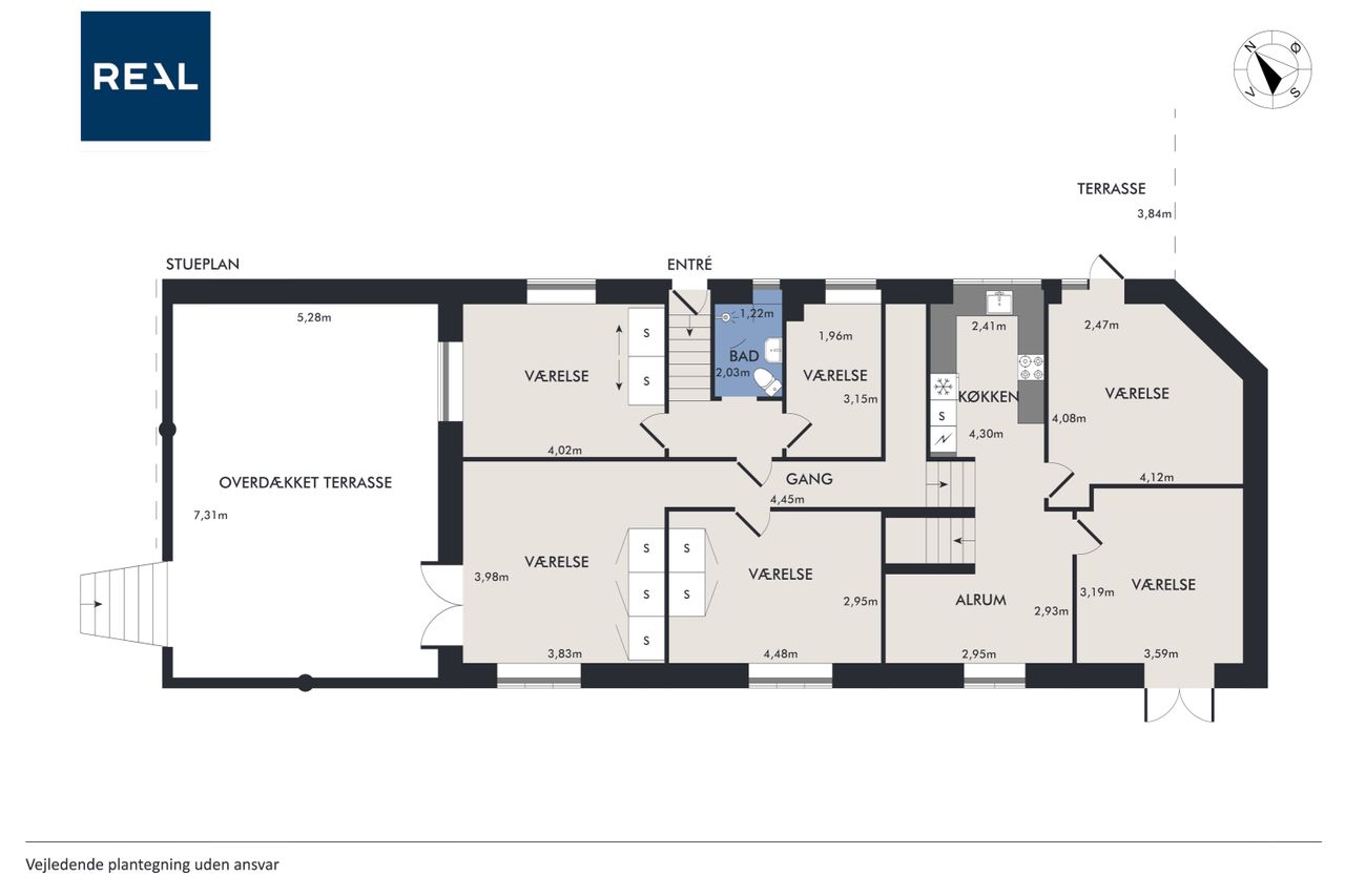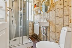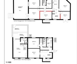 Villaen er i dag opdelt i 8 værelser, der alle anvendes til udlejning. Men huset kan, af sælger, genetableres som en rummelig familievilla, med: