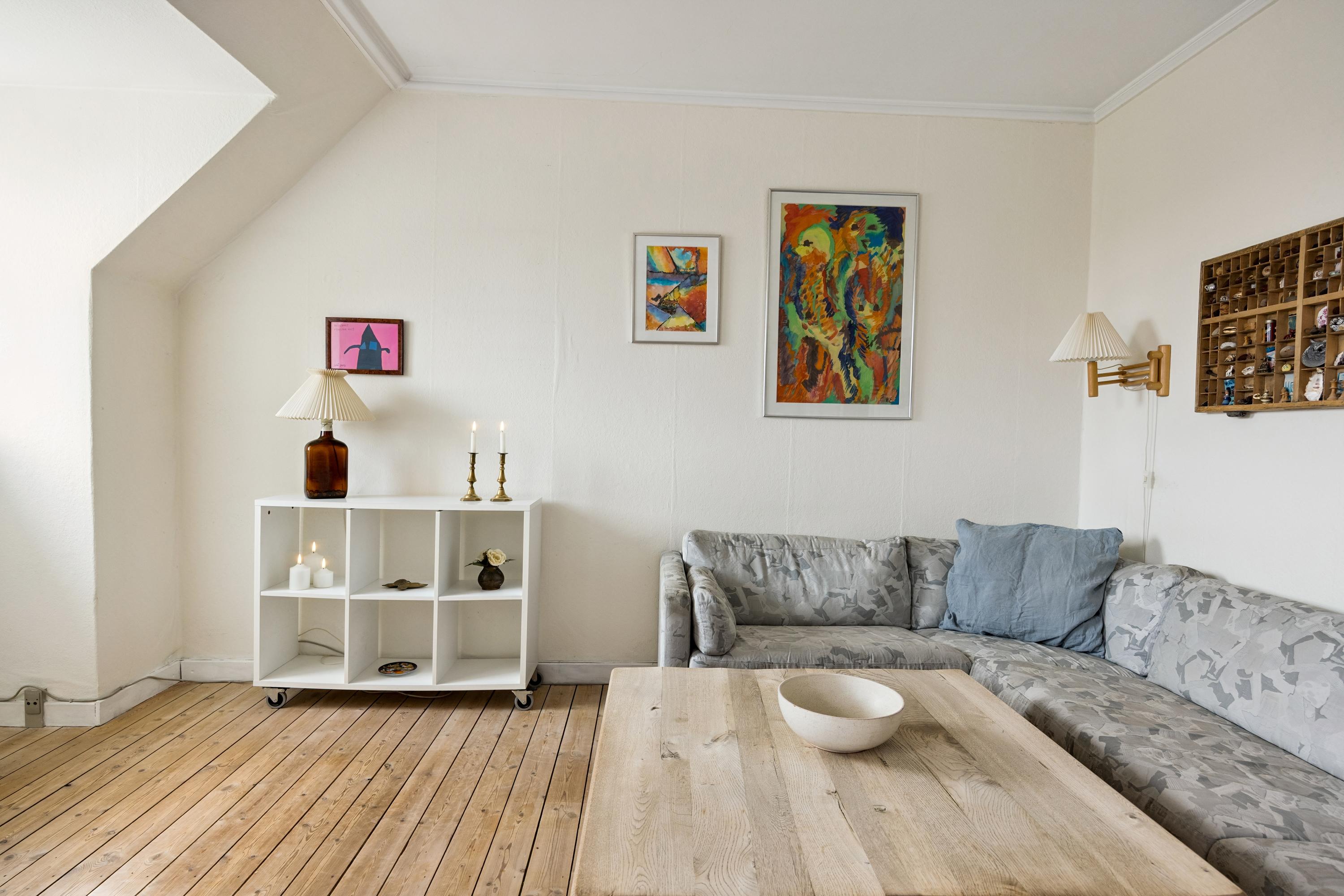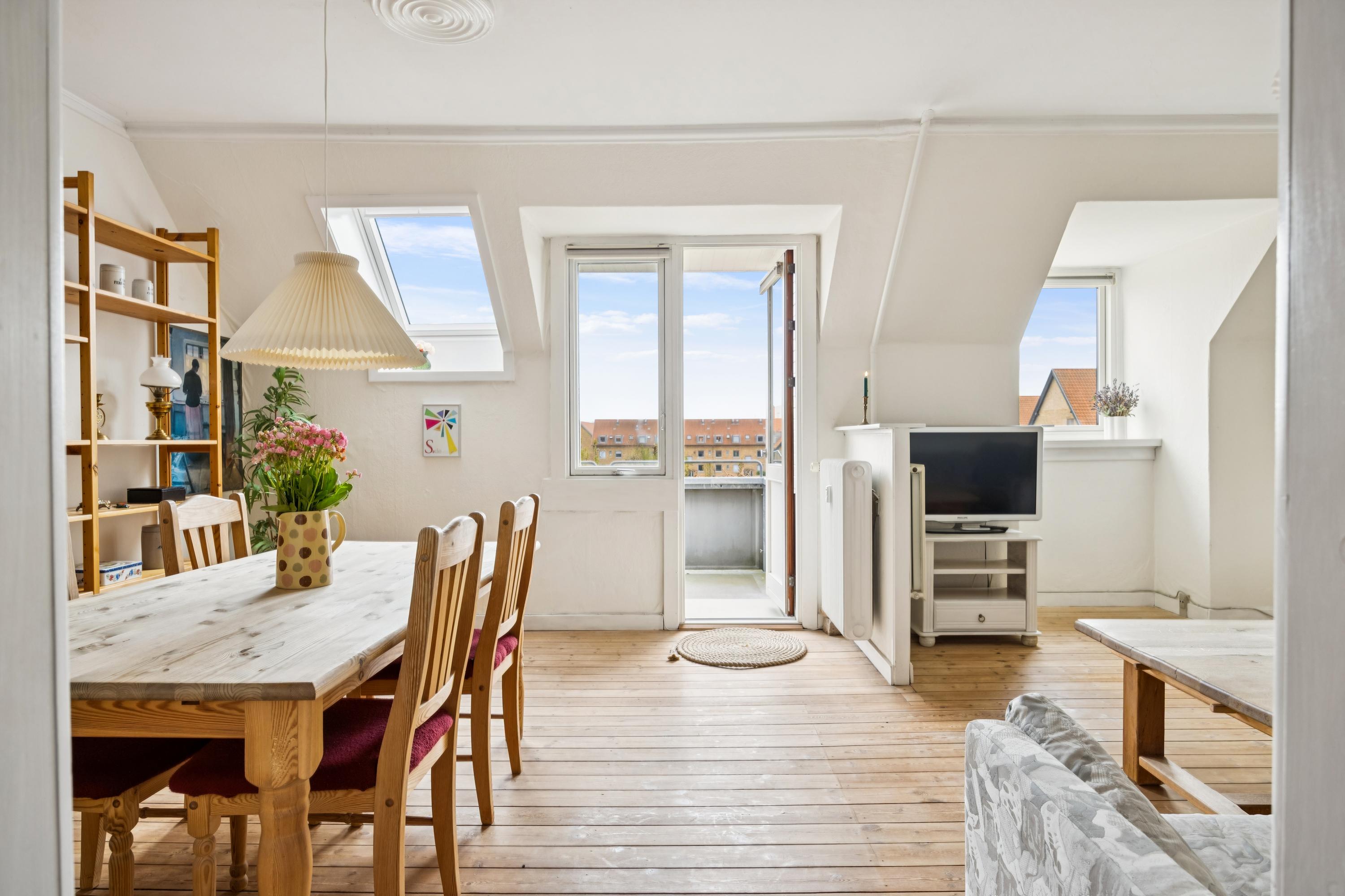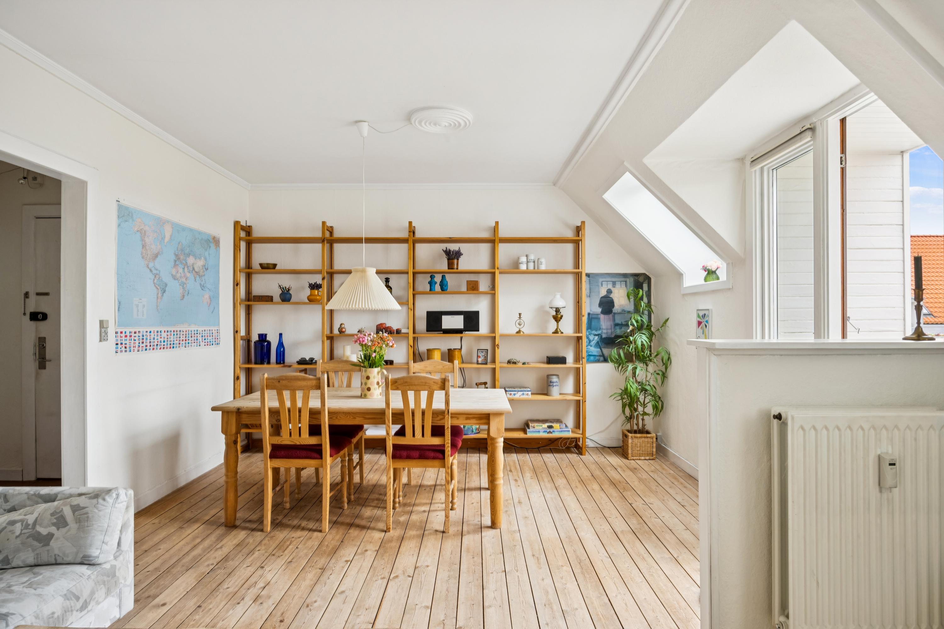 Velkommen til denne charmerende ejerlejlighed, der er en sand perle for dem, der søger et hjem med både karakter og komfort. Lejligheden byder på en fantastisk lys stue, hvor de store vinduer lader solens stråler strømme ind og skaber en varm og indbydende atmosfære. Fra stuen har du direkte adgang