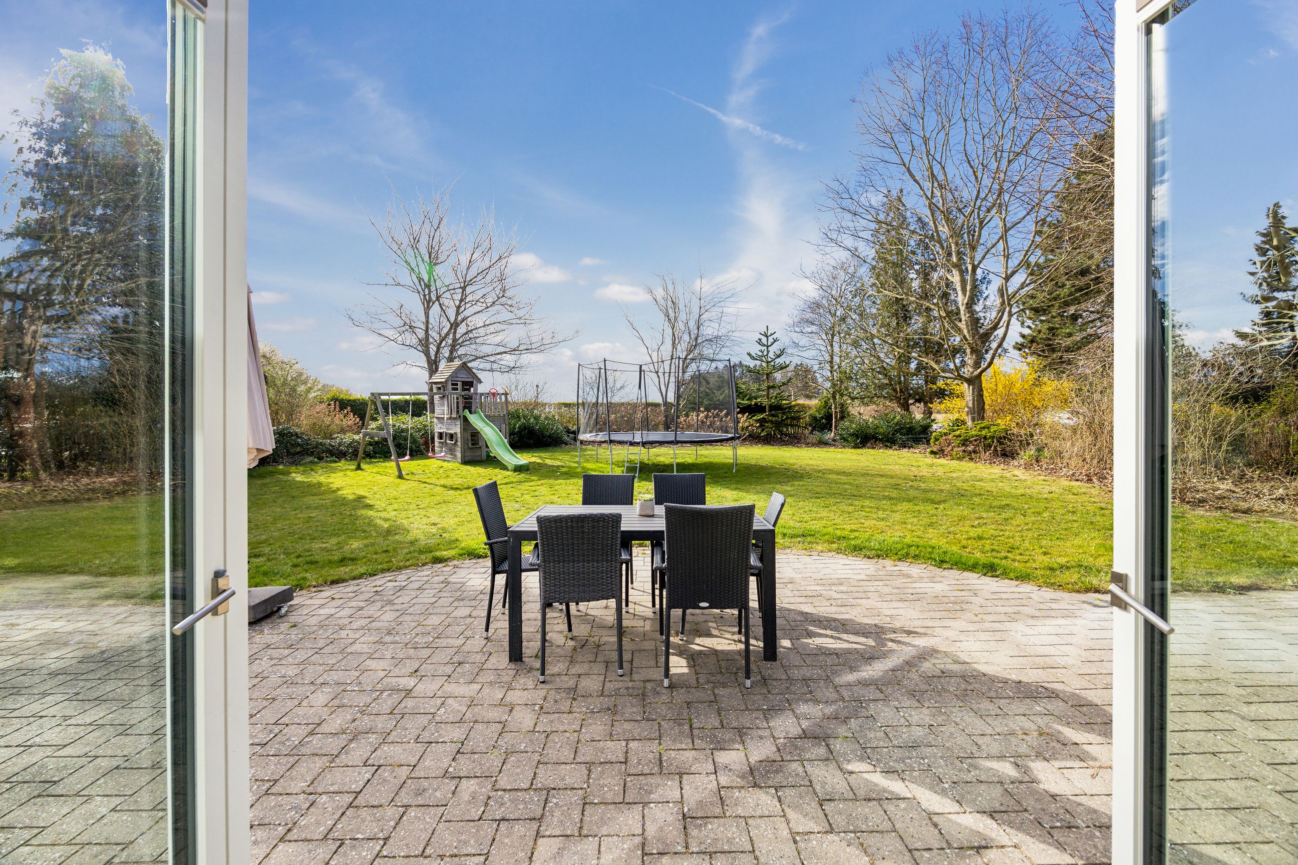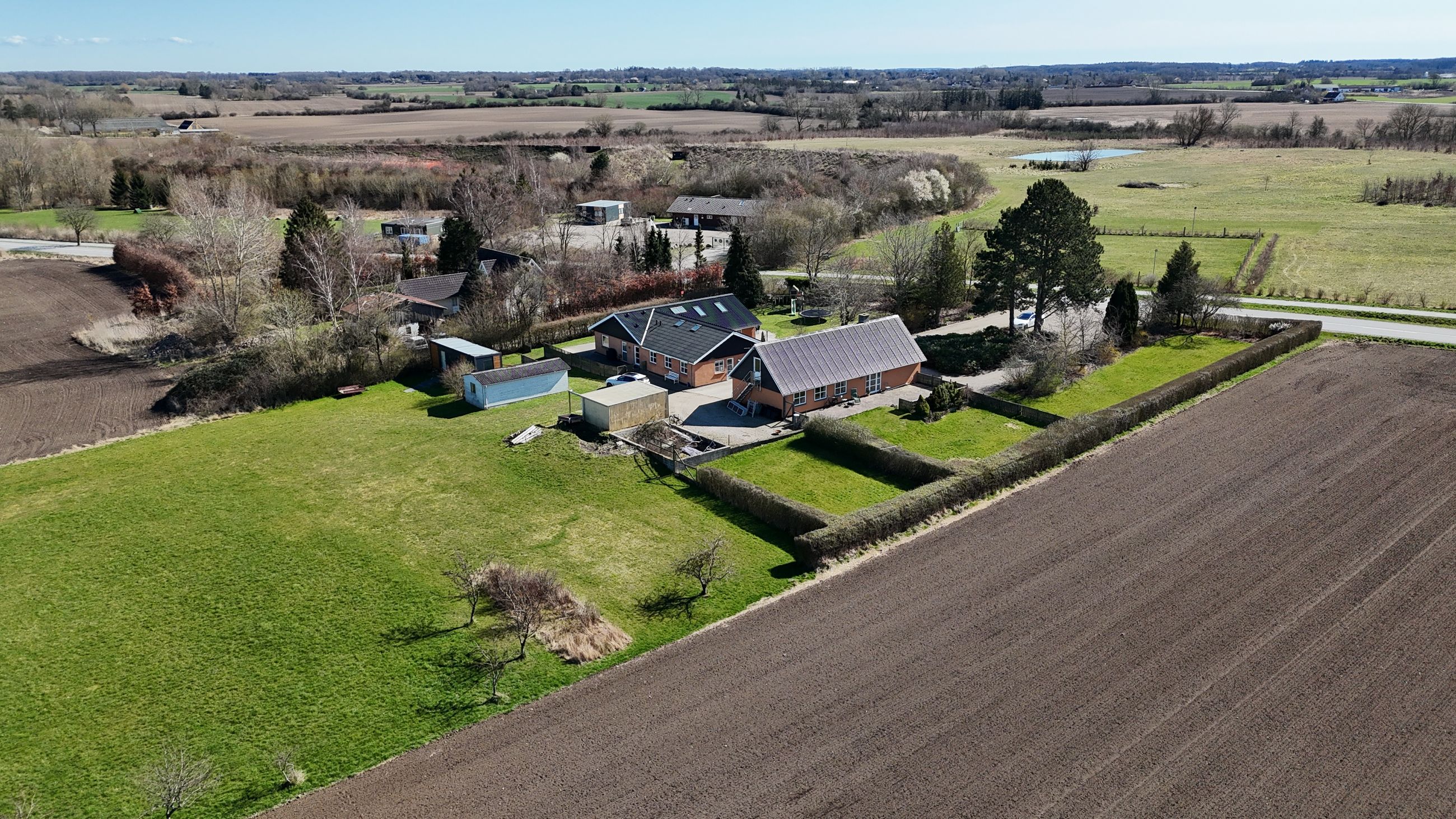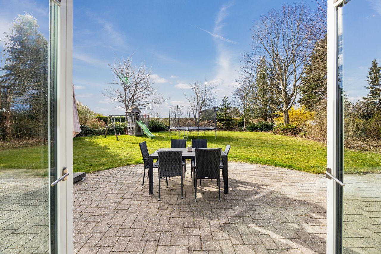 Ejendommens udearealer strækker sig over mere end fem hektar fantastisk landjord – perfekt til dyrehold eller blot at nyde naturen omkring dig. De idylliske omgivelser inviterer til lange gåture langs de nærliggende stisystemer lige udenfor døren.