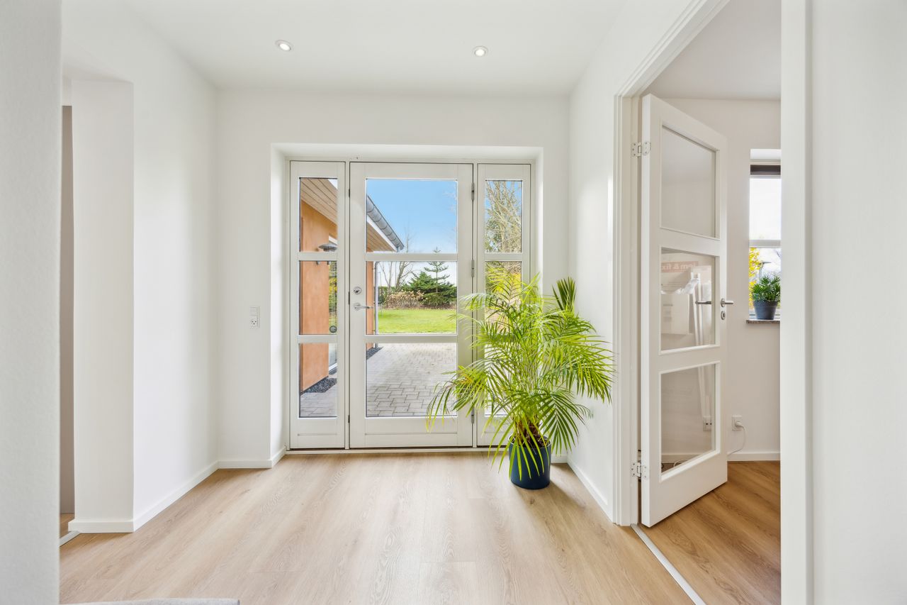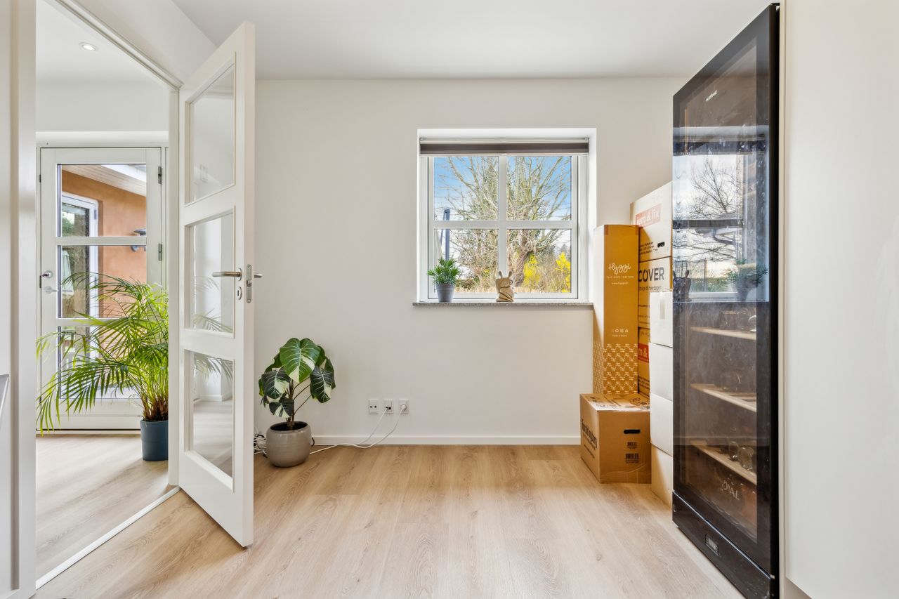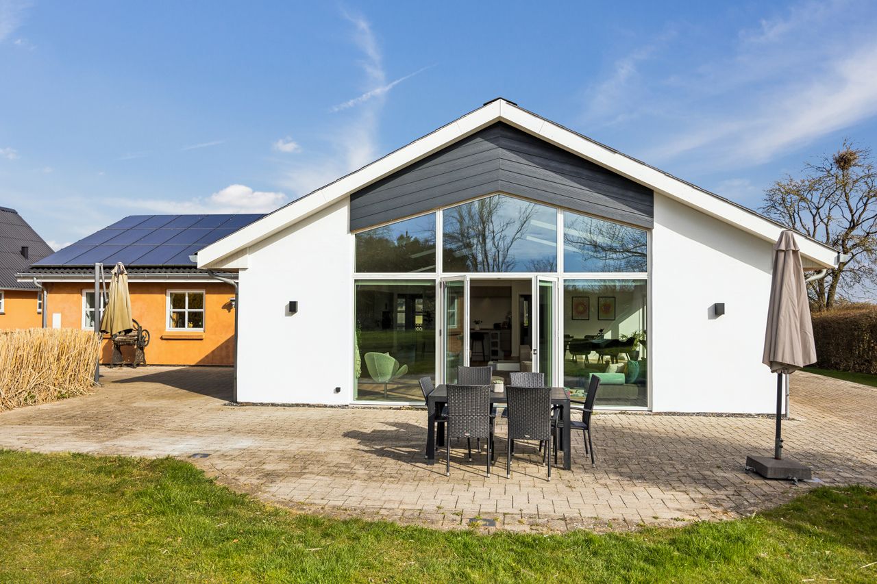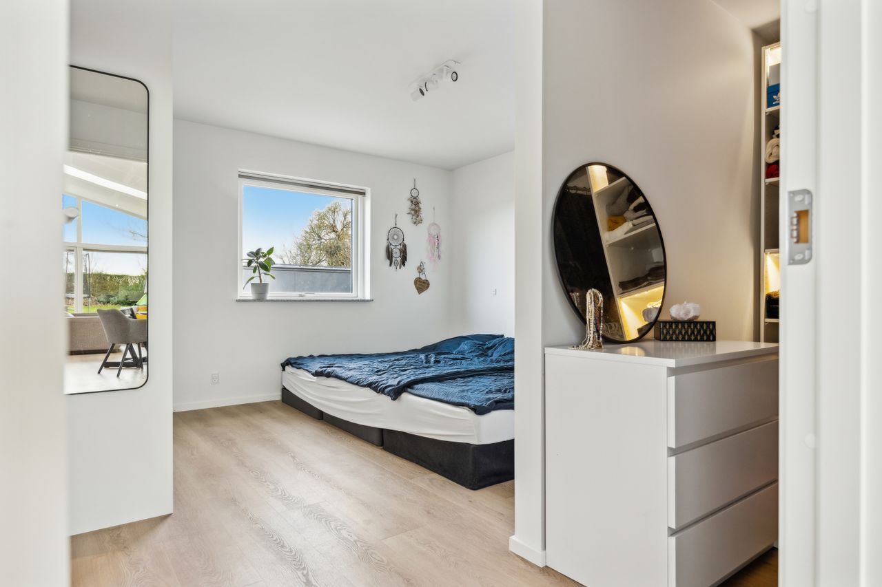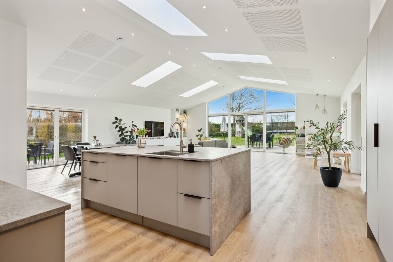 Hovedhuset er indrettet med fokus på rummelighed og lysindfald. Det åbne køkken-alrum imponerer med loft til kip, gulvvarme og flotte indskudte akustikpaneler, der sikrer en behagelig lydoplevelse. Det nye køkken er udstyret med stilfulde elementer og ovenlys, som skaber en lys og indbydende atmosfære. Forældreafdelingen byder på rigelig skabsplads samt eget badeværelse, mens børneafdelingen har tre gode værelser og eget bad – alt sammen udført i en enormt flot finish.