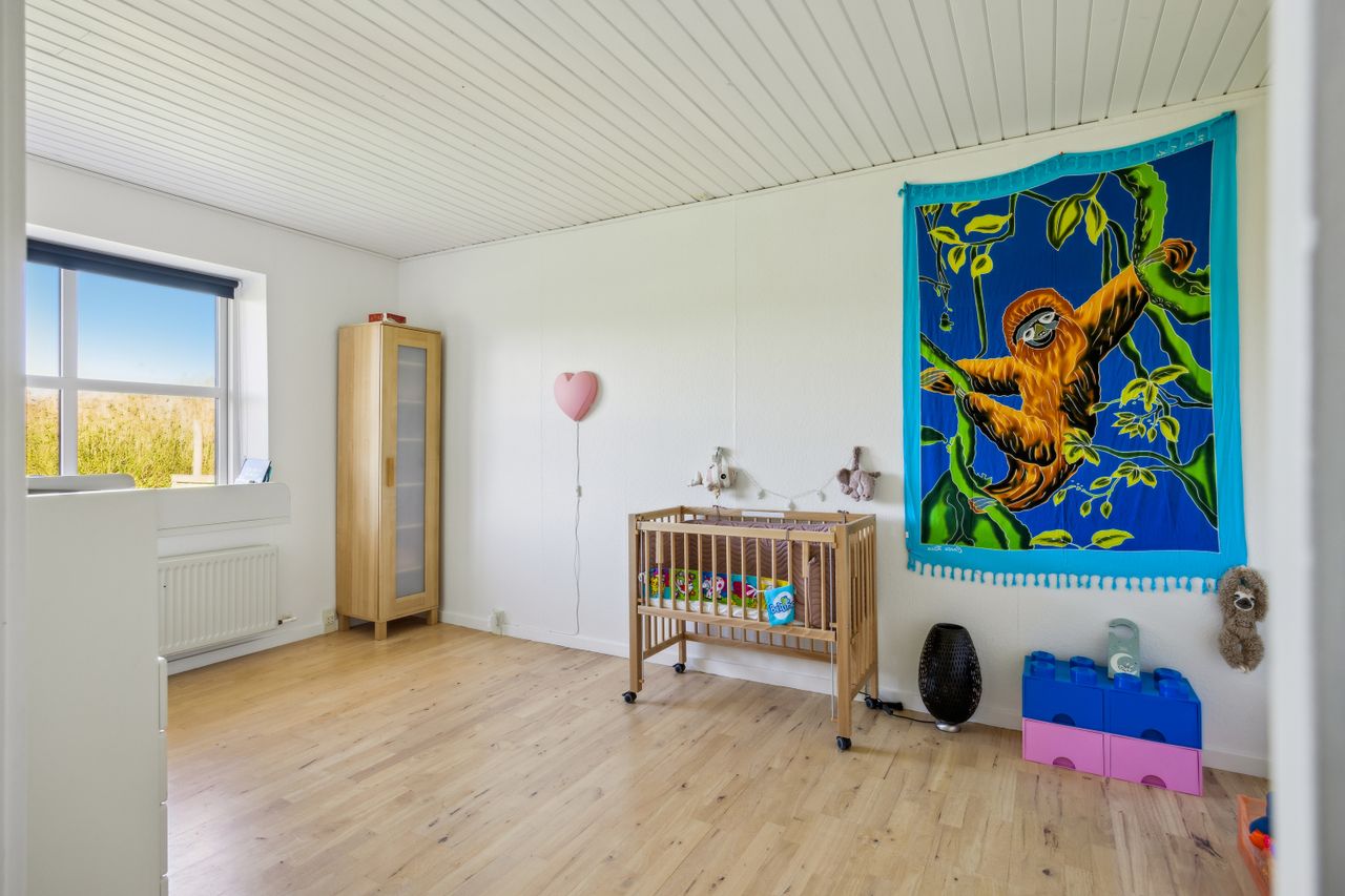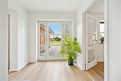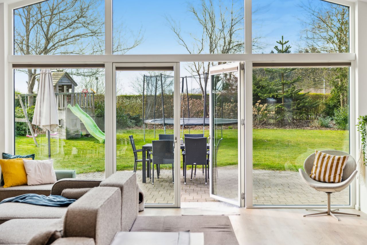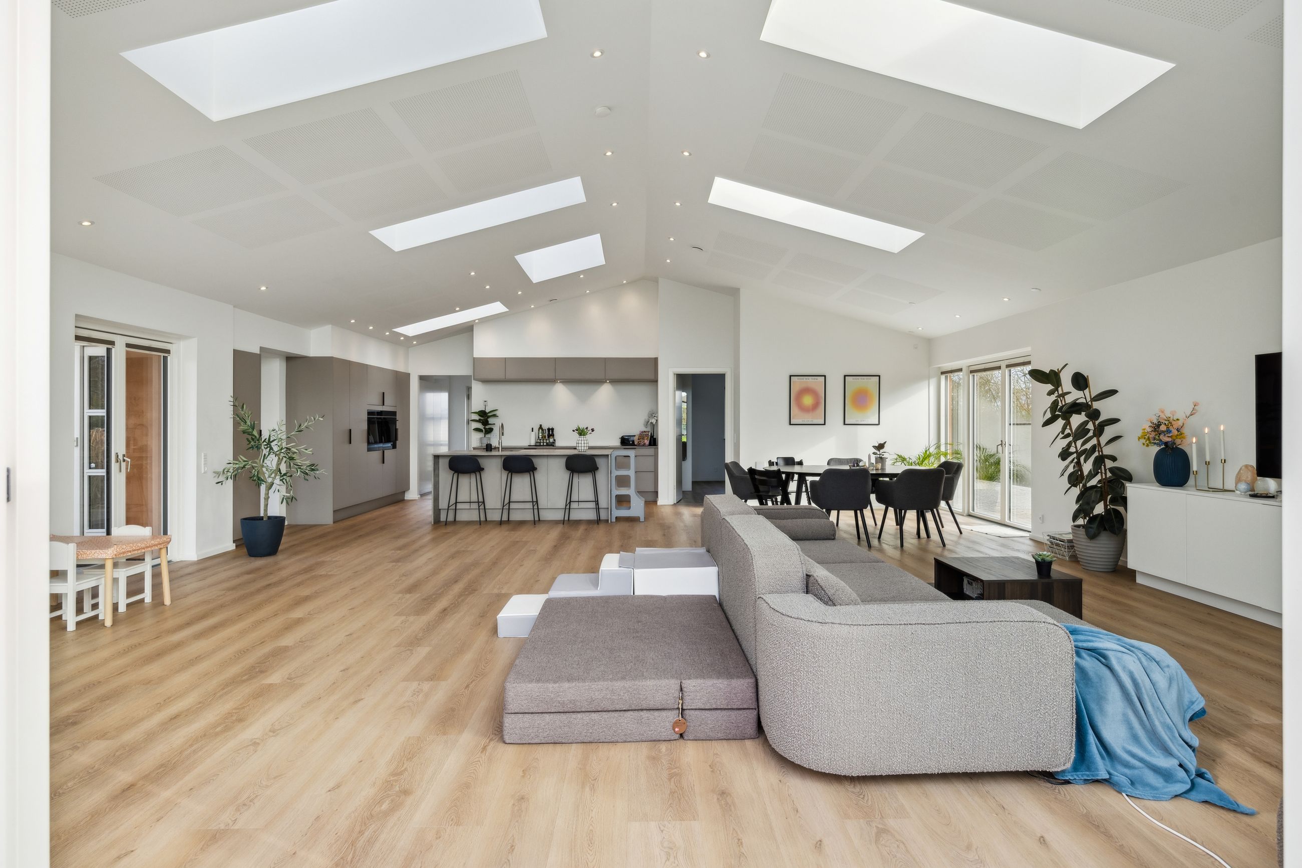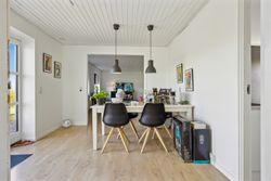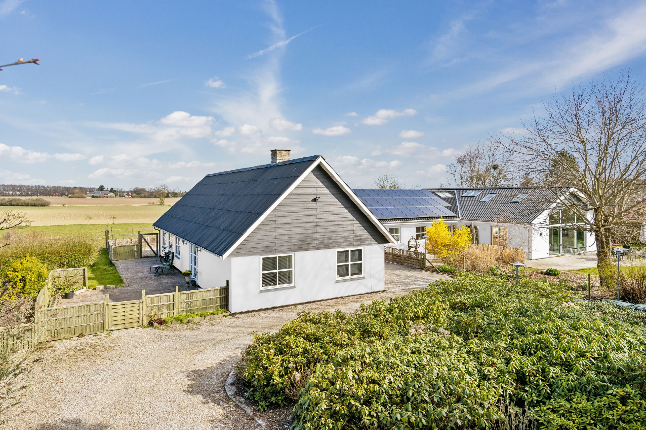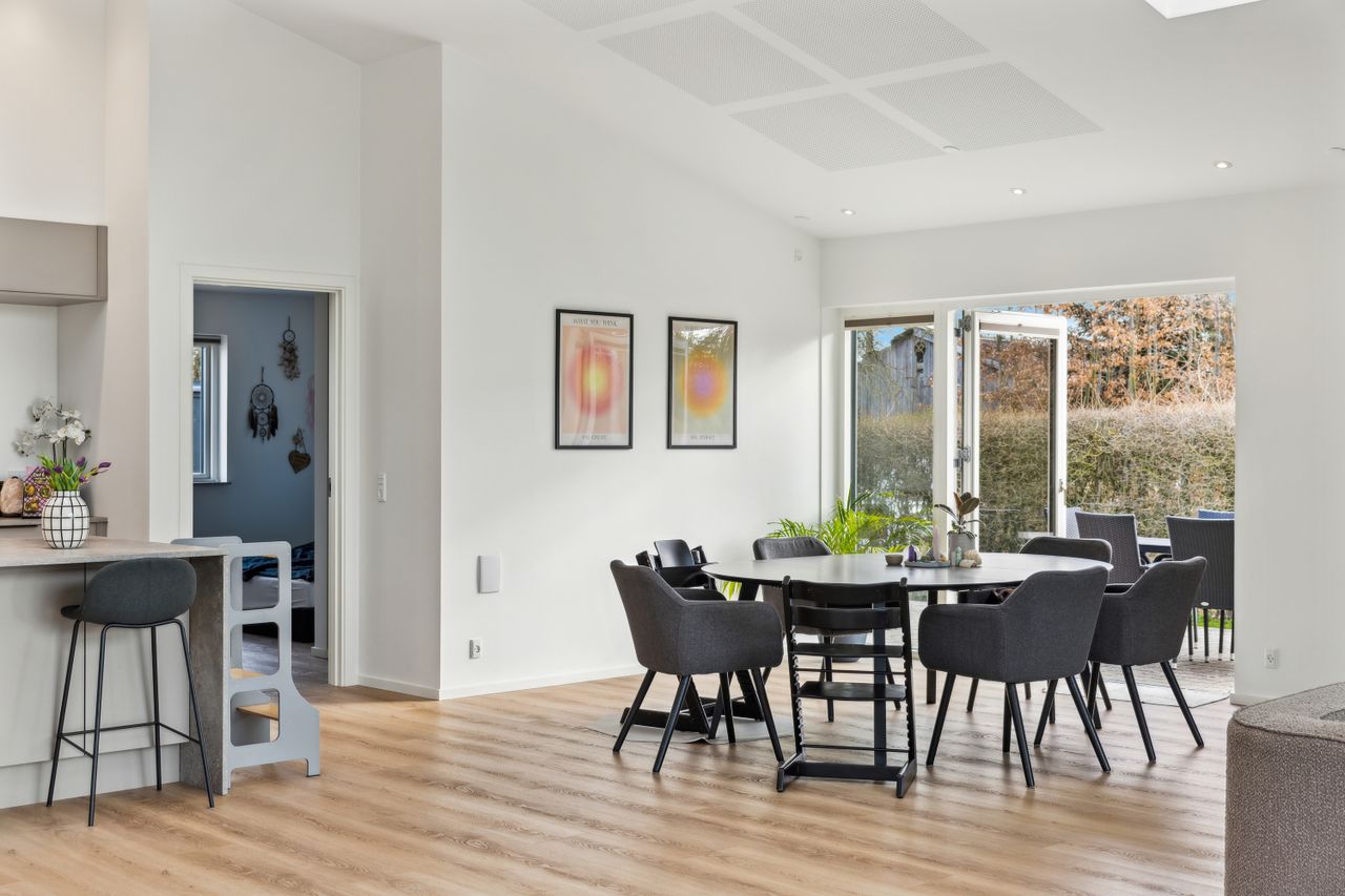 Hovedhuset er indrettet med fokus på rummelighed og lysindfald. Det åbne køkken-alrum imponerer med loft til kip, gulvvarme og flotte indskudte akustikpaneler, der sikrer en behagelig lydoplevelse. Det nye køkken er udstyret med stilfulde elementer og ovenlys, som skaber en lys og indbydende atmosfære. Forældreafdelingen byder på rigelig skabsplads samt eget badeværelse, mens børneafdelingen har tre gode værelser og eget bad – alt sammen udført i en enormt flot finish.
