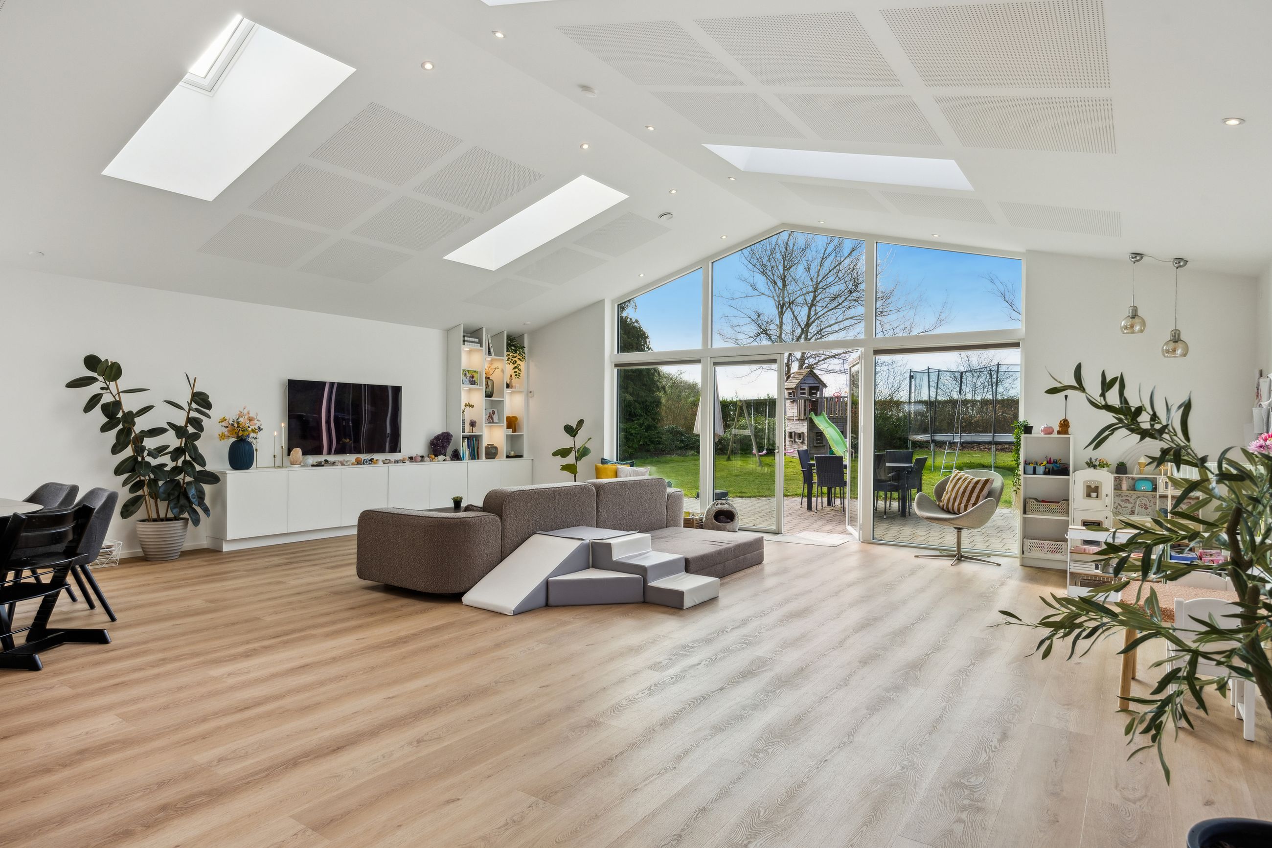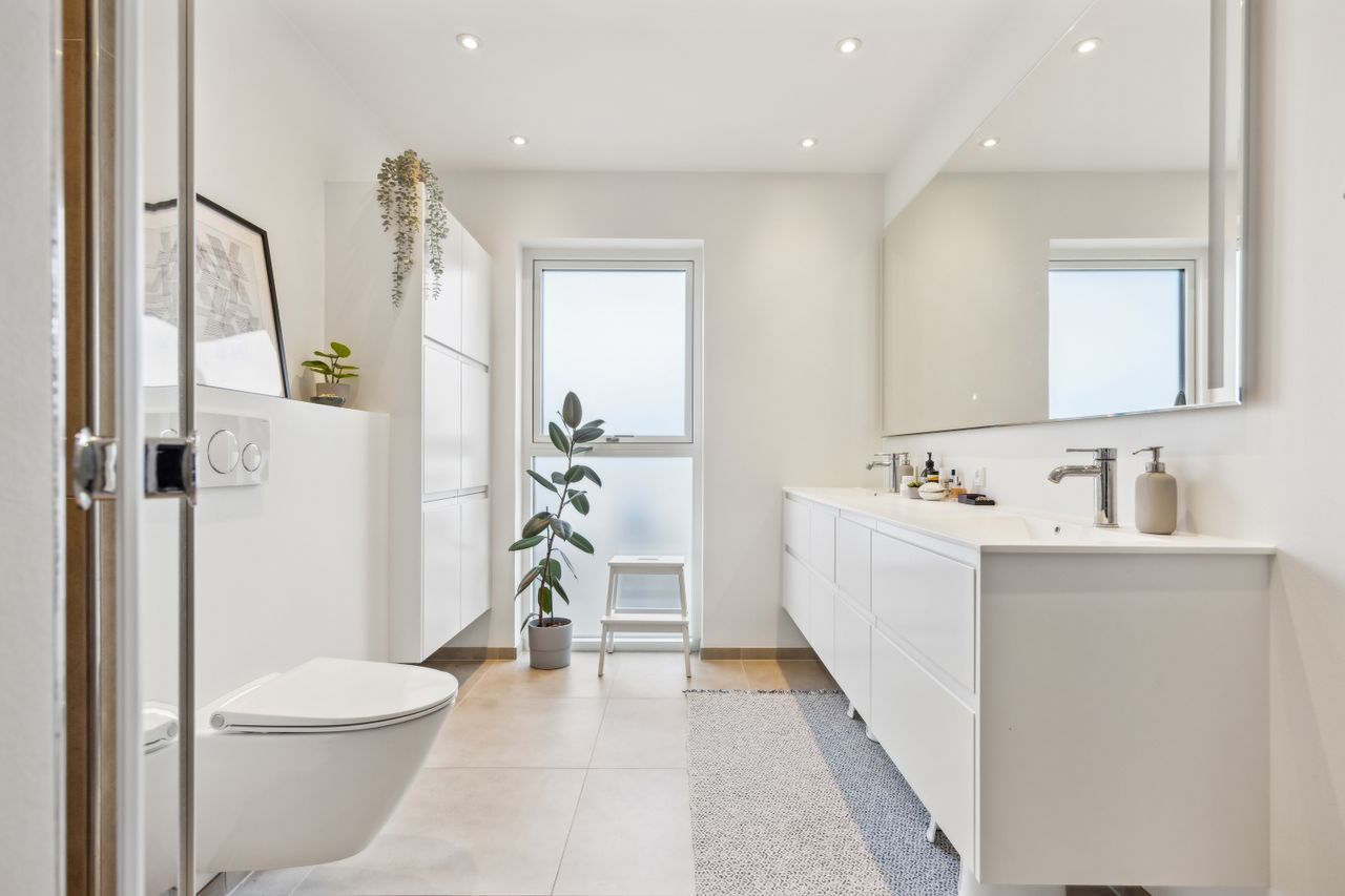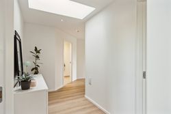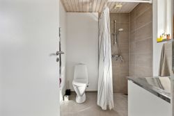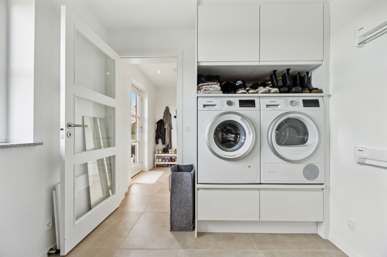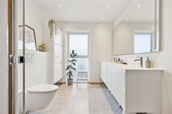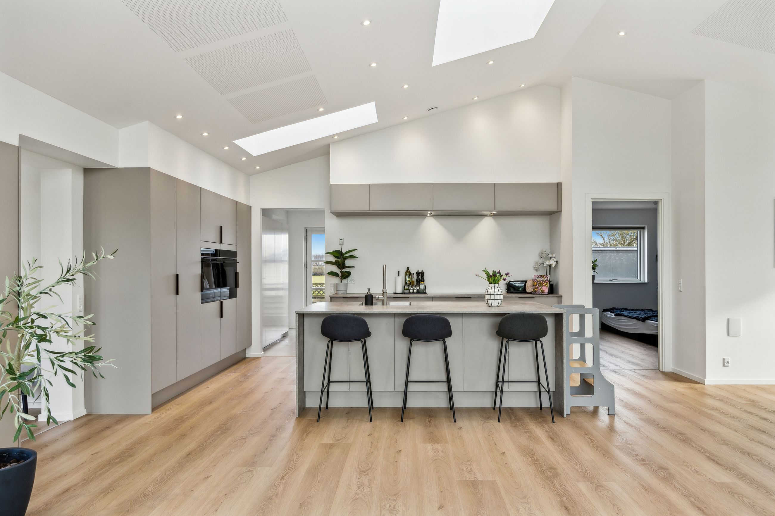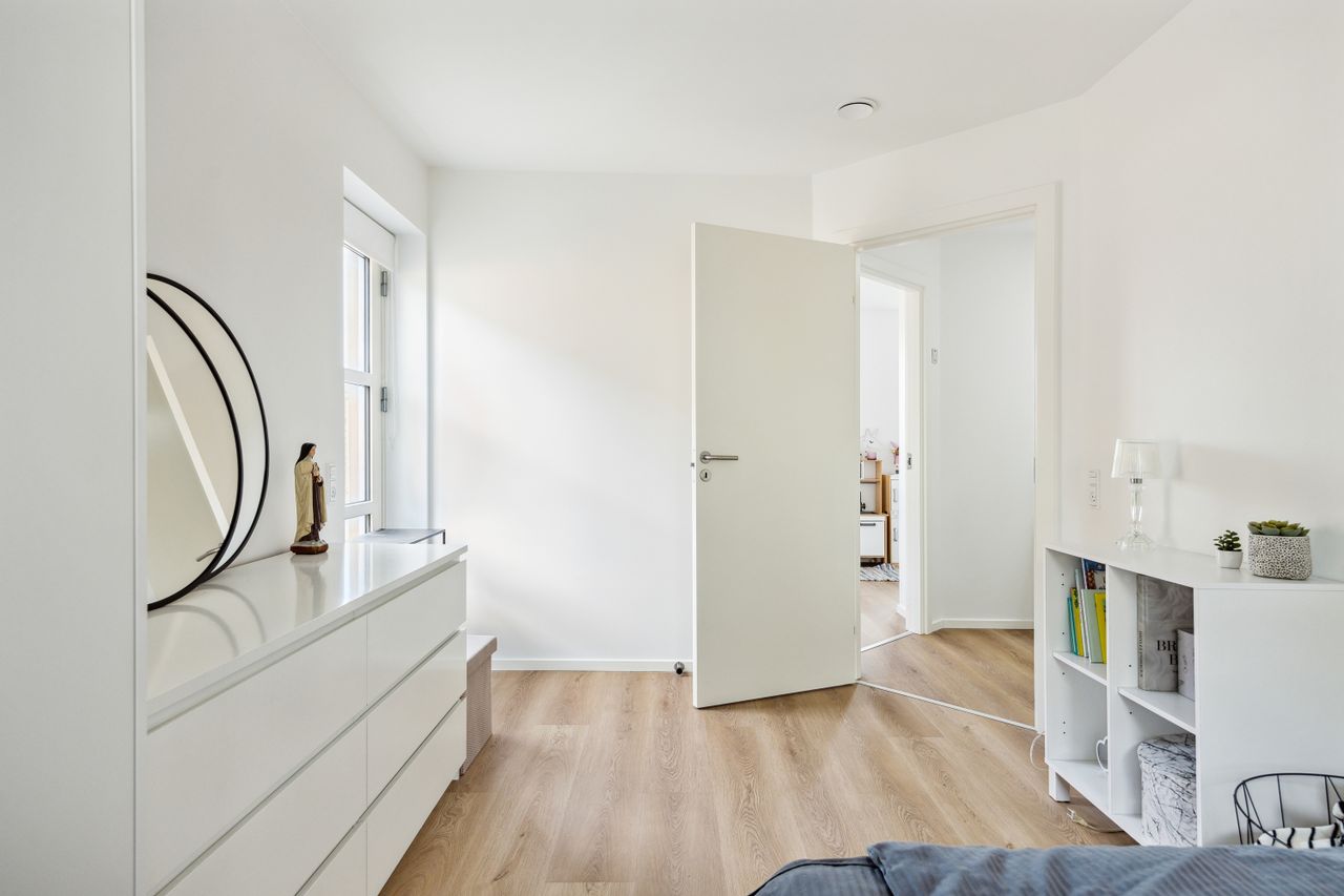 Hovedhuset er indrettet med fokus på rummelighed og lysindfald. Det åbne køkken-alrum imponerer med loft til kip, gulvvarme og flotte indskudte akustikpaneler, der sikrer en behagelig lydoplevelse. Det nye køkken er udstyret med stilfulde elementer og ovenlys, som skaber en lys og indbydende atmosfære. Forældreafdelingen byder på rigelig skabsplads samt eget badeværelse, mens børneafdelingen har tre gode værelser og eget bad – alt sammen udført i en enormt flot finish.
