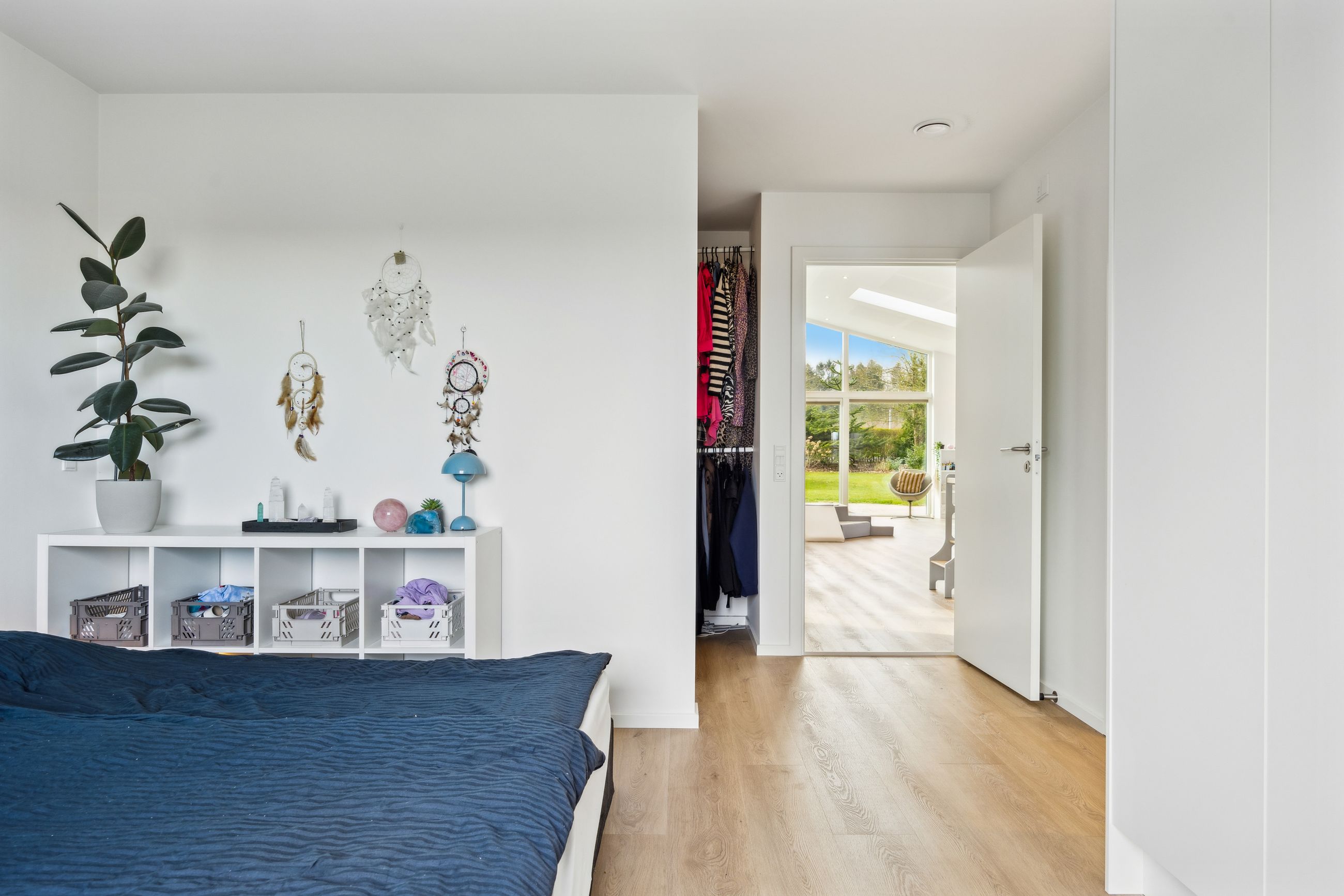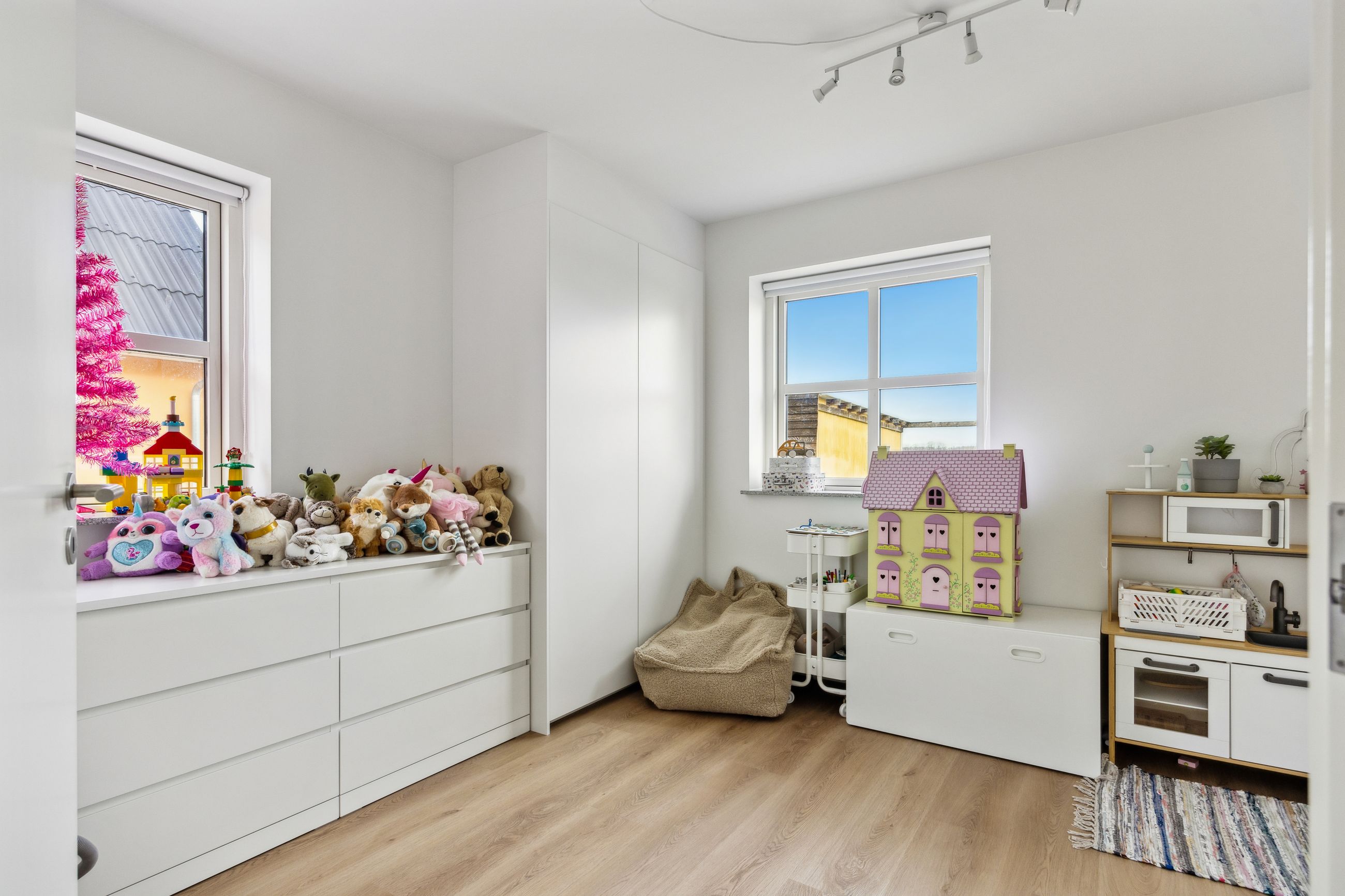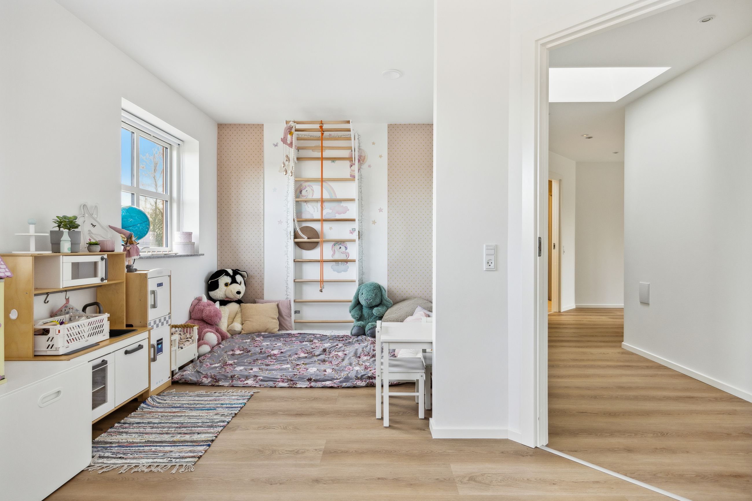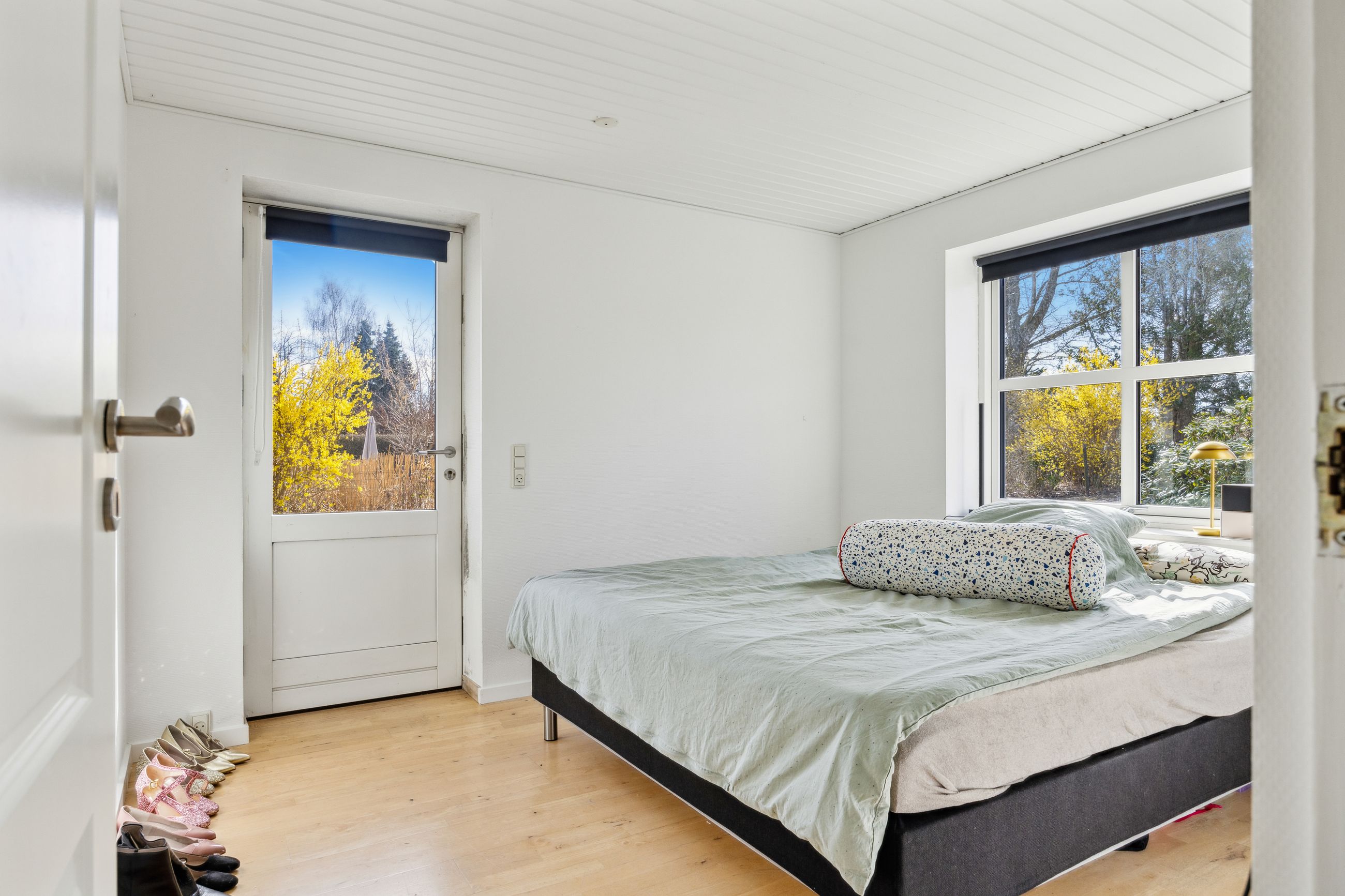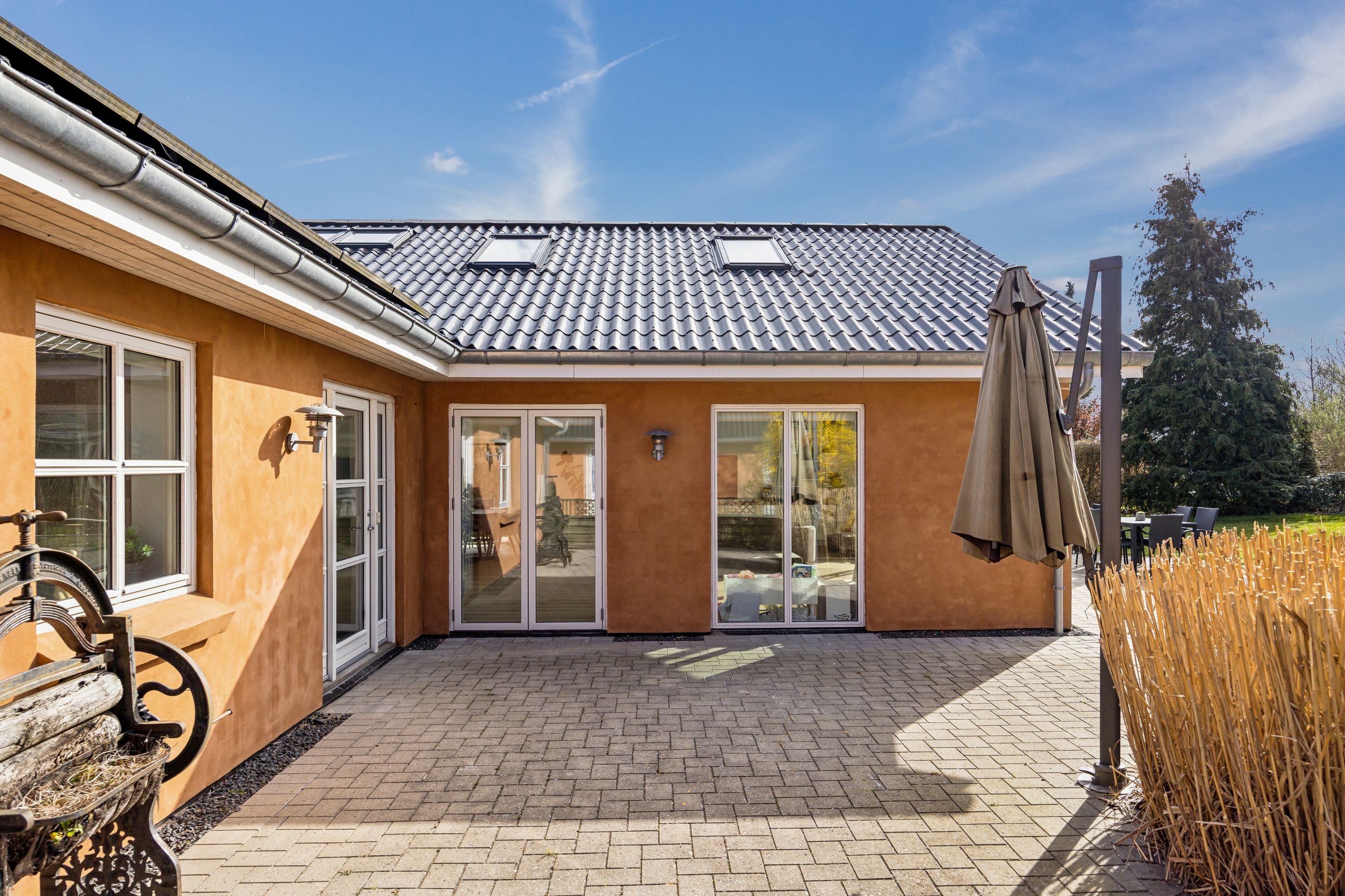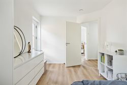 Hovedhuset er indrettet med fokus på rummelighed og lysindfald. Det åbne køkken-alrum imponerer med loft til kip, gulvvarme og flotte indskudte akustikpaneler, der sikrer en behagelig lydoplevelse. Det nye køkken er udstyret med stilfulde elementer og ovenlys, som skaber en lys og indbydende atmosfære. Forældreafdelingen byder på rigelig skabsplads samt eget badeværelse, mens børneafdelingen har tre gode værelser og eget bad – alt sammen udført i en enormt flot finish.