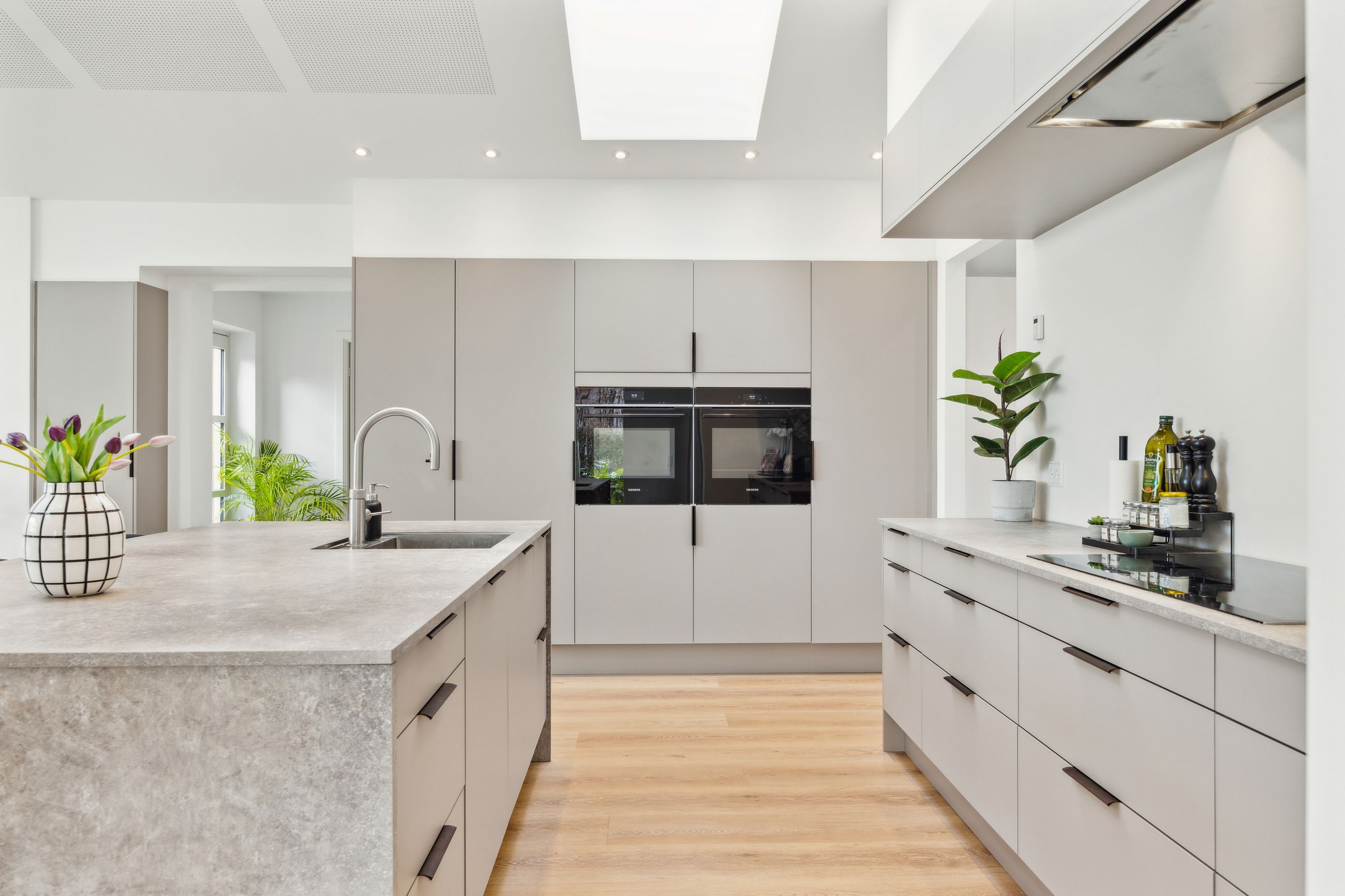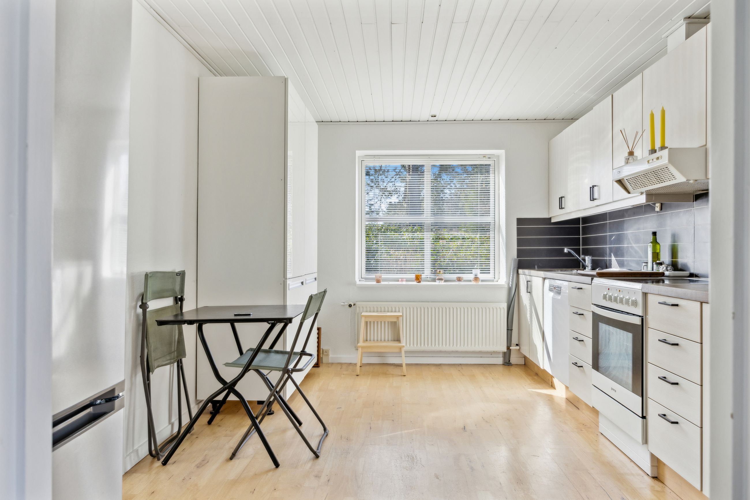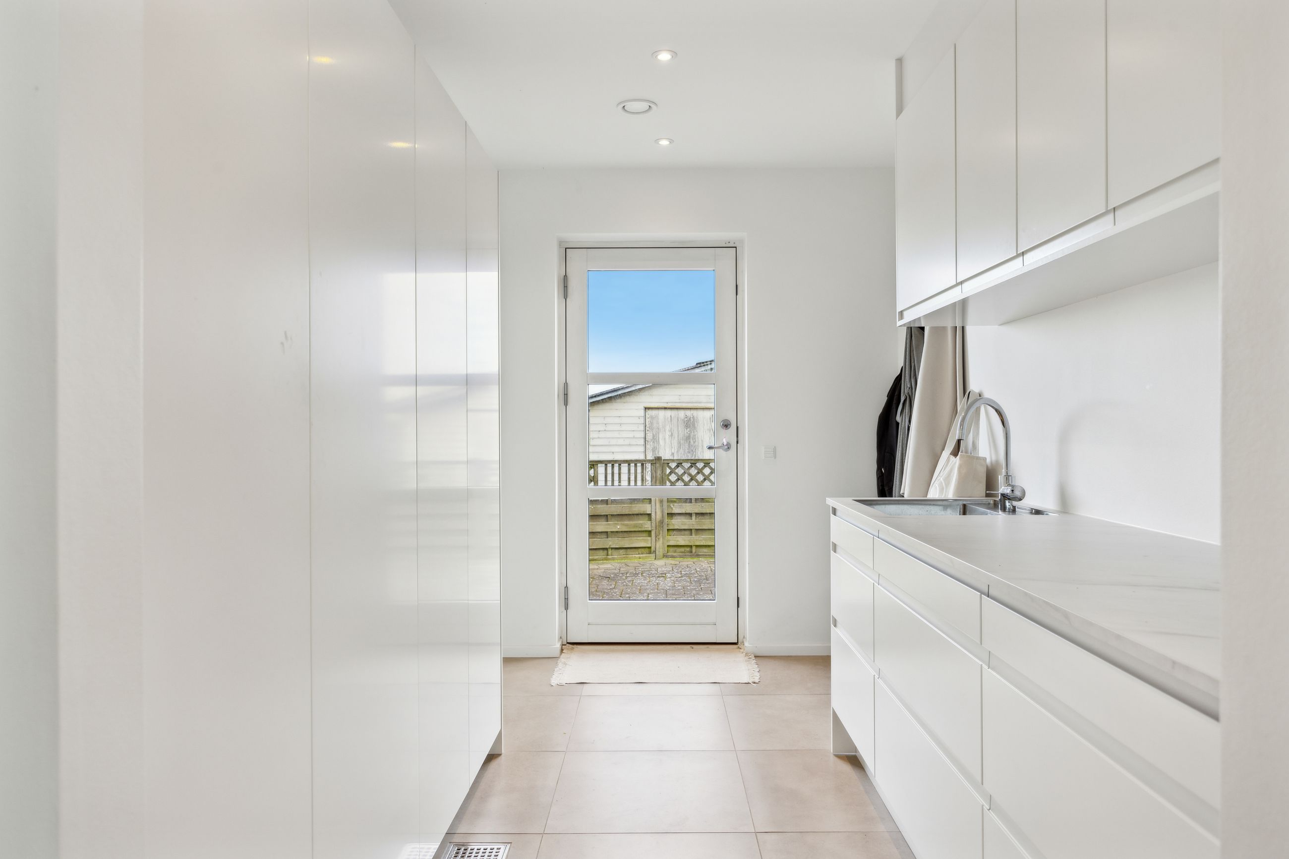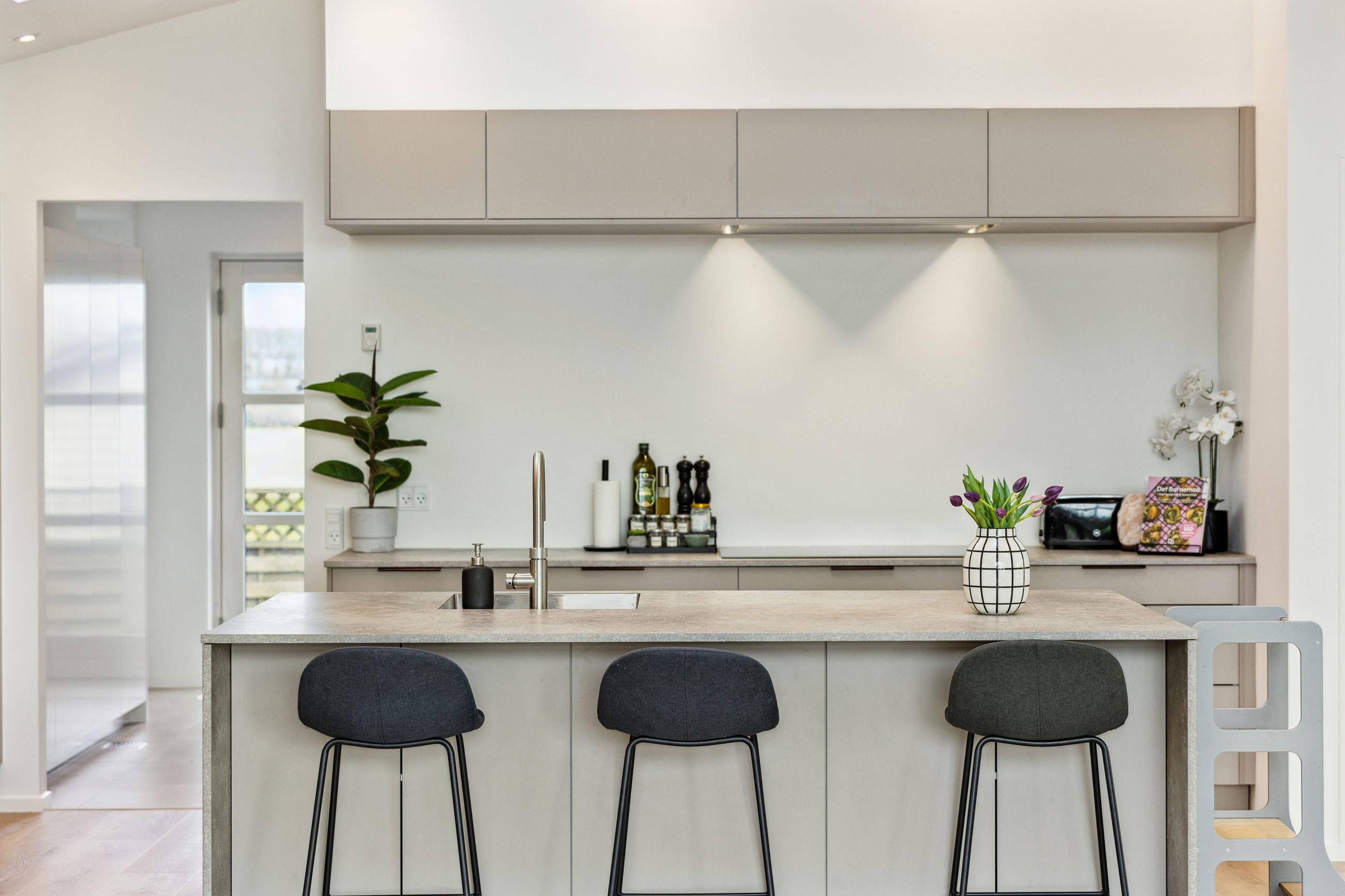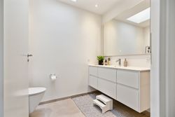 Hovedhuset er indrettet med fokus på rummelighed og lysindfald. Det åbne køkken-alrum imponerer med loft til kip, gulvvarme og flotte indskudte akustikpaneler, der sikrer en behagelig lydoplevelse. Det nye køkken er udstyret med stilfulde elementer og ovenlys, som skaber en lys og indbydende atmosfære. Forældreafdelingen byder på rigelig skabsplads samt eget badeværelse, mens børneafdelingen har tre gode værelser og eget bad – alt sammen udført i en enormt flot finish.
