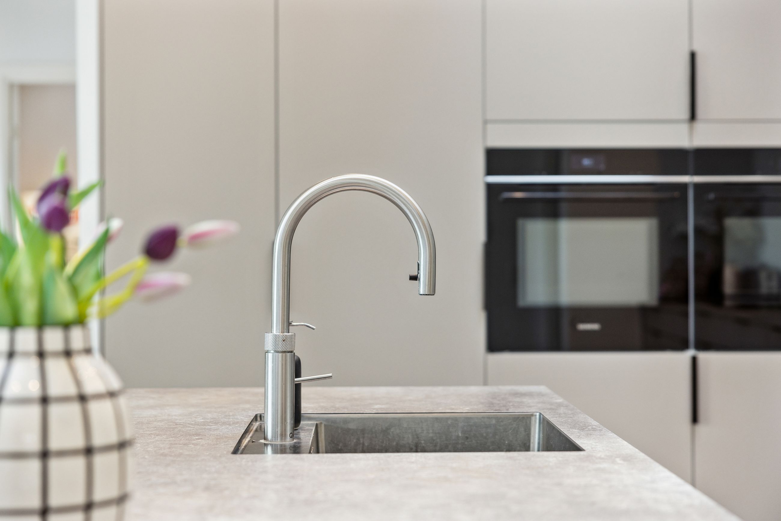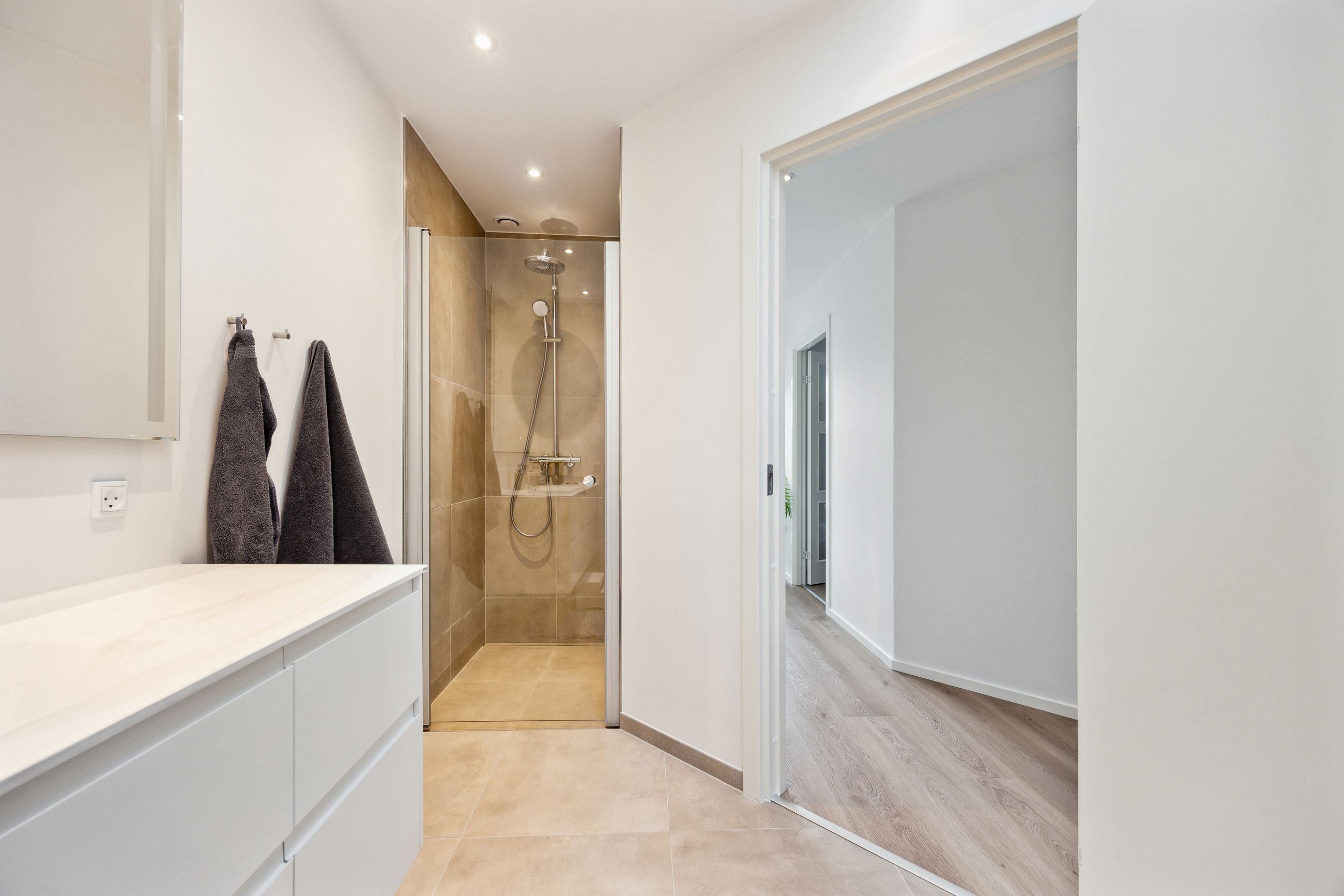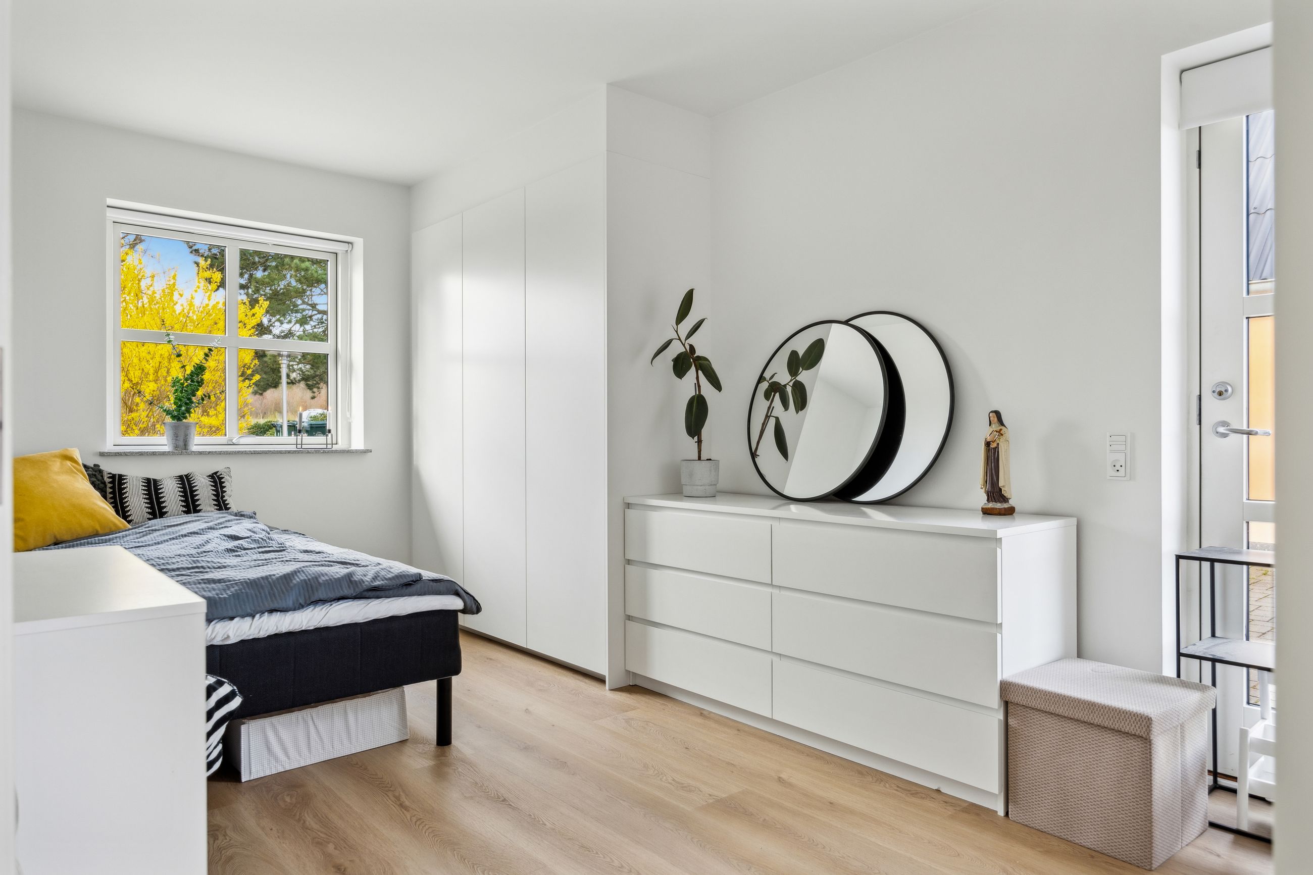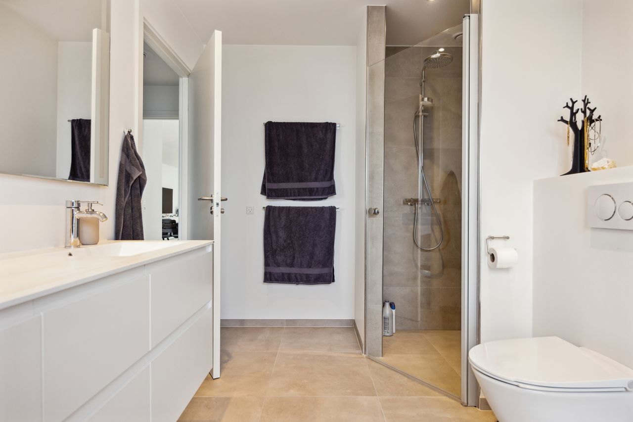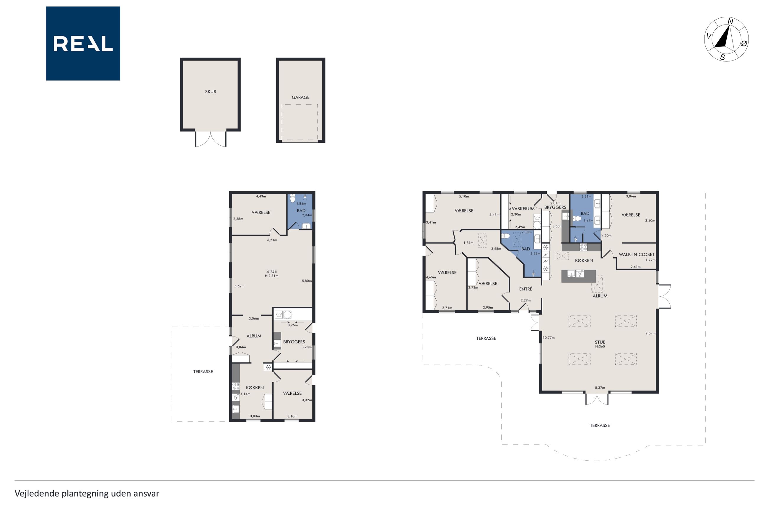 Hovedhuset er indrettet med fokus på rummelighed og lysindfald. Det åbne køkken-alrum imponerer med loft til kip, gulvvarme og flotte indskudte akustikpaneler, der sikrer en behagelig lydoplevelse. Det nye køkken er udstyret med stilfulde elementer og ovenlys, som skaber en lys og indbydende atmosfære. Forældreafdelingen byder på rigelig skabsplads samt eget badeværelse, mens børneafdelingen har tre gode værelser og eget bad – alt sammen udført i en enormt flot finish.
