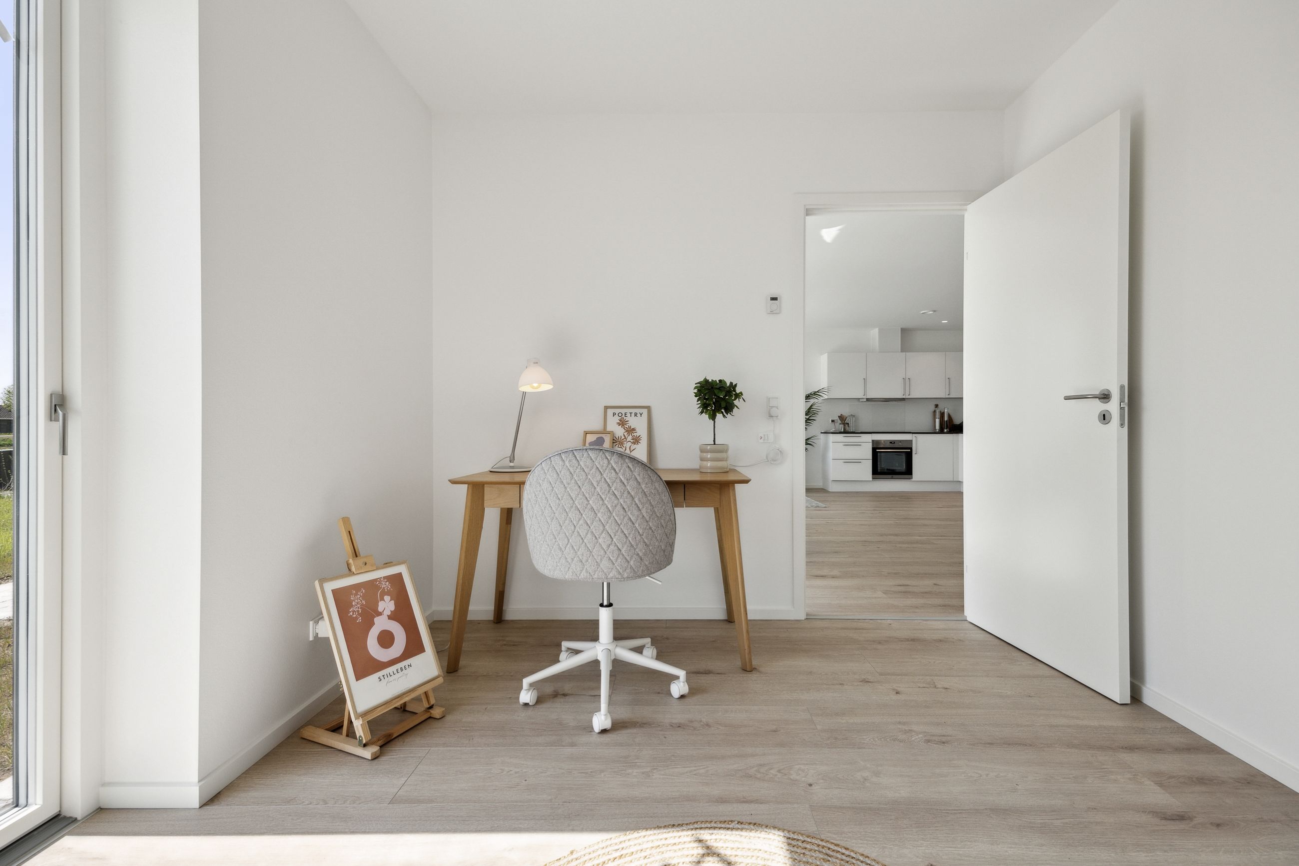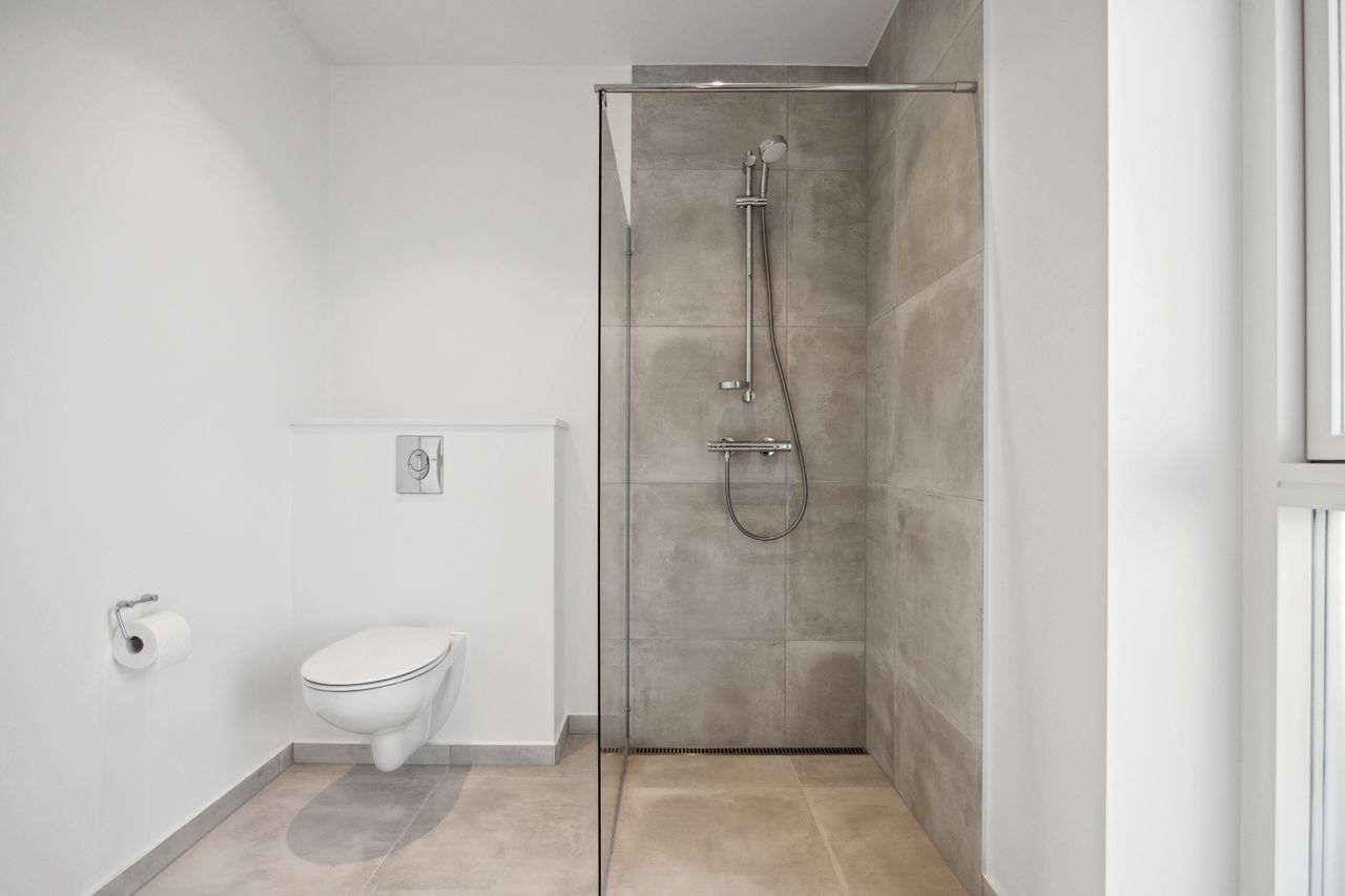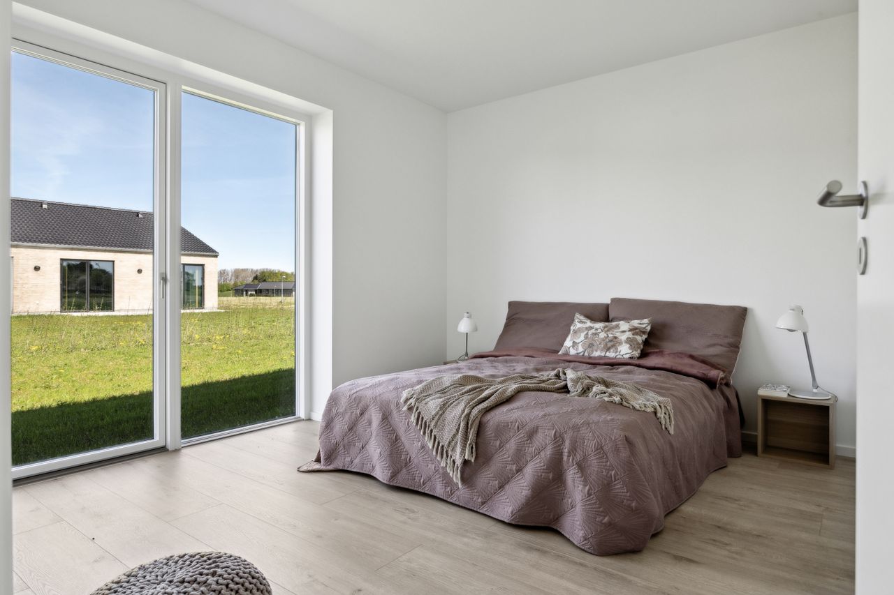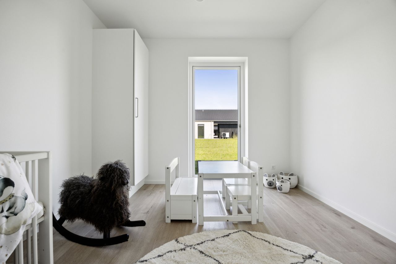 Boligen rummer tre gode værelser, som alle har adgang til haven via døre direkte fra rummene – perfekt for dem der elsker at lade naturen blive en del af hjemmet. Badeværelset er elegant udført i grå fliser og tilbyder både funktionalitet og stil.