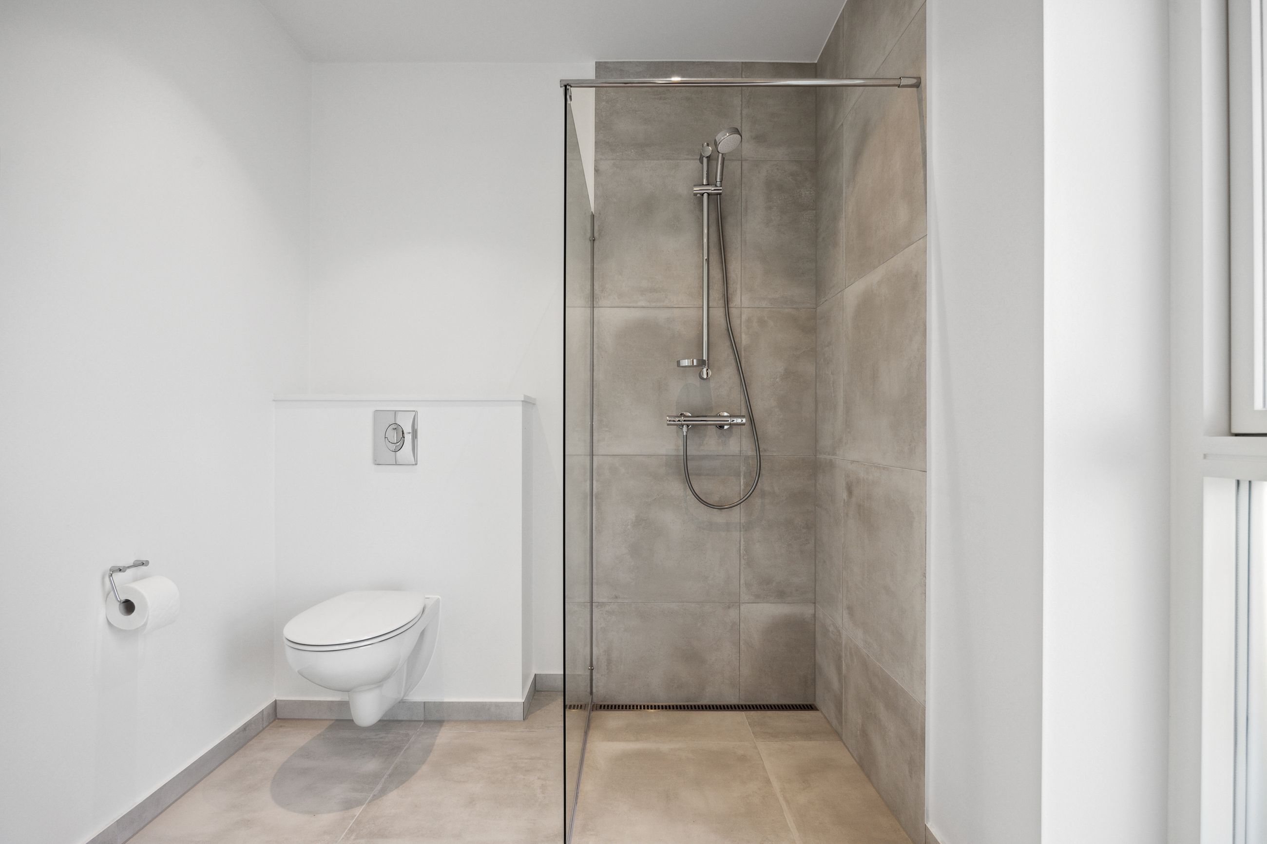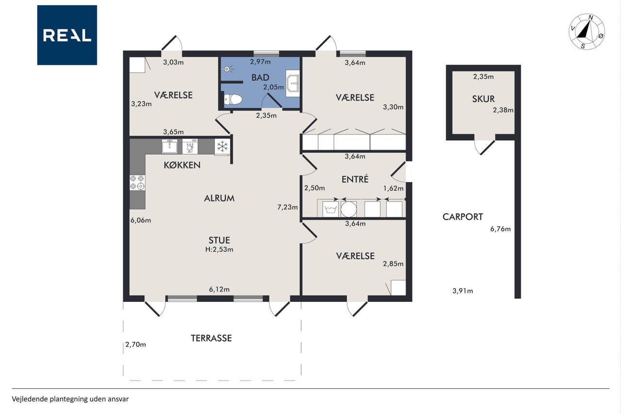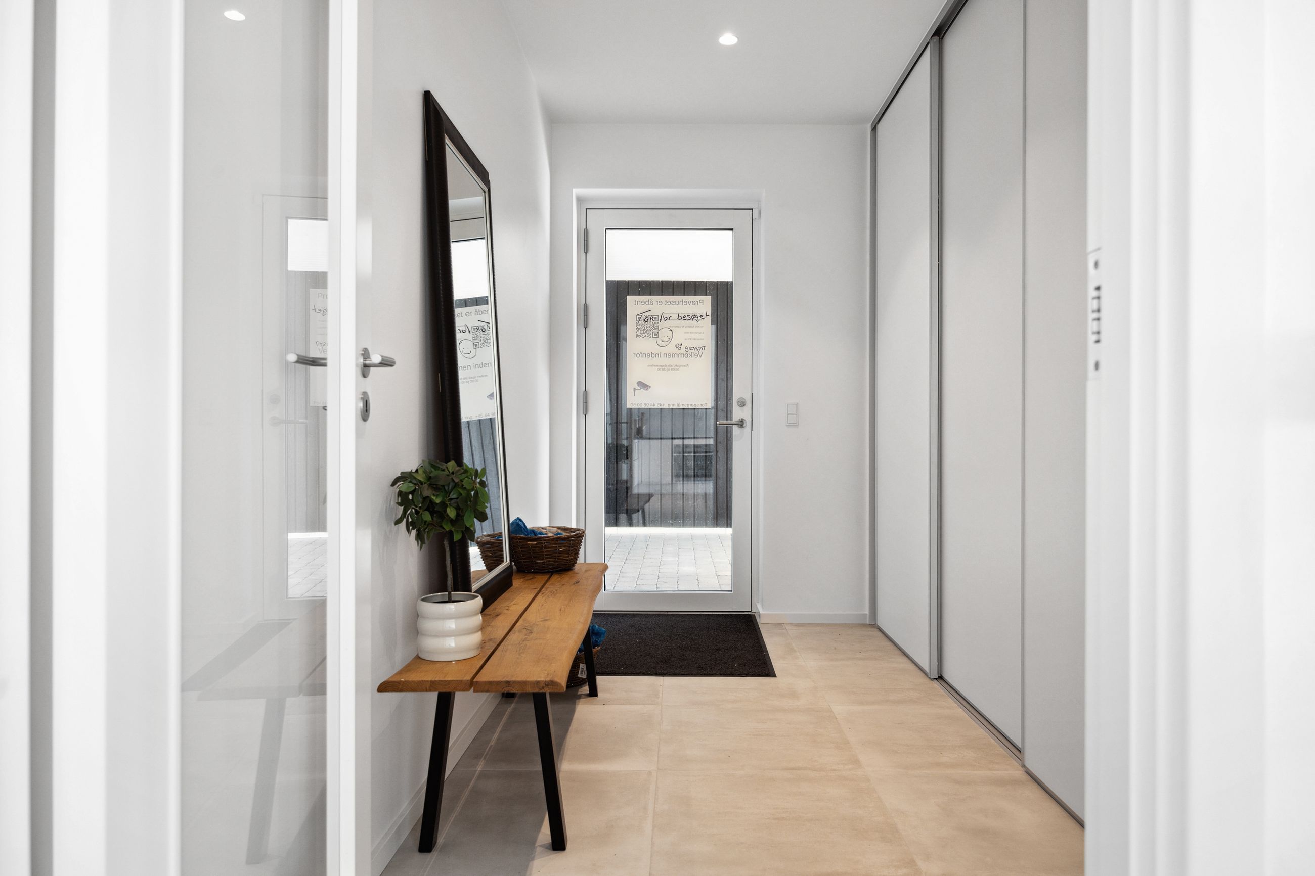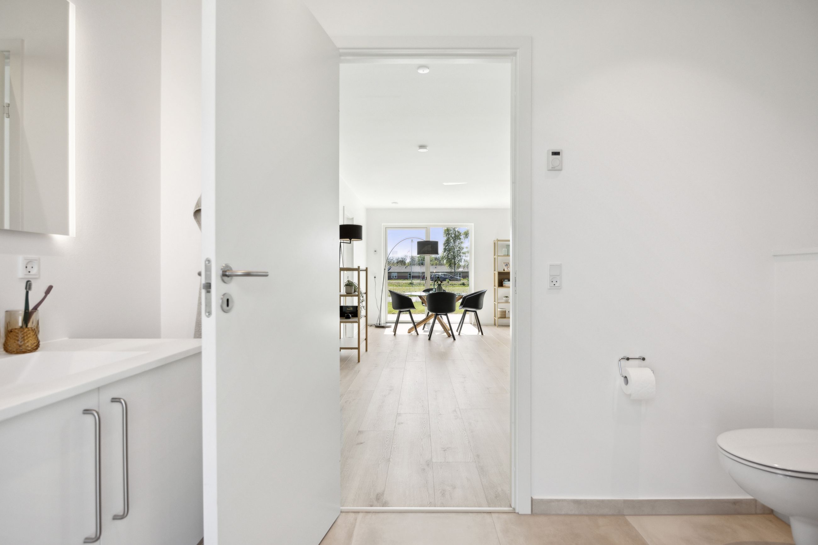 Boligen rummer tre gode værelser, som alle har adgang til haven via døre direkte fra rummene – perfekt for dem der elsker at lade naturen blive en del af hjemmet. Badeværelset er elegant udført i grå fliser og tilbyder både funktionalitet og stil.