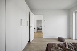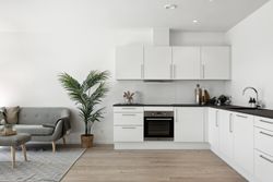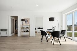 Indenfor mødes du af en stor entré, hvor der er rigelig plads til opbevaring samt en praktisk vaskesøjle. Det åbne køkken-alrum er husets hjerte; her strømmer lyset ind gennem store vinduespartier, som også giver adgang til udearealet fra alle rum. Køkkenet fra HTH fremstår stilrent med hvide elementer og plankegulve, der fortsætter igennem hele huset.