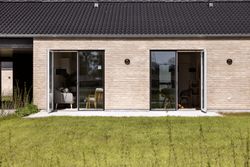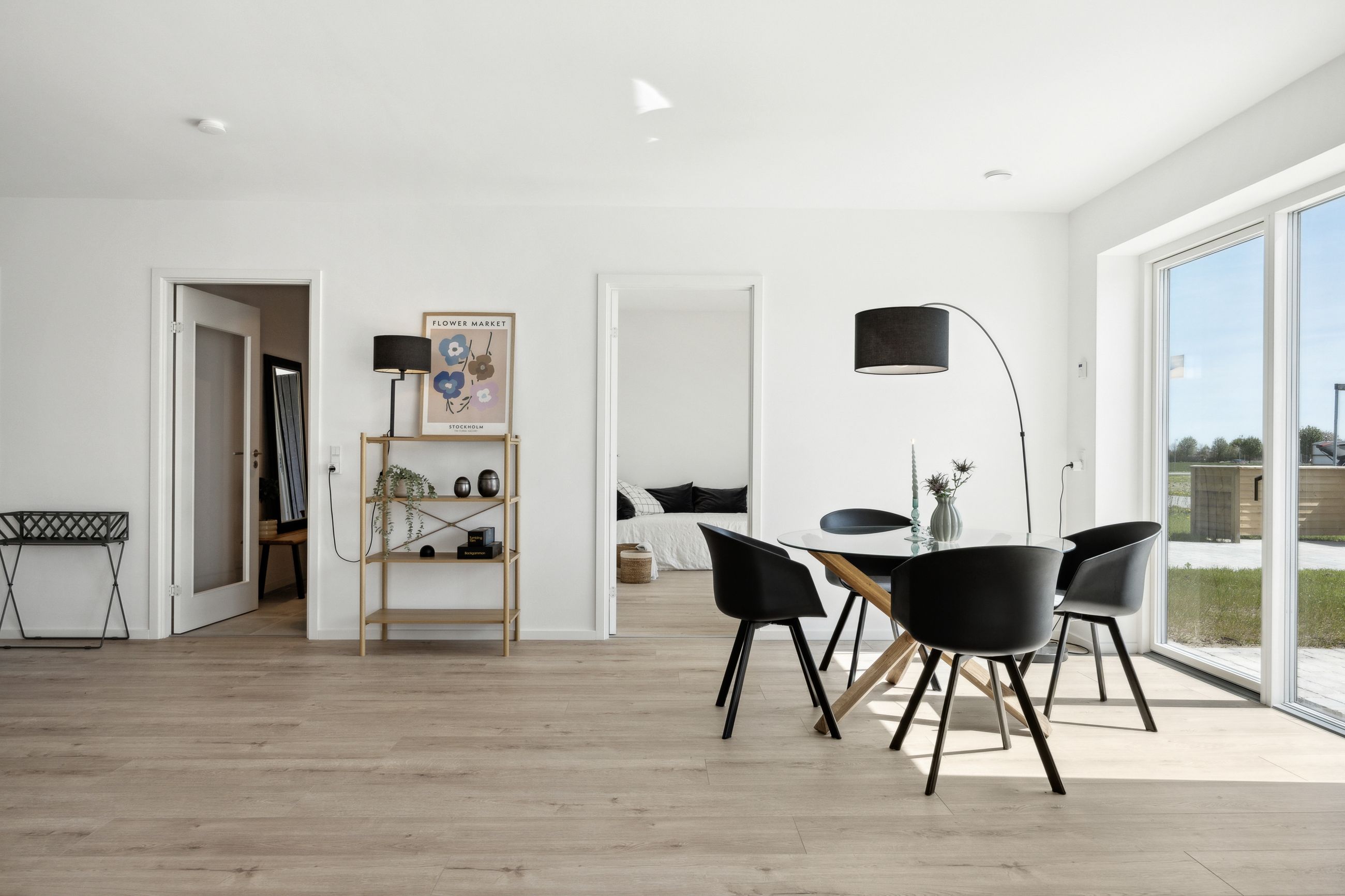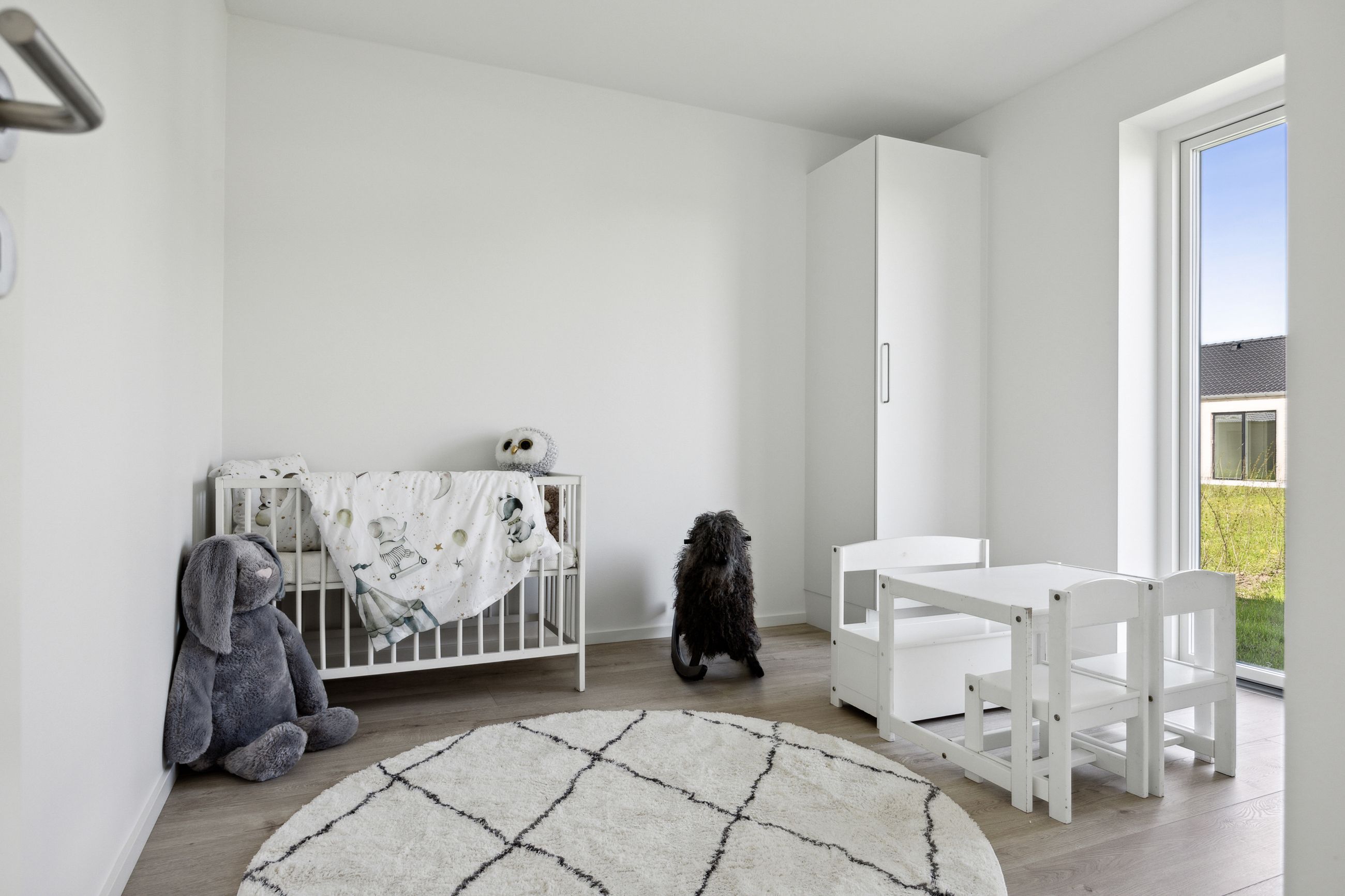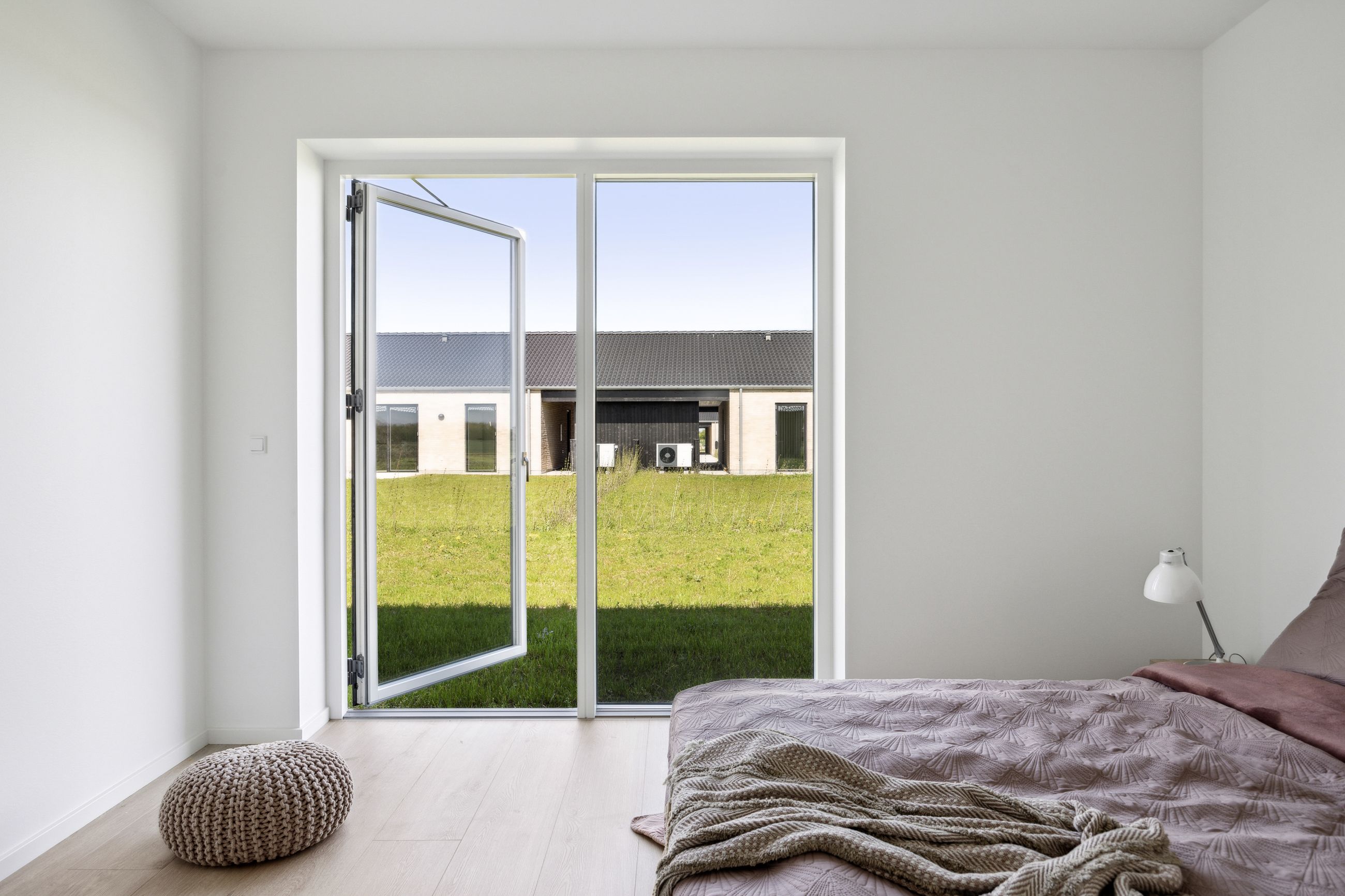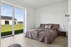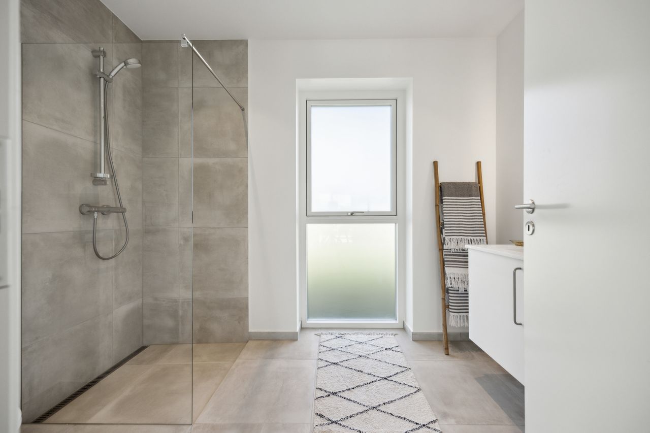 Boligen rummer tre gode værelser, som alle har adgang til haven via døre direkte fra rummene – perfekt for dem der elsker at lade naturen blive en del af hjemmet. Badeværelset er elegant udført i grå fliser og tilbyder både funktionalitet og stil.