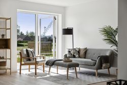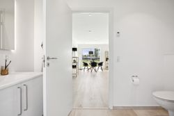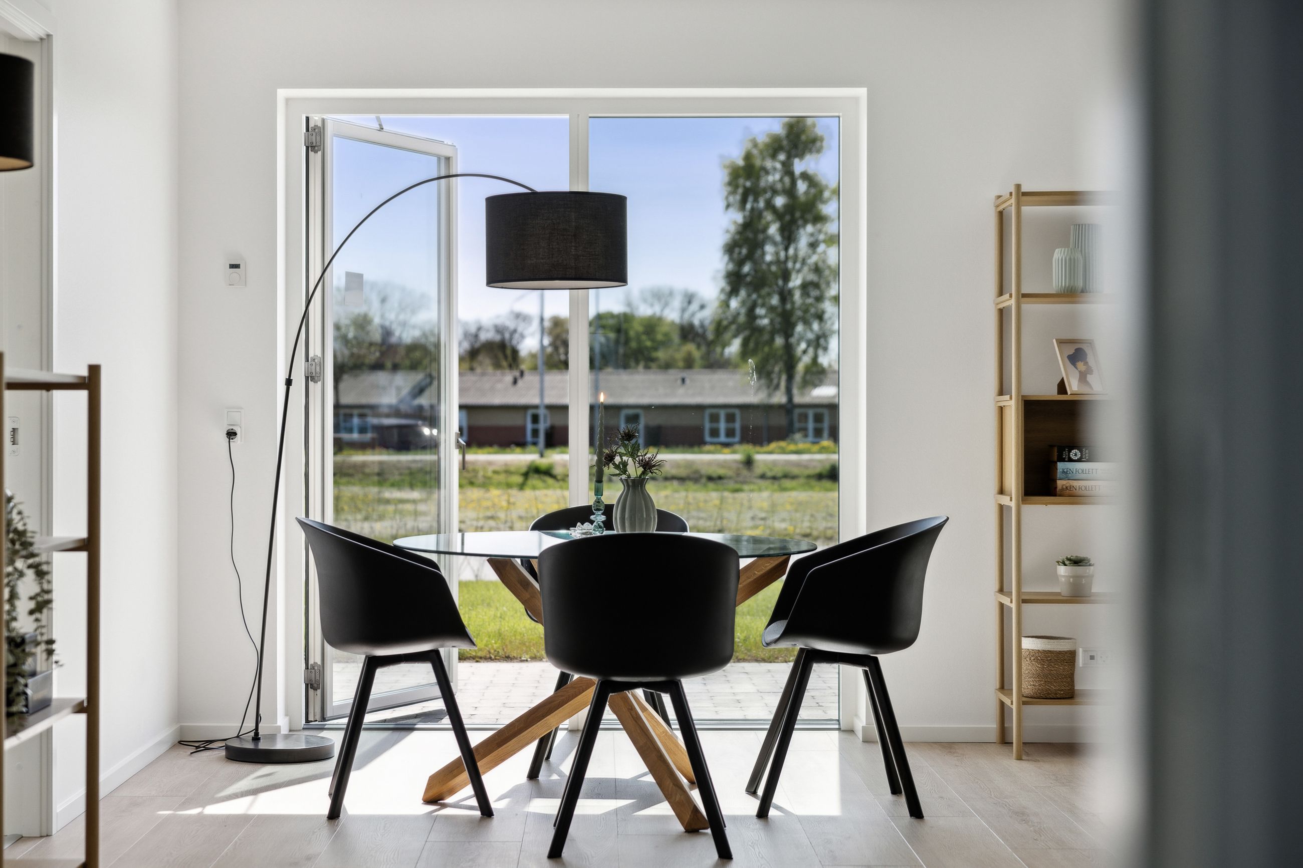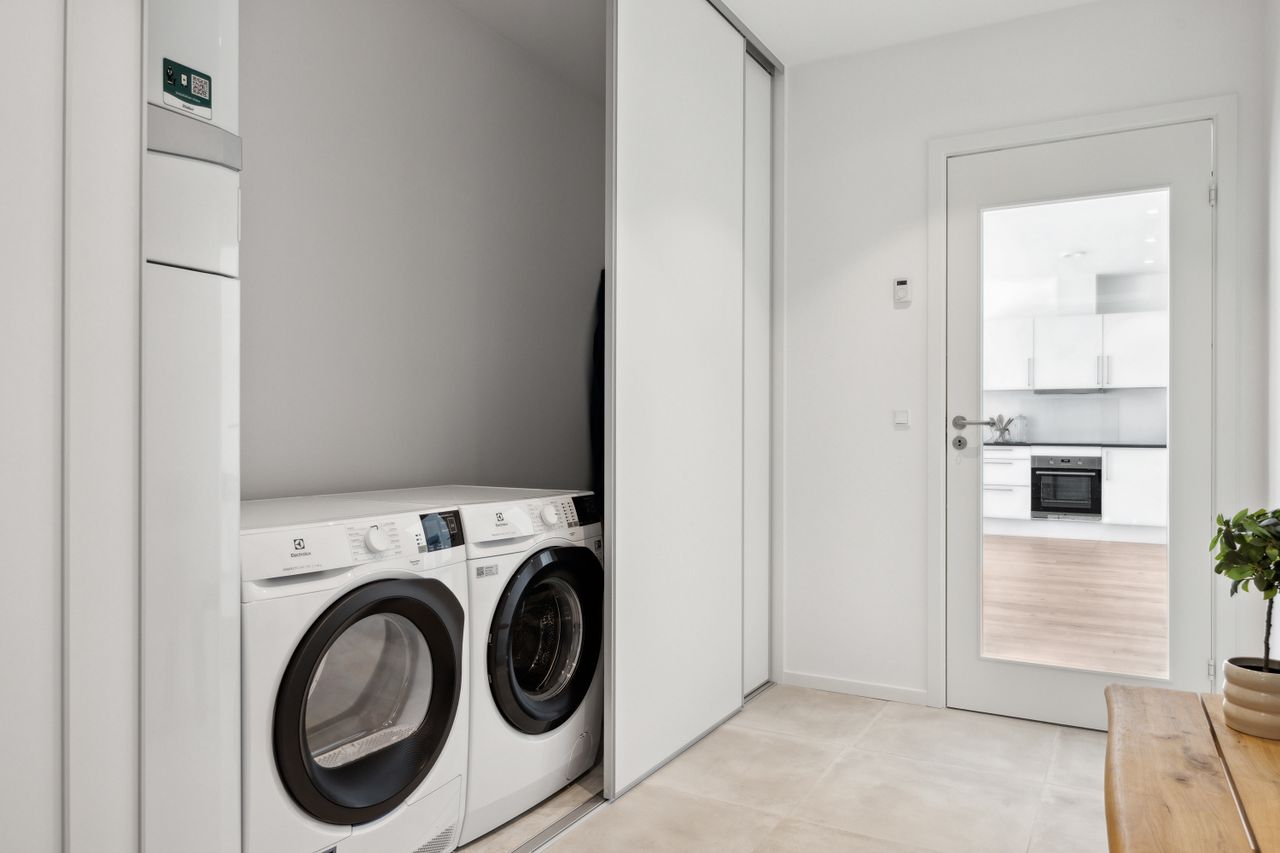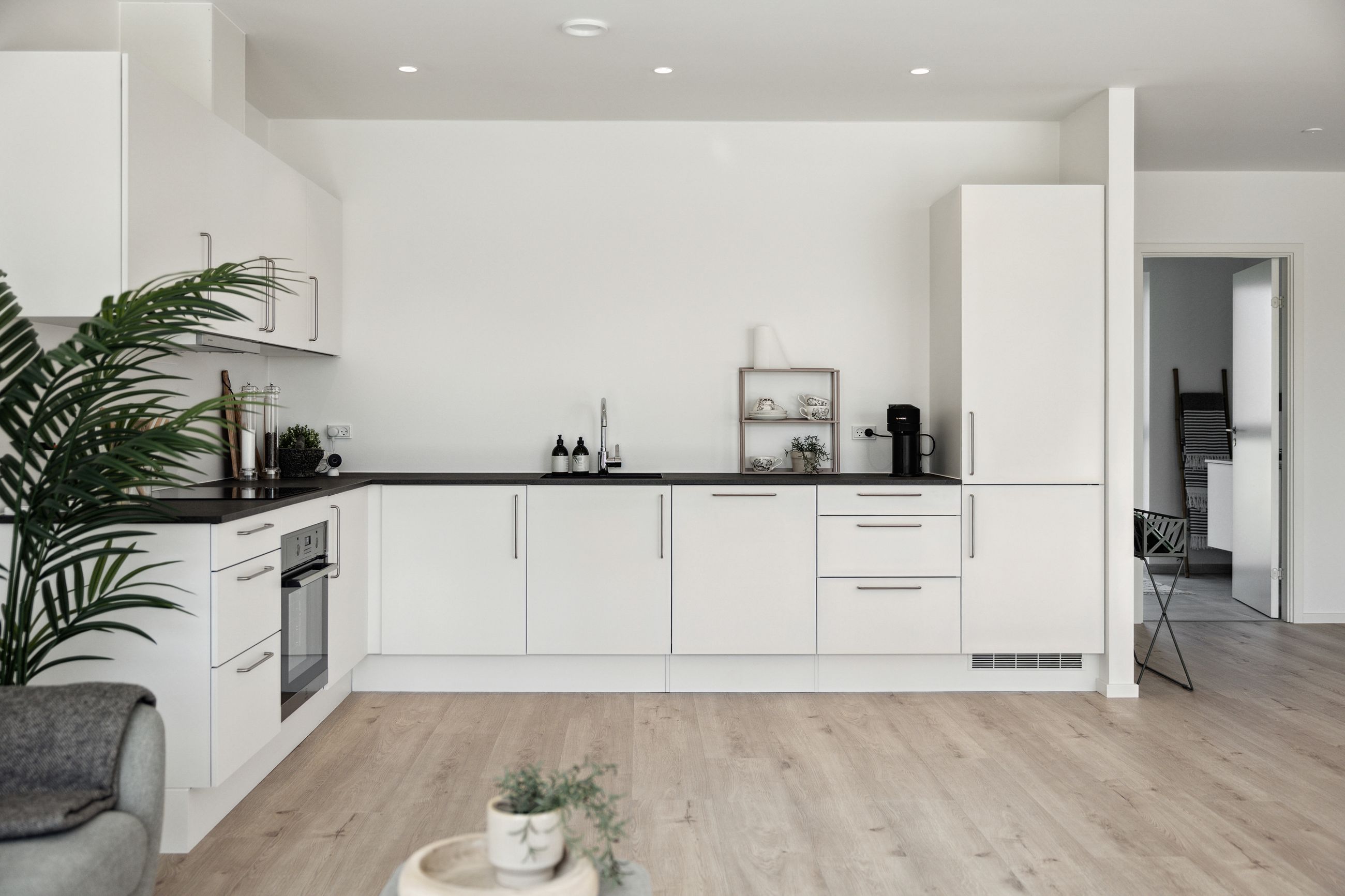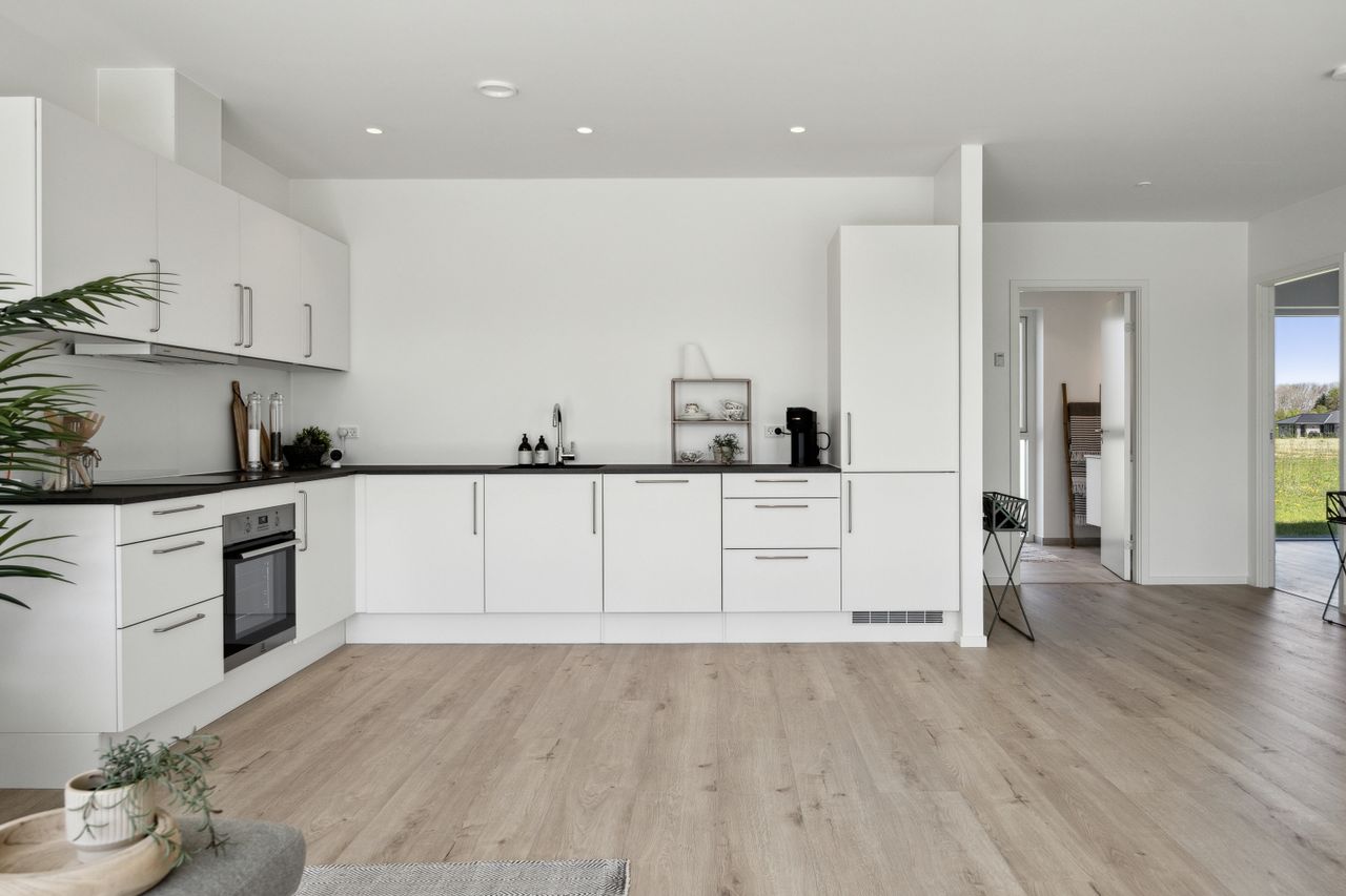 Indenfor mødes du af en stor entré, hvor der er rigelig plads til opbevaring samt en praktisk vaskesøjle. Det åbne køkken-alrum er husets hjerte; her strømmer lyset ind gennem store vinduespartier, som også giver adgang til udearealet fra alle rum. Køkkenet fra HTH fremstår stilrent med hvide elementer og plankegulve, der fortsætter igennem hele huset.